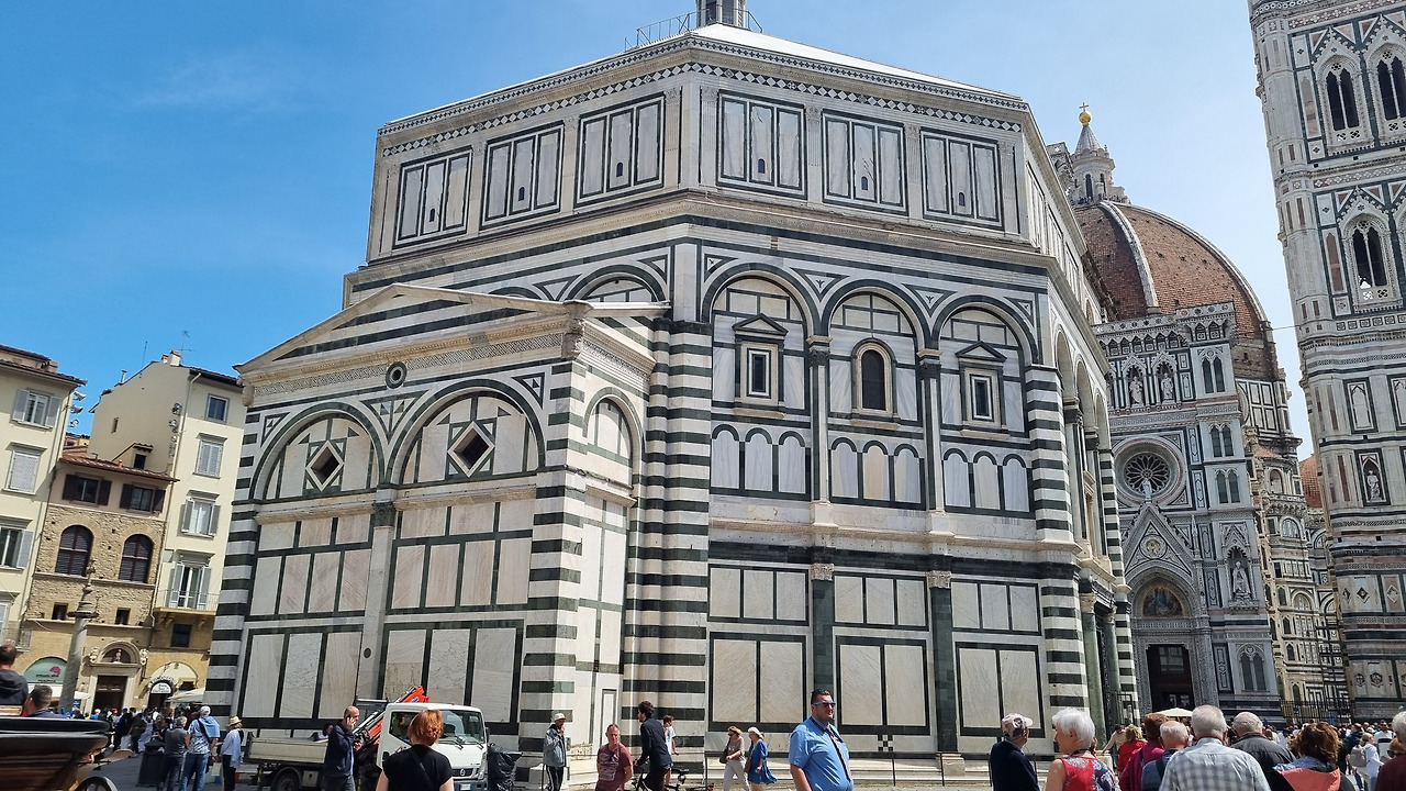 어렵게 트램 표를 끊어 목적지 정거장에 도착했다. 벌써 관광객들이 붐빈다. 여기서 700미터를 걸어가야 한다. 10여분 걸으니 골목길 사이로 녹색빛이 은은히 도는 대리석으로 만든 건물 일부가 보인다. 조금 더 걸으니 넓은 광장이 나오고, 조금 전에 보았던 아름다운 대리석 건물 전체가 보인다. 산 조반니 세례당(Battistero di San Giovanni)으로서, 이 세례당은 피렌체에서 가장 오래된 종교 건축물이라 한다. 세례당 뒤쪽에는 세례당과 같은 재질의 높은 석탑이 서있는데 '조토의 종탑'(Campanile di Giotto)이라 한다. 조토는 산 조반니 세례당의 내부 장식을 담당한 사람이라 한다.
