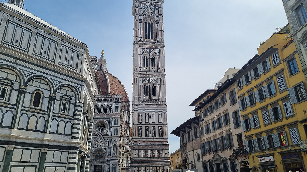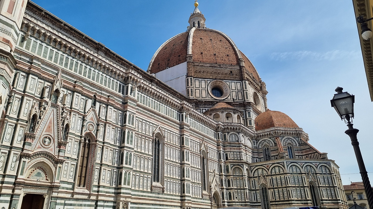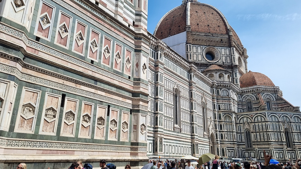 산 죠반니 세례당 뒤에 역시 옅은 녹색 기운이 도는 흰 대리석으로 지은 큰 건물이 보인다. 바로 피렌체의 랜드마크라 할 피렌체 대성당이다. 산 죠반니 세례당 쪽에서는 건물의 많은 부분이 가려 잘 안 보였는데, 옆으로 돌아가니 건물의 위용이 보인다. 우선 규모부터 입이 쩍 벌어질 정도로 크다. 독일에서 뮌헨 대성당을 보고 그 엄청난 크기에 놀랐지만, 그건 피렌체 대성당과 비교한다면 아무것도 아니다. 정말 어마어마한 크기이다.