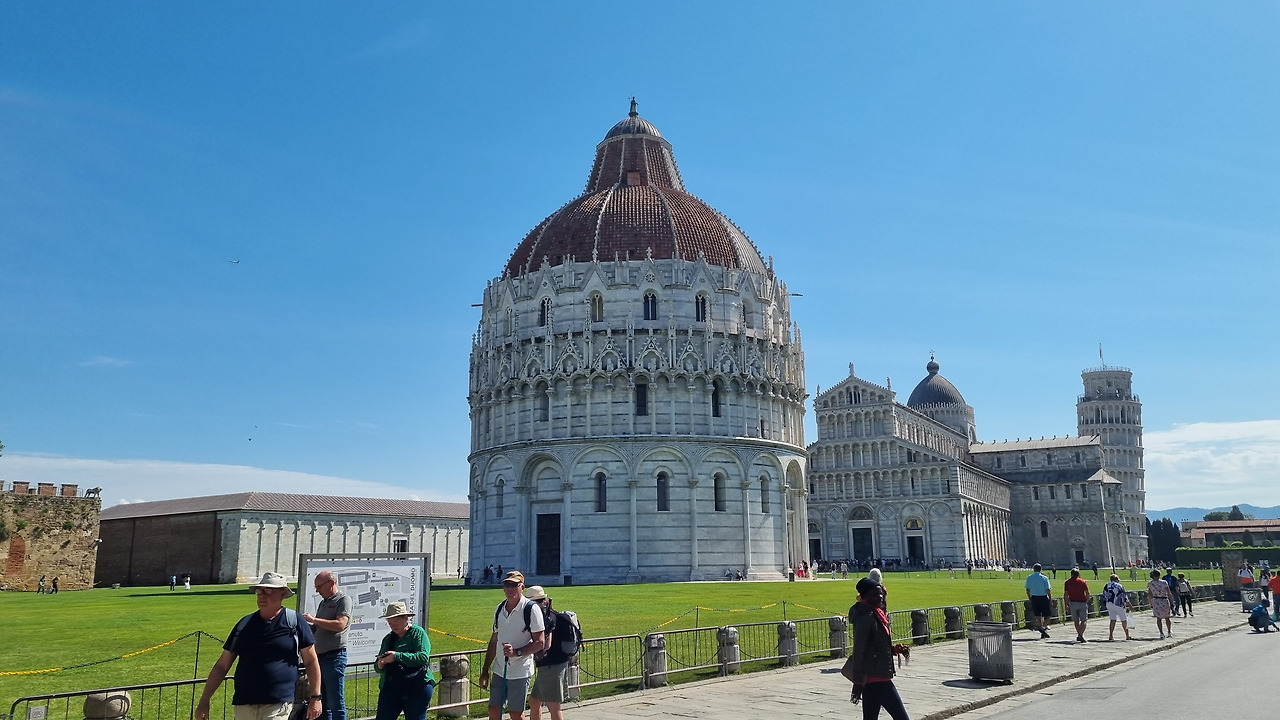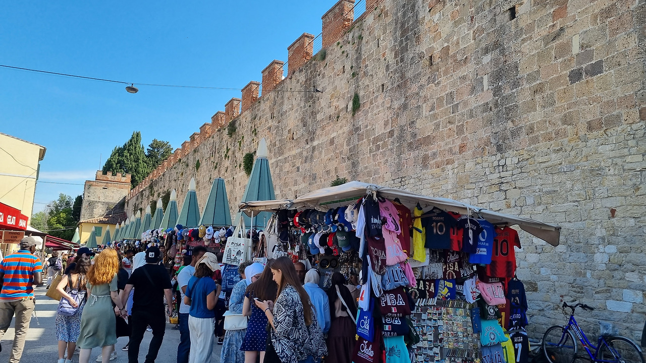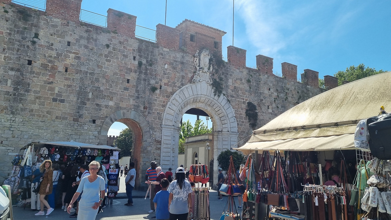 피사의 주요 명소는 거의가 피사 성곽 안에 모여있다. 성곽 안으로 들어가면 별로 걷지도 않고 산 죠반니 세례당, 피사 대성당 그리고 피사의 사탑 모두를 볼 수 있다. 주차를 한 후 피사 성곽 정문인 포르타 누오바로 갔다. 성문 앞은 수많은 기념품 노점으로 북적거린다. 성 안으로 들어갔다. 깨끗하게 관리된 성 안에 세례당, 대성당, 사탑의 3개 명소만이 조용히 자리 잡고 있다.