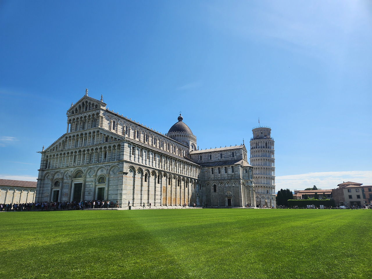 그다음에 나타나는 건물이 피사대성당(Duomo di Pisa)이며, 피사의 사탑은 피사대성당의 부속 건물로서 성당 문 앞쪽에 자리 잡고 있다. 피사대성당은 산 죠반니 세례당보다 조금 앞선 11세기에 건축되었다. 대성당과 사탑 역시 대리석으로 건조되었다. 나는 그동안 피사의 사탑은 화강암 아니면 벽돌로 만들어진 걸로 짐작했었는데, 이렇게 화려한 대리석 건축물일 줄은 몰랐다. 그리고 상상했던 것보다 훨씬 크고 높았다.
