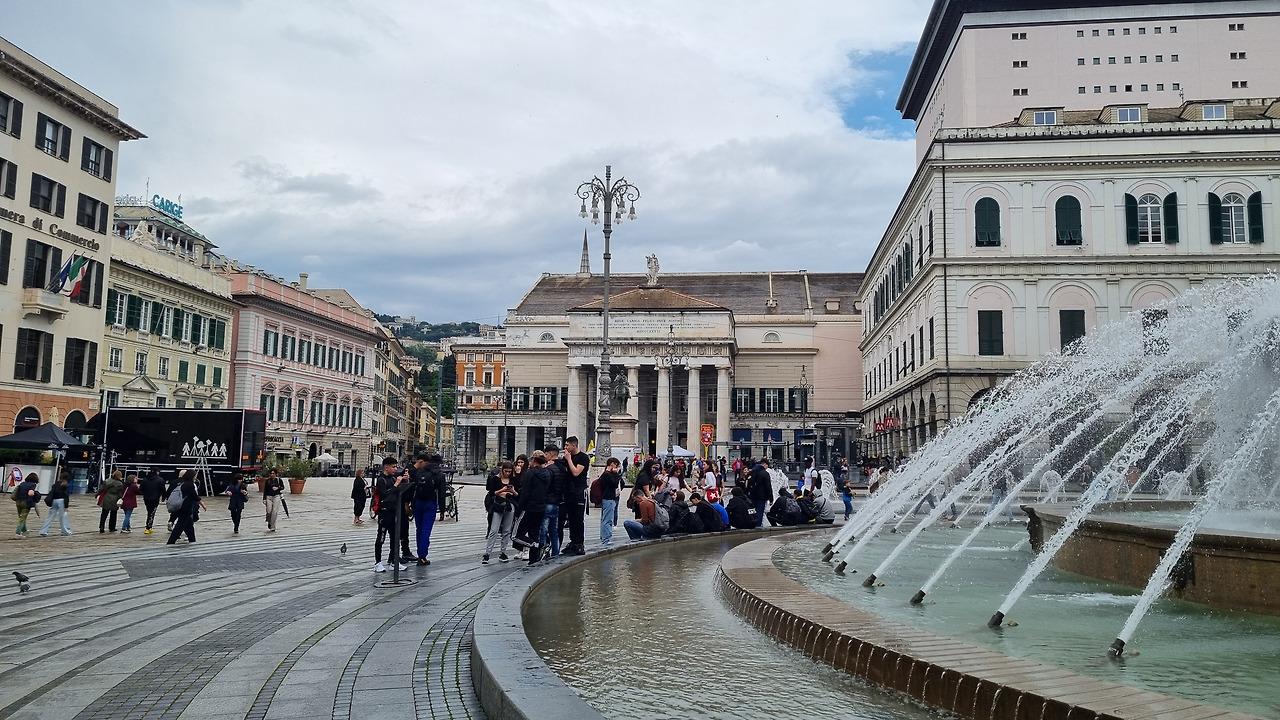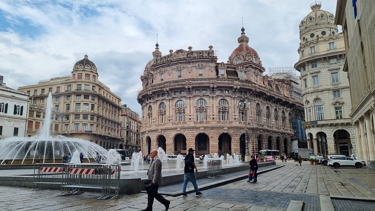 제노바 대성당 뒤쪽으로 가면 또 조그만 광장이 나오는데, 이 주위에는 박물관과 성당 등이 있다. 여기서 10시 방향으로 조금만 가면 큰 광장이 나오고 아름답고 큰 분수가 물을 뿜고 있다. 바로 제노바의 중심이라 할 수 있는 페라라 광장(Piazza de Ferrari)이다. 페라라 분수는 페라라 광장의 상징이라 할 수 있다. 페라라 광장 옆에는 특이하게 생긴 건물이 하나 보인다. 로마의 콜로세움을 모티브로 하여 지은 건물 같은데, 어떤 건물인지는 모르겠다.