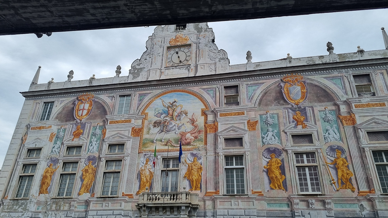 항구 쪽에서 도로를 건너 언덕을 오르면 먼저 성당처럼 생긴 건물이 나온다. 그런데 특이하게도 전면부 벽에는 벽화가 그려져 있으며, 가운데 벽화는 말 탄 기사가 용을 죽이고 있는 그림이다. 산지오르지오 궁전(San Giorgio Palace)이라고 한다. 이 궁전은 13세기에 건축되었는데, 중세 시대 제노바 공화국의 중요한 정치적 중심지였다고 한다.