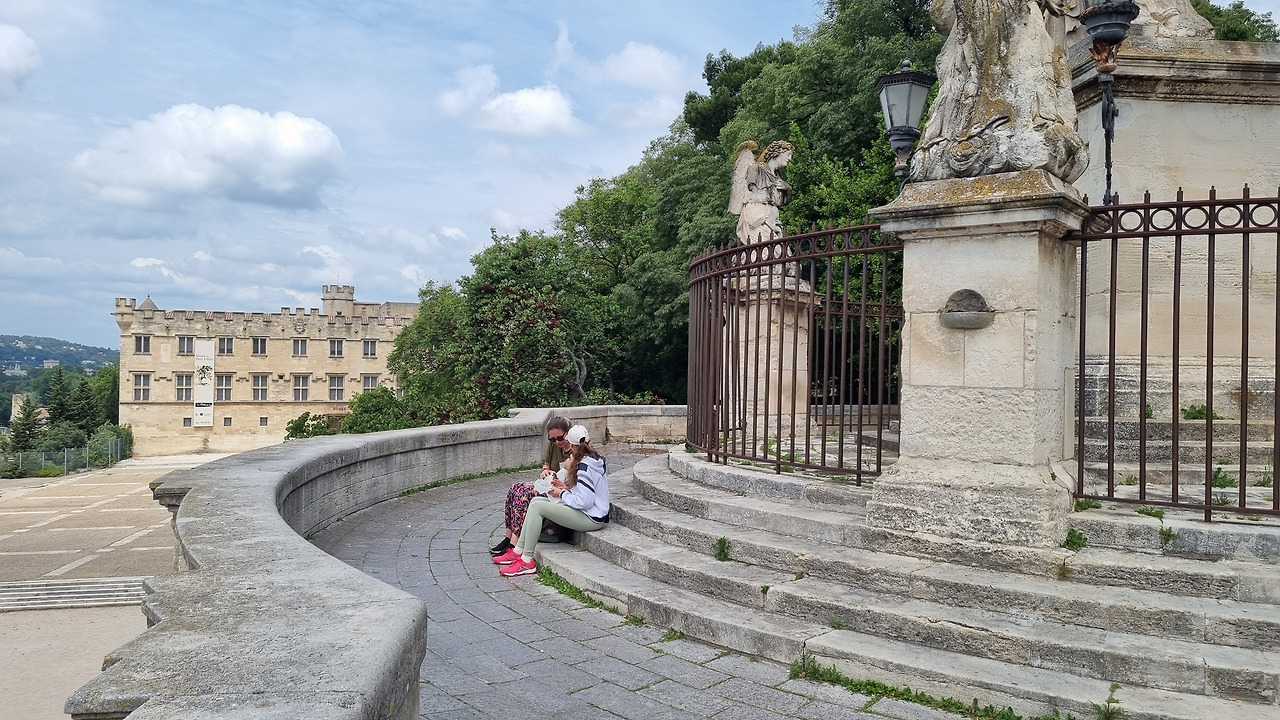 주차를 한 후 좁은 골목길을 이리저리 꺾으며 10여분 정도 걸으니 작은 언덕에 크고 아름다운 석조건물이 보인다. 가파른 좁은 계단이 계속된다. 계단을 다 오르니, 이곳은 교황청 뒤쪽으로서, '로쉐 데 돔'이라 부르는 정원이다. 이곳 로쉐 데 돔은 선사시대부터 사람들이 거주하던 장소로, 여러 유적들이 발견되었다고 한다. 로마 시대에도 중요한 지역이었으며, 중세 시대에는 방어 목적으로 사용되었다고 한다. 정원 안에는 많은 예술 작품과 조각, 그리고 아름다운 분수가 있다. '폰타나 데 돔(Fontaine des Doms)' 분수는 이곳의 랜드마크 중 하나라 한다.