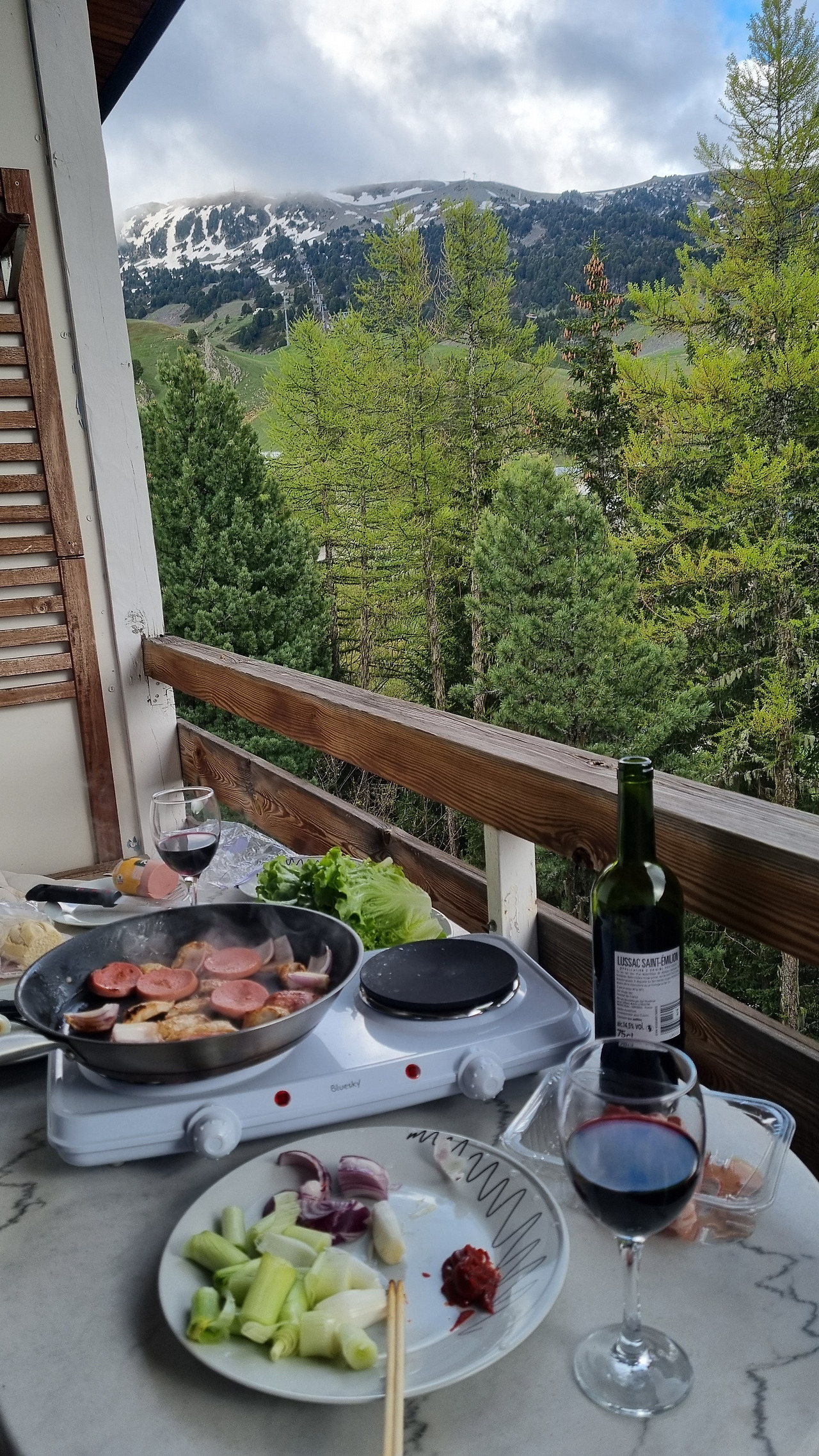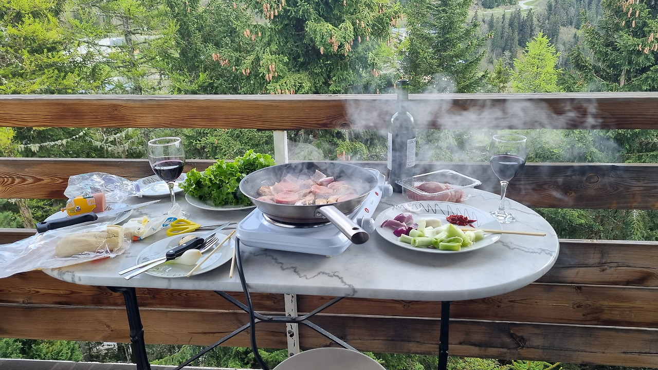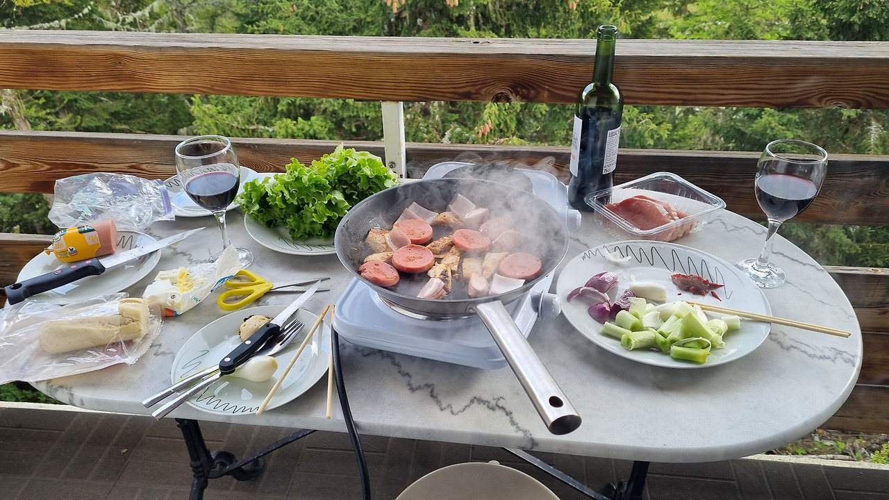 집사람은 식사를 준비한다. 베란다에 식탁을 차렸다. 조금 전 마트에서 산 돼지고기구이이다. 삼겹살이 없는 대신 버터를 듬뿍 바른 프라이팬에 돼지고기 살코기와 소시지를 구웠다. 상추와 양파를 곁들이니 한국에서의 삼겹살 파티가 부럽지 않다. 5유로짜리 와인을 곁들이니 금상첨화이다. 가슴속에 치밀었던 화는 어느새 모두 사라져 버렸다.