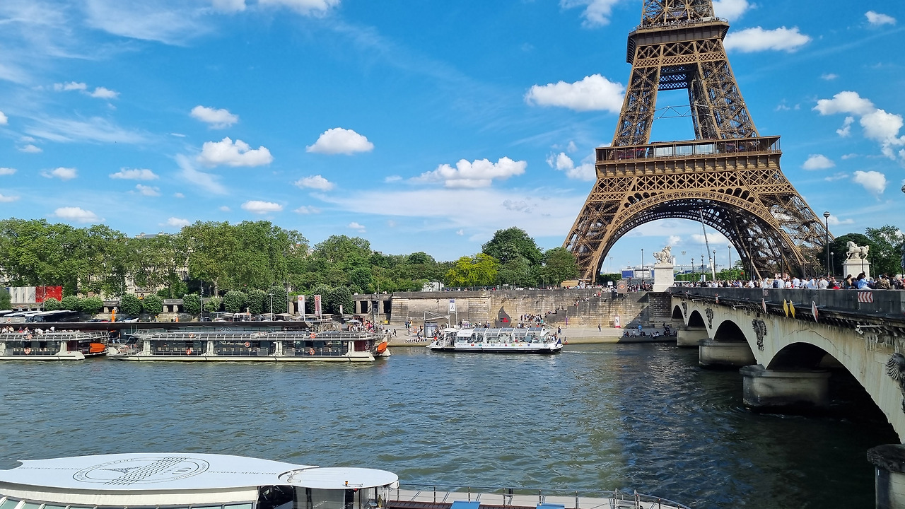 에펠탑에 도착하였다. 나는 20여 년 전에 파리에 출장을 와 하루 반의 짧은 관광을 한 적이 있었다. 그때는 에펠탑은 무료였던 것으로 기억하는데, 지금은 탑 아래쪽으로 가는 데는 입장료를 받고 있다. 그 때문에 에펠탑은 지금은 투명 플라스틱 담장에 갇혀있는 신세가 되었다. 에펠탑(Eiffel Tower)은 아이언 프레임 구조의 탑으로서, 프랑스혁명 100주년을 기념하여 1889년에 완공되었다. 이 탑은 프랑스의 기술자이자 건축가인 에펠에 의해 설계되었다.