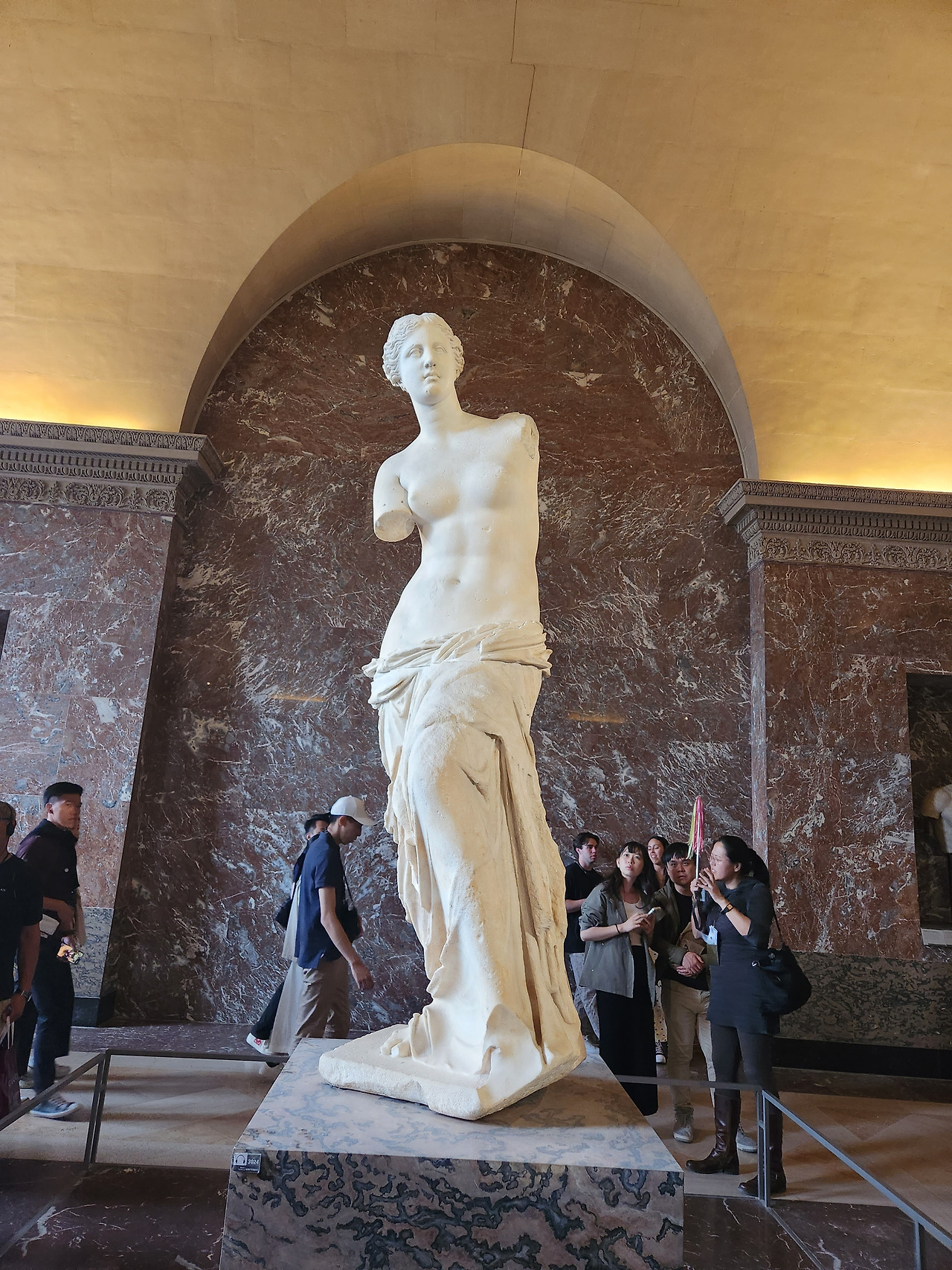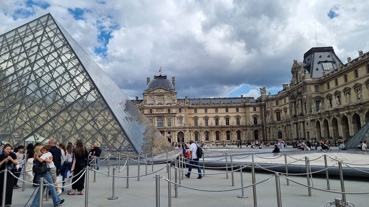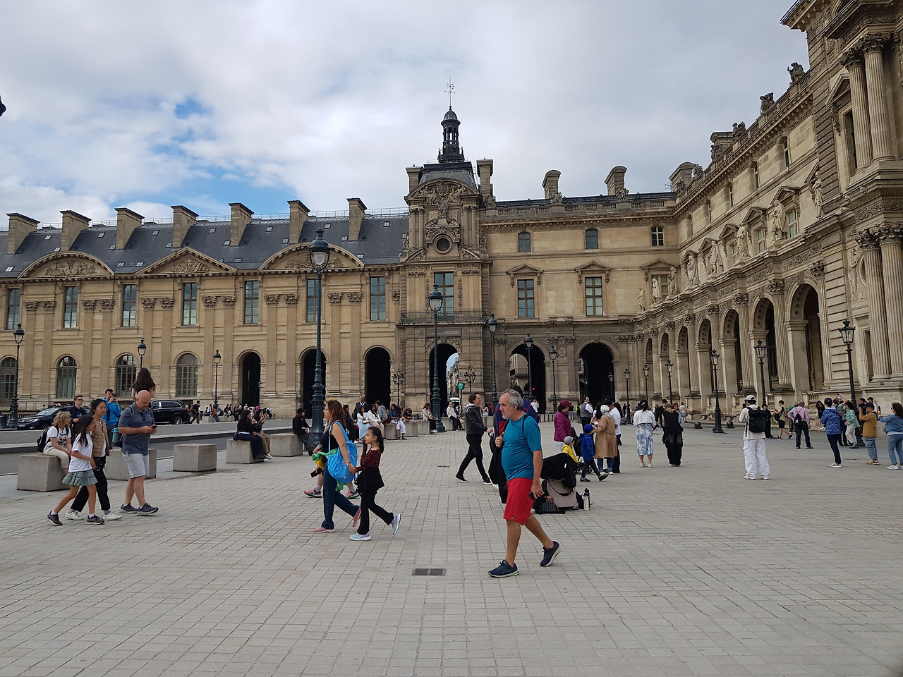 루브르 박물관에 도착하였다. 루브르 박물관(Le Musée du Louvre)은 소장품도 좋지만 건물자체가 멋있다. 박물관 건물은 중세시대인 12세기말 파리의 방어를 위한 요새로서 시작되었다. 당시의 건물에는 성벽과 방어용 탑이 있었다고 한다. 14세기 후반부터 이 이곳은 왕실의 거주지로 바뀌었고, 16세기 프랑수아 1세가 르네상스 양식의 궁전으로 재건축하였다고 한다. 이때부터 루브르는 왕실의 주요 거주지였다고 한다. 그러다가 루이 14세가 베르사이유 궁전을 지어 왕궁을 그쪽으로 옮기면서 루브르는 예술품을 보관하고 전시하는 장소로 바뀌었다고 한다. 루브르 박물관의 전시 공간은 약 73,000평방 미터라고 하니, 약 25,000평에 가까운 면적이다. 정말 어마어마하다.