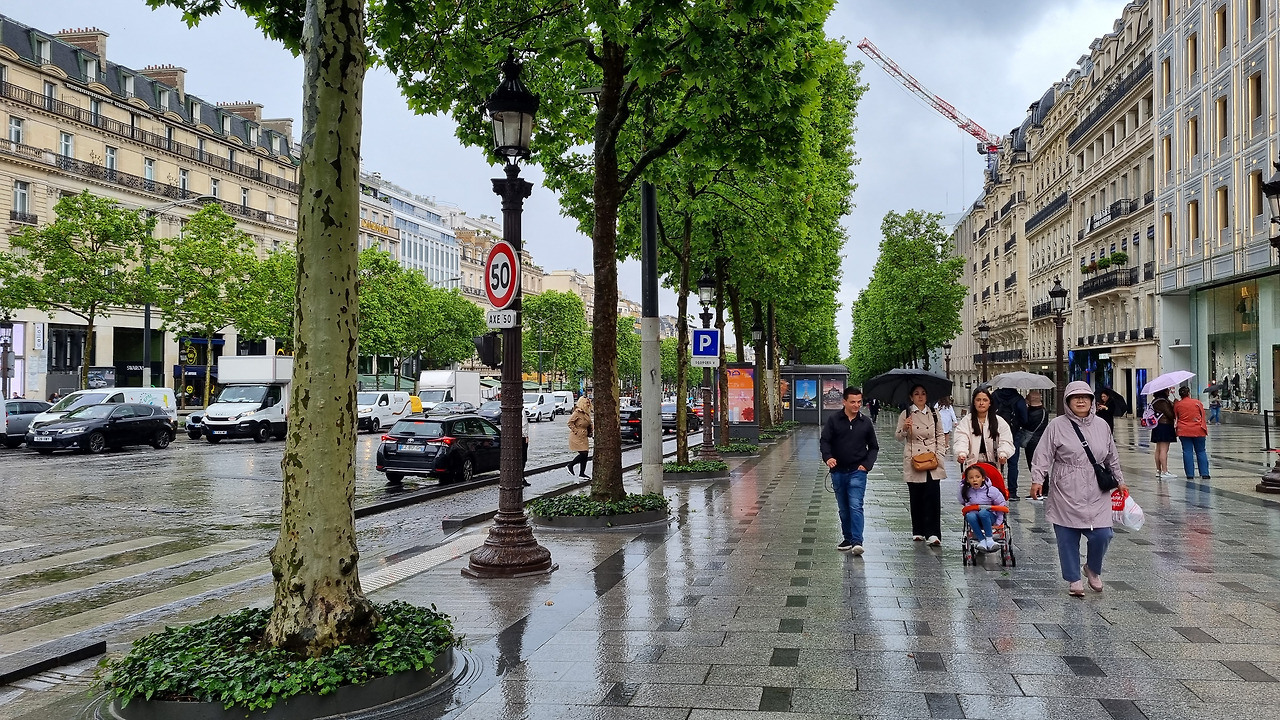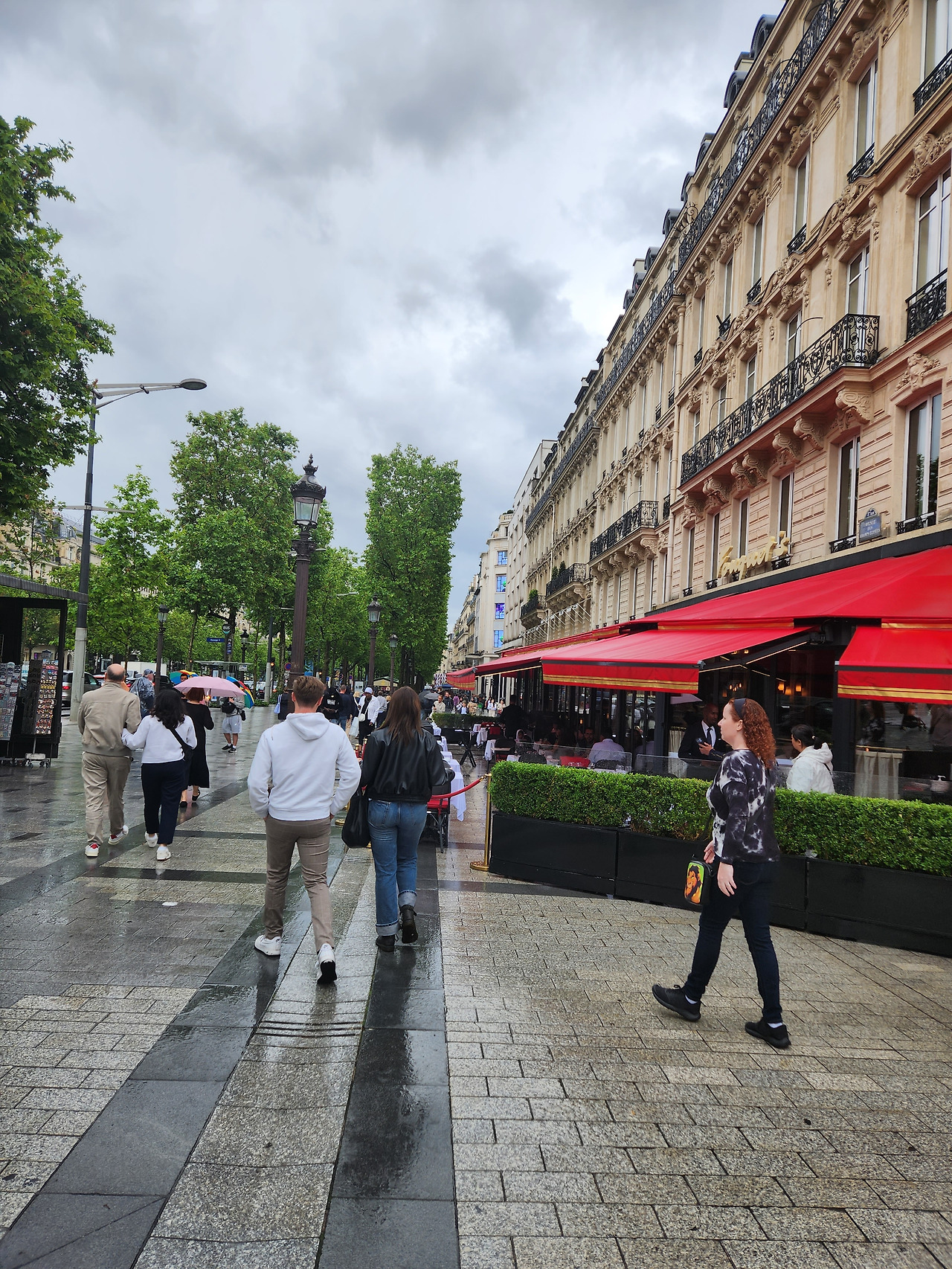 샹젤리제 거리는 개선문에서 뻗어나간 12개의 도로 가운데 메인 도로이다. 어제 이곳에 왔으나 제대로 구경을 하지는 못했다. 지하철 역을 나오니 바로 개선문 옆이다. 이때 갑자기 빗방울이 떨어지기 시작하더니 소나기로 바뀐다. 허겁지겁 가까운 가게로 피신하였다. 30분쯤 지나니 비가 잦기 시작한다. 가랑비를 맞으며 샹젤리제 거리를 걸었다. 대부분이 명품숍이라 그런지 거리가 크게 붐비지는 않는다.