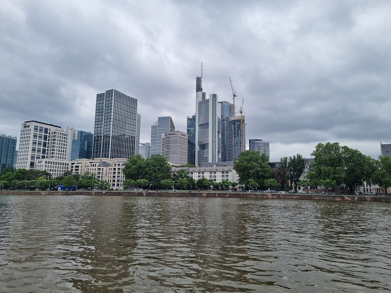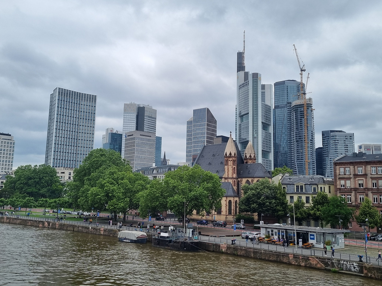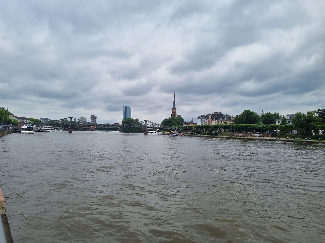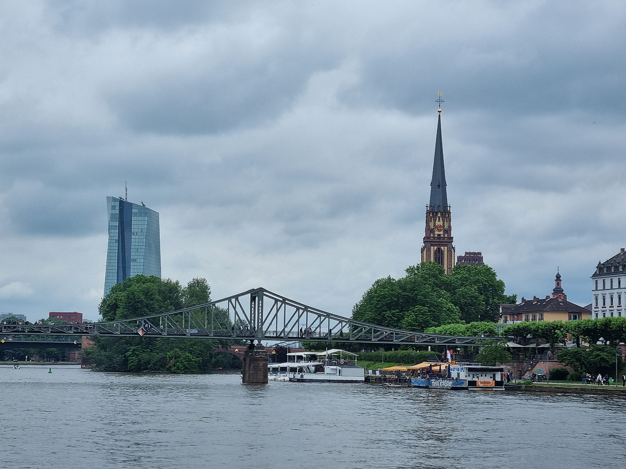 다리를 건너가 강 건너 쪽 산책로를 걸었다. 강 저쪽의 프랑크푸르트 도시가 새로운 모습으로 다가온다. 고층건물 밀집지역이 눈에 들어오는데, 금융기관이 모여있는 곳이다. 유럽 중앙은행을 중심으로 유럽의 금융 허브로서의 기능을 가진 곳이다. 강 건너 쪽을 산책한 후 다른 다리를 이용하여 다시 강을 건너왔다.