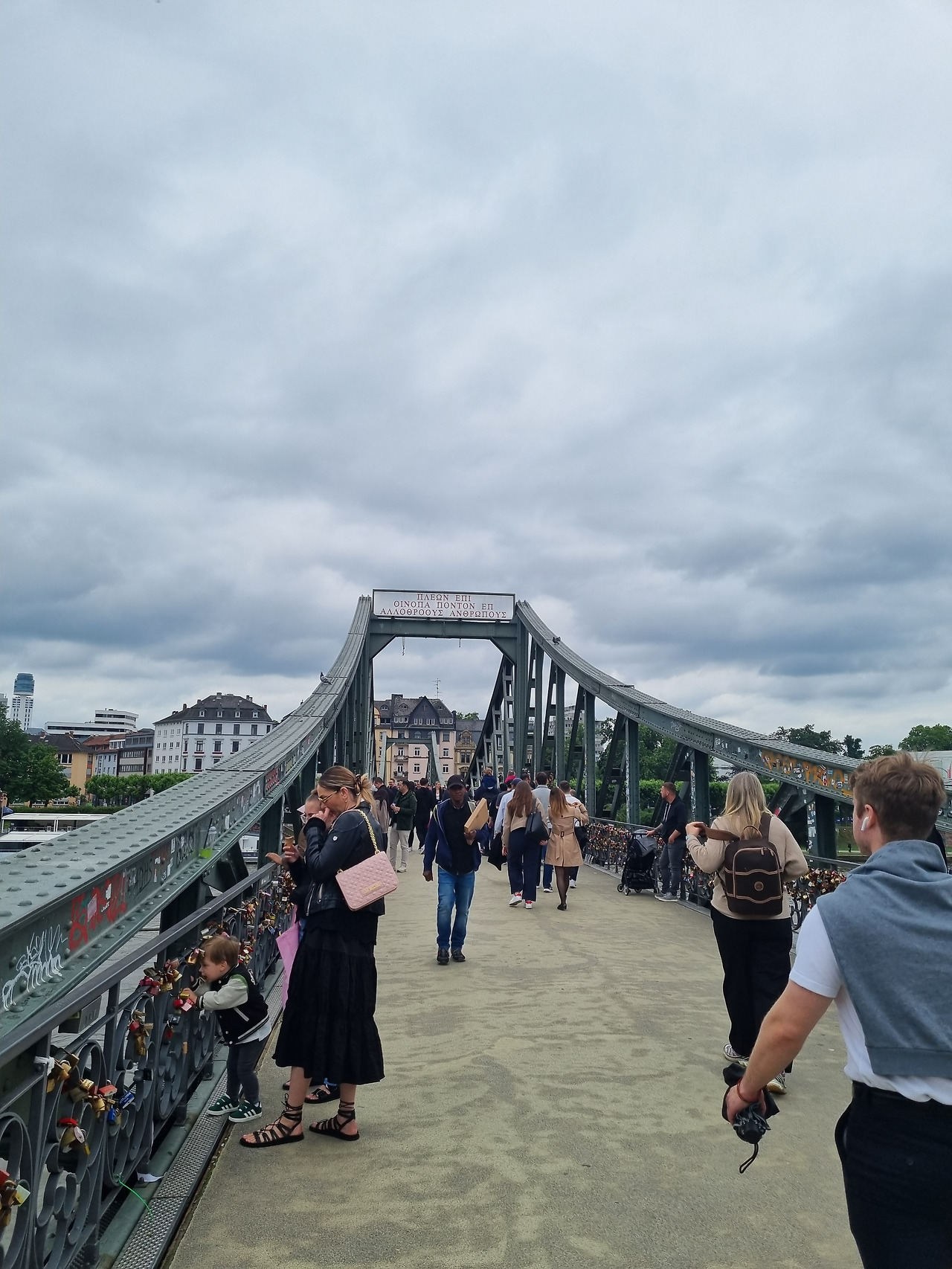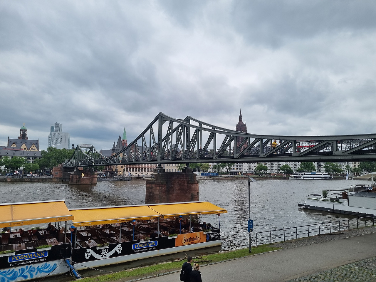 아이젤너 다리에 올랐다. 이 다리는 프랑크푸르트의 명소로 알려져 많은 시민들과 관광객들이 이곳을 찾아 마인강의 경치를 감상하고 있다. 아이젤너 다리에 올라서 바라보면 마인강의 풍경뿐만 아니라 프랑크푸르트의 도시 전체의 모습을 볼 수 있다. 강 상류의 왼쪽과 오른쪽, 그리고 하류의 왼쪽과 오른쪽 모두 4개 지역이 특색 있는 모습을 보여주고 있다. 아이젤너 다리는 보행자 전용다리라 걷기에 어주 편하다. 그러나 강폭이 넓지 않기 때문에 다리가 그다지 길지는 않다.