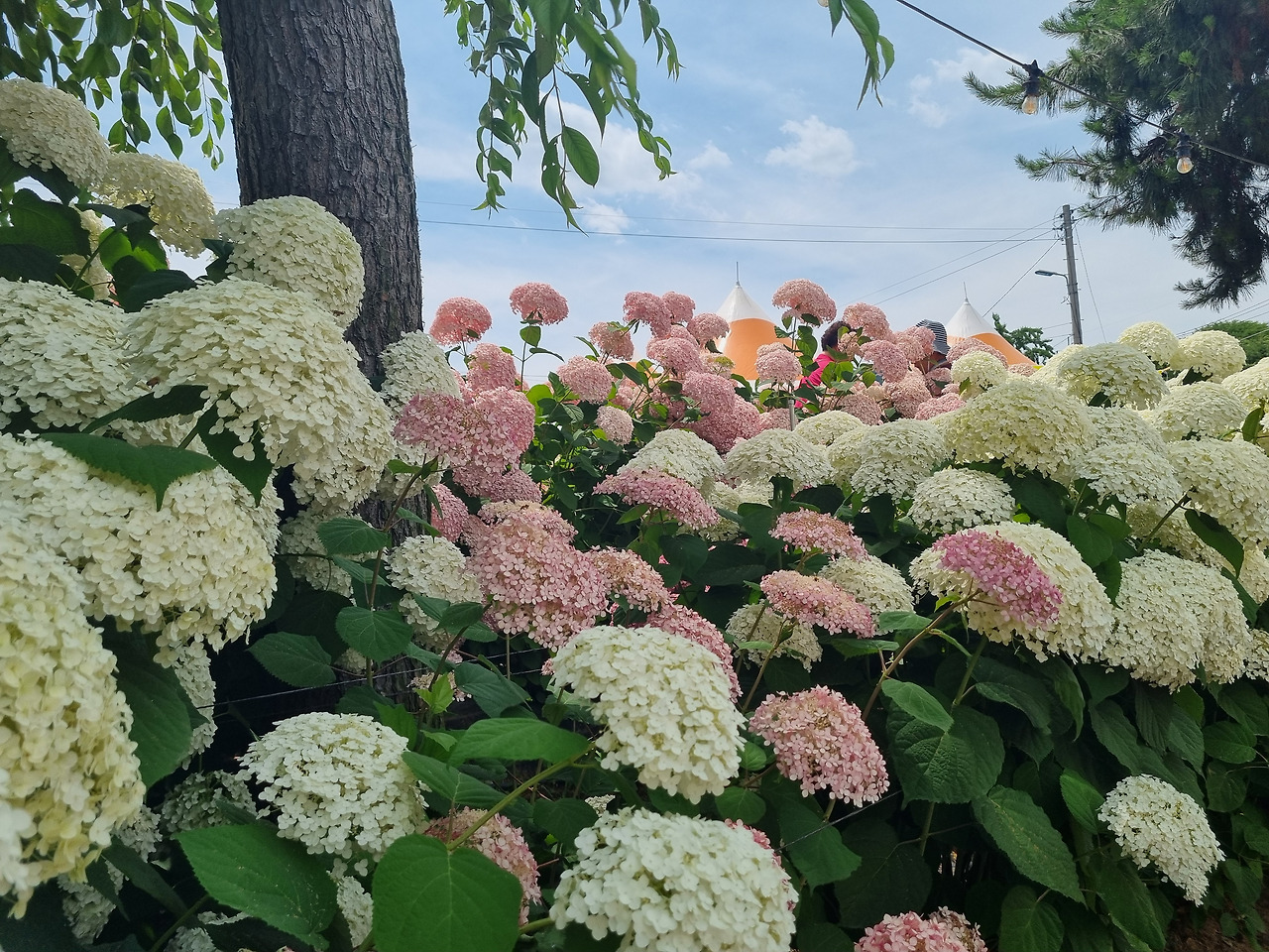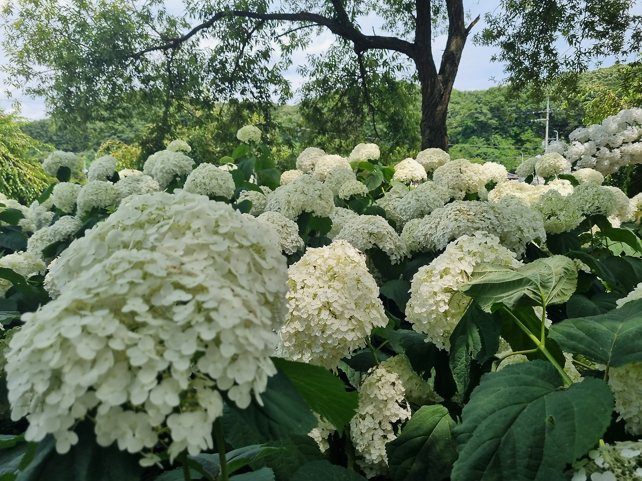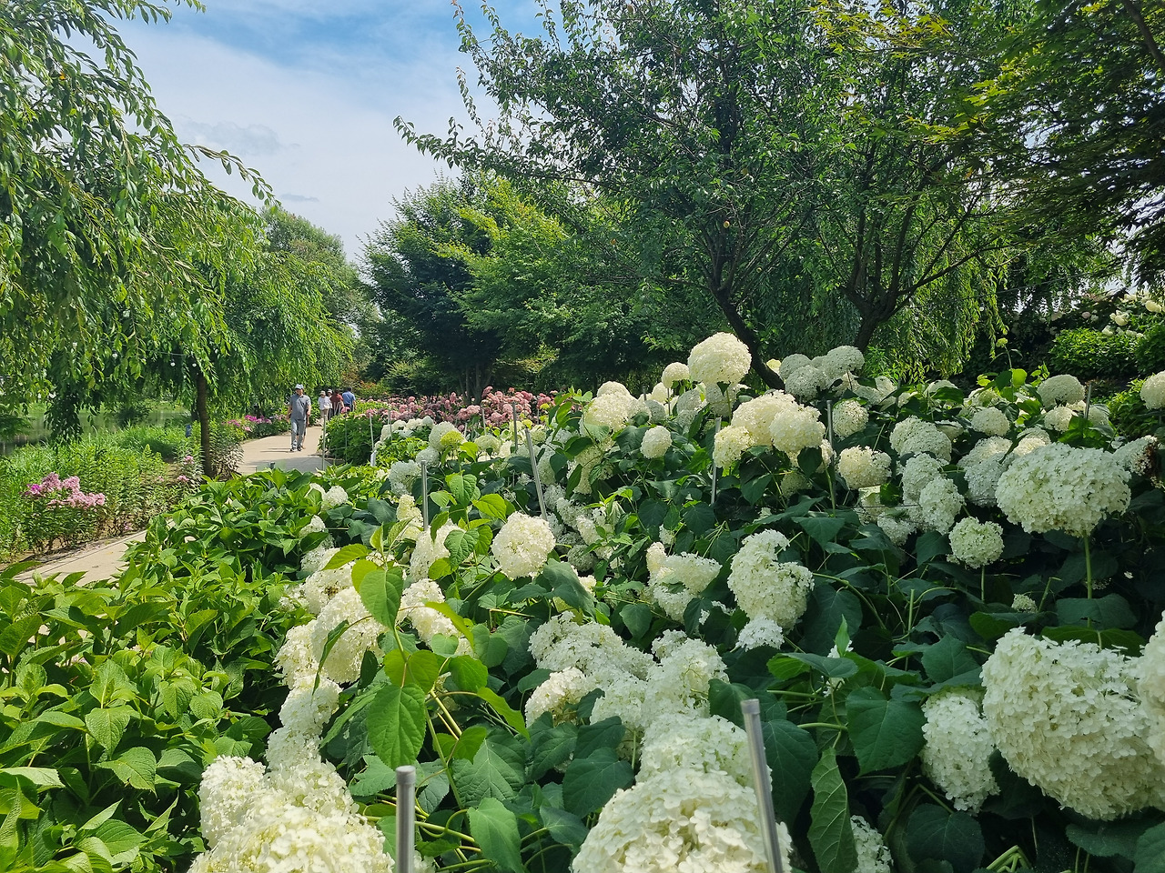 지난 주 3일동안 수국 축제를 했다고 하는데, 그래서 그런지 꽃이 조금 시들어져 간다. 나는 수국 가운데 푸른색 수국을 가장 좋아한다. 그런데 이곳에는 흰색 수국이 대부분이고 분홍색 수국 약간, 푸른색 수국은 거의 없다. 흰색 수국은 꽃이 아주 활짝 피었는데, 분홍 수국은 조금 시들어간다.