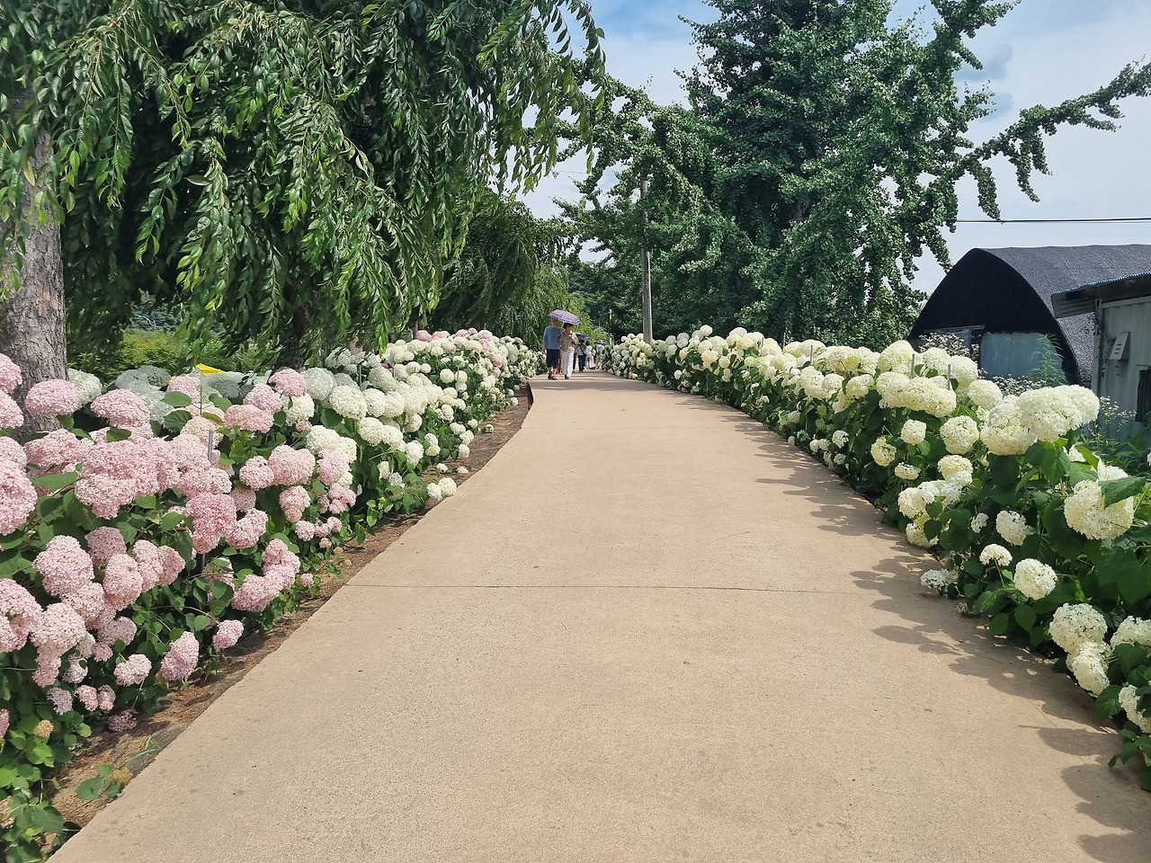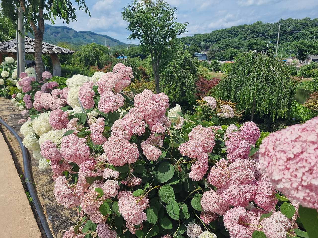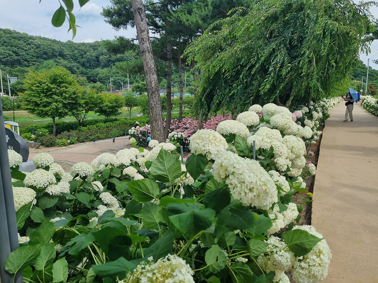 그런데 이곳 세종시 가까운 곳에도 수국공원이 생겼다. 바로 공주유구색동수국 공원이라는 곳이다. 몇년전 공주시 유구읍을 흐르는 개천 둑방길과 개천 아래 수국 공원이 조성되었다. 약간 철이 지난 감도 있지만, 수국이 만발하였다.