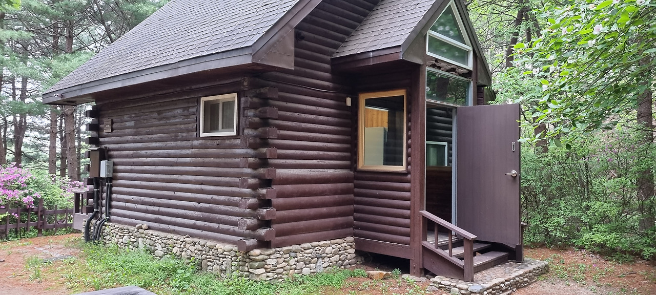 통나무집 앞에는 나무 탁자와 의자가 있다. 이곳에서 식사를 하면 좋겠는데, 빗방울이 떨어져 그럴 수 없다. 아쉽다. 4인용 통나무집의 넓이는 대개가 24평방미터 정도이다. 이곳도 그 정도 넓이인데, 특이한 것은 거실 겸 식당이 좁은 대신 작은 방이 딸려있다. 높은 산의 숲 속이라 날씨가 차다. 난방을 켜니 얼마 지나지 않아 방바닥이 뜨끈뜨끈해진다. 어딜 가더라도 휴양림 숙소는 난방 하나는 끝내준다. 특히 조금 추운 날씨에 뜨끈뜨끈한 방바닥에 몸을 눕히면 기분이 최고이다. 먼저 코스트코에서 사 온 의자를 폈다. 아주 편하다. 이제 자연휴양림에서의 생활 가운데 유일한 불편인 “앉는 문제”로부터도 해방되었다. 베란다 창문을 여니 시원하고 향기로운 숲 속 공기가 그대로 방으로 불어 온다.