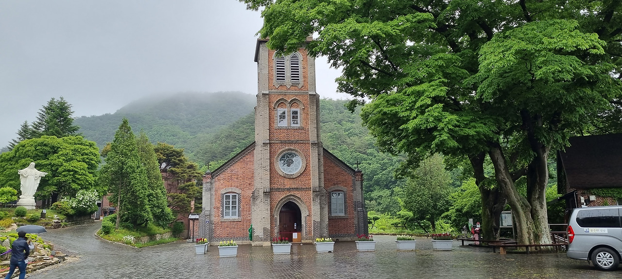 풍수원 성당으로 갔다. 지금까지는 여행을 가면 대부분 절을 찾았는데 이번에는 드물게 성당을 찾았다. 풍수원 성당은 강원도에서 처음 지어진 성당으로, 옛 모습이 잘 보존되어 있다고 한다. 조선 말기 기독교 탄압을 피해 경기도 용인에 살던 40여 명의 신자들이 피할 곳을 찾다 정착한 곳이 이곳 풍수원이라 한다. 이를 계기로 전국 여러 곳에서 박해를 받던 천주교 신자들이 이곳에 모이게 되면서, 우리나라에서 세 번째로 서품을 받은 정규하 신부가 이곳에 성당을 지었다고 한다. 풍수원 성당은 1907년에 완성되었는데, 서울의 약현성당, 완주의 되재성당, 서울 명동성당에 이어 우리나라에서 네 번째 오래된 성당이라 한다.