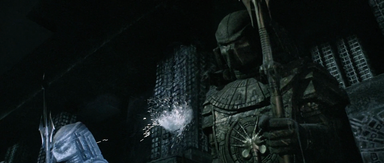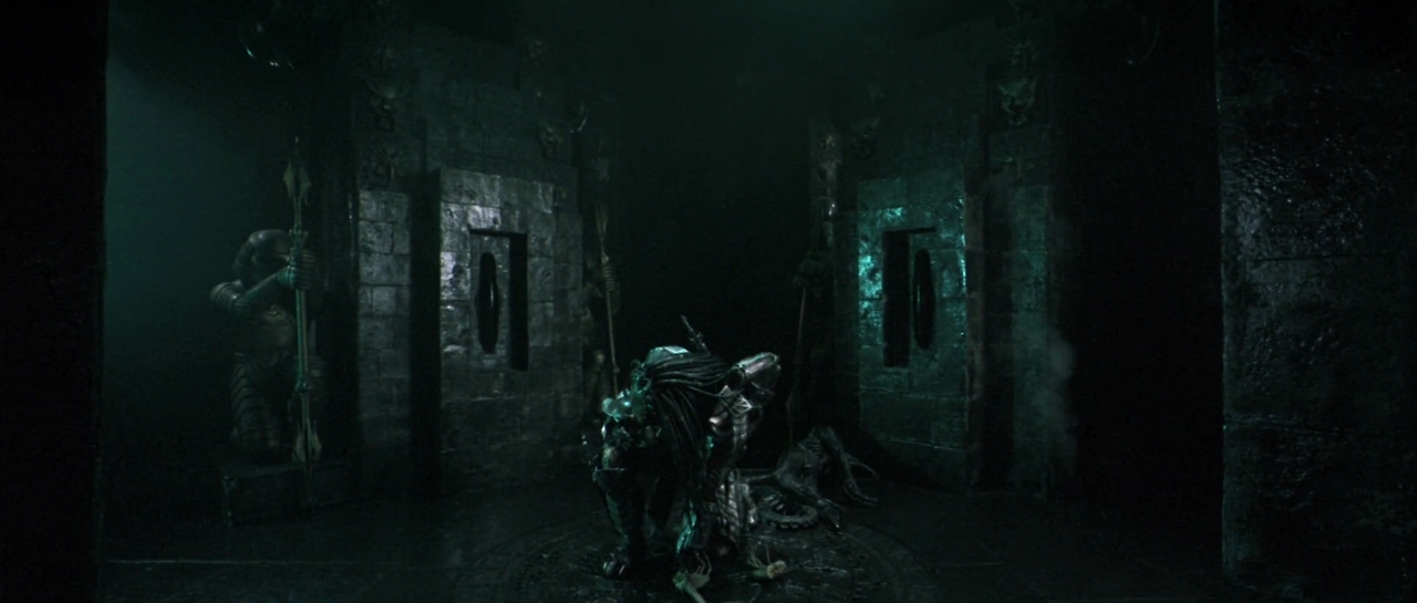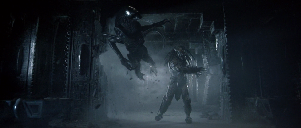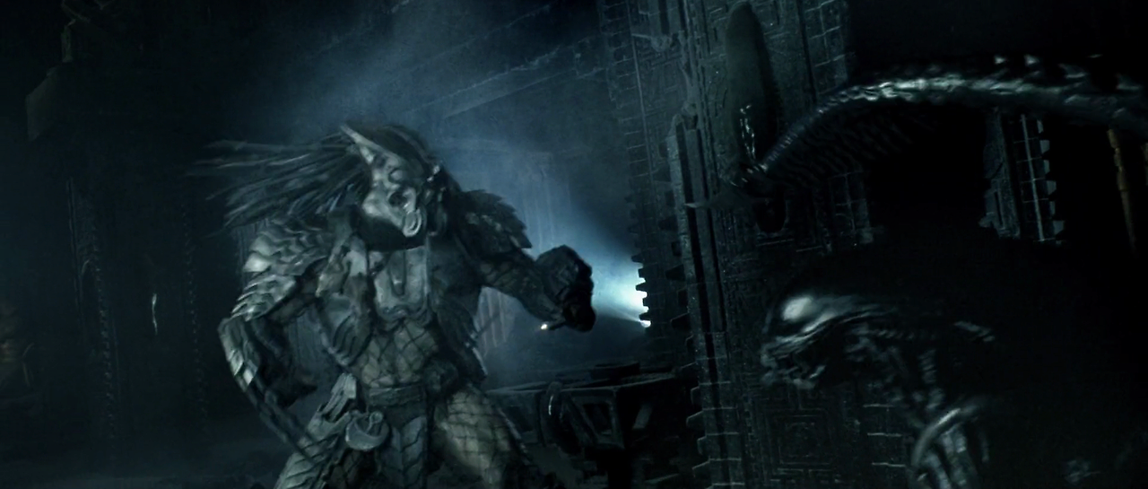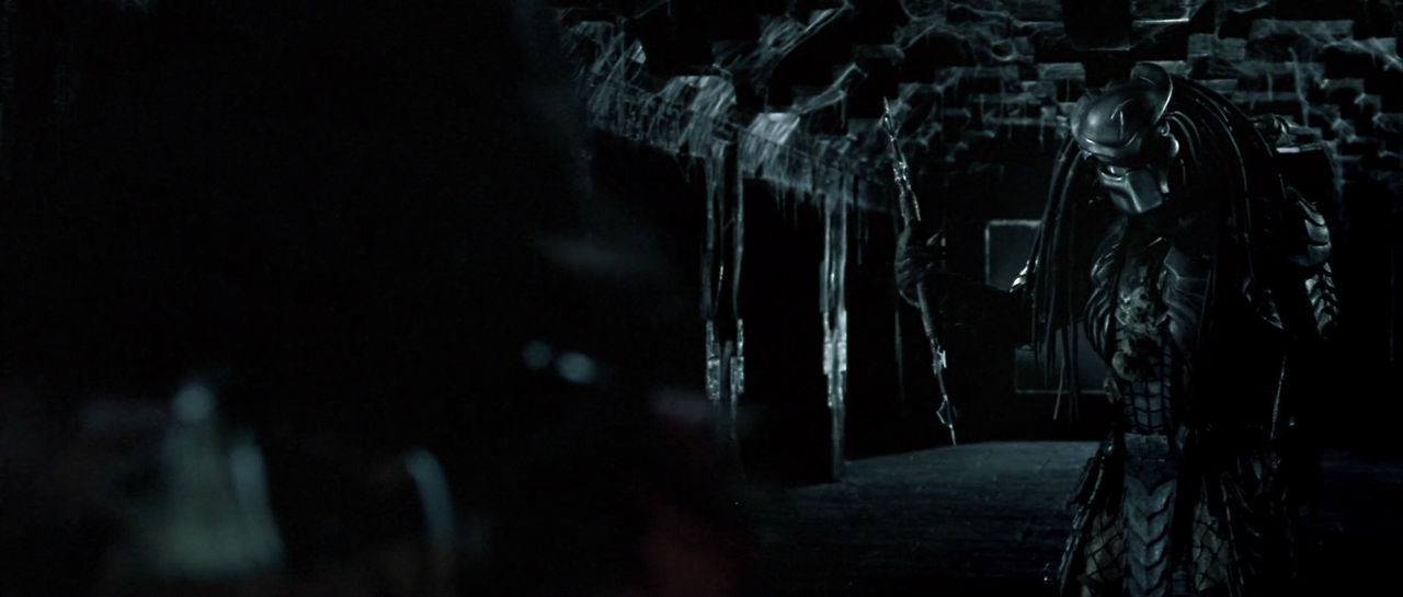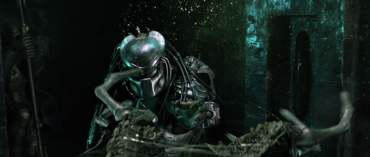 다시 혼자 남은 알렉스의 뒤 쪽에서 프레대터가 나타난다. 알렉스는 무기를 돌려주면서 목숨을 살려달라고 하고, 프레대터가 그런 알렉스를 바라보고 있을 때 제노모프가 나타나 프레대터를 공격한다. 알렉스도 프레대터가 떨어뜨린 창을 집어 들고 함께 제노모프와 싸워 쓰러트린다. 프레대터는 알렉스의 용기를 칭찬하면서, 제노모프를 해체하여 제노모프의 머리로 방패를 꼬리로 창을 만들어 알렉스에게 준다. 알렉스와 프레대터는 다시 미이라가 누워있던 “제물의 방”으로 돌아온다.