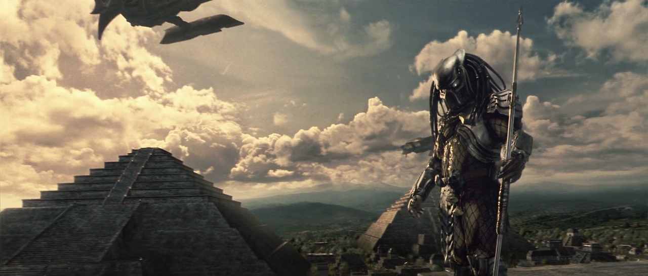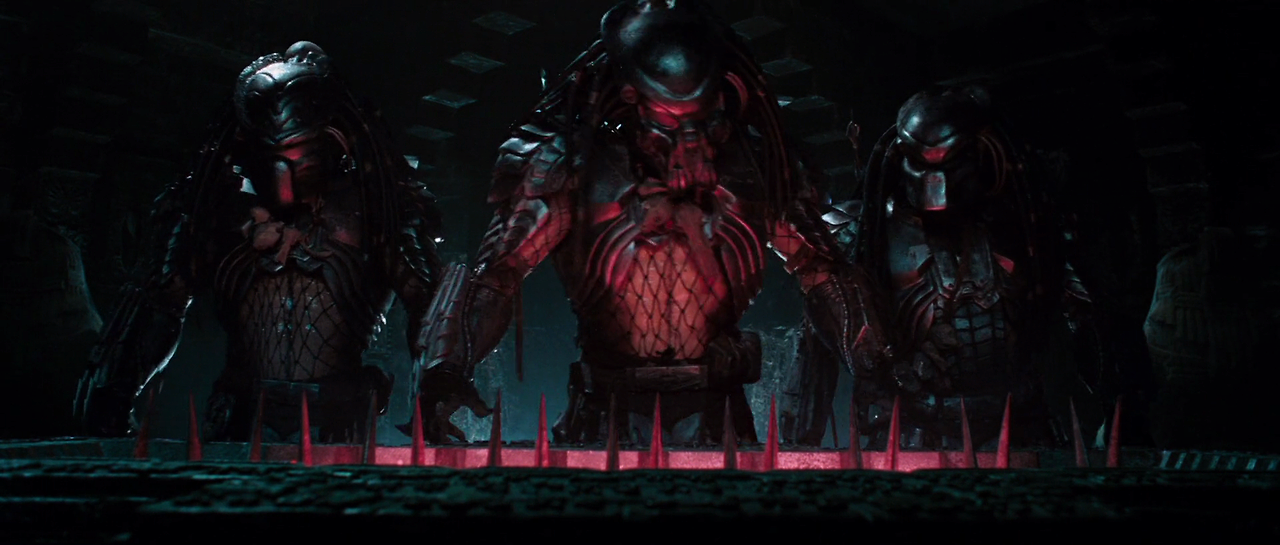 한편 하늘에서는 갑옷과 같은 복장을 한 수상한 그림자들이 그들의 동향을 살피고 있었다. 그들은 우주의 사녕꾼인 프레대터이다. 지상으로 내려온 프레대터들은 탐사대의 지상 잔류팀 멤버들을 한 사람 한 사람씩 사냥한 후, 선발대를 노리고 큰 구멍으로 들어간다. 몸 컨디션이 좋지 않은 웨이랜드 사장에게 알렉스는 등산 사고로 목숨을 잃은 자신의 아버지의 이야기를 들려주며 설득하지만, 웨이랜드 사장은 그 말을 듣지 않고 조사대와 함께 떠난다.