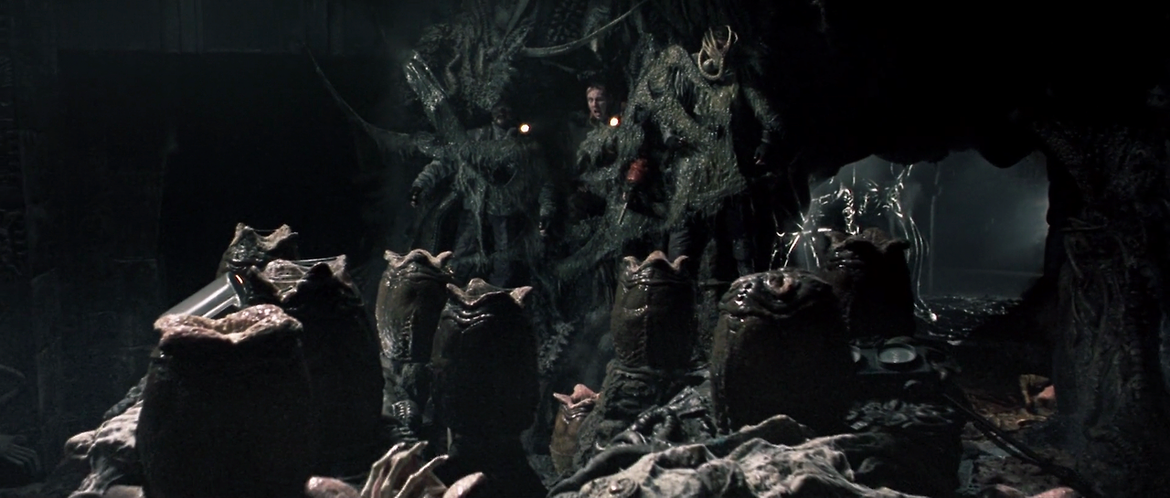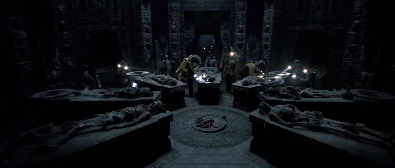 사태가 예상치 못한 방향으로 전개되는 데다 웨이랜드 사장의 몸상태가 더욱 나빠지자, 알렉스는 일단 임시 기지로 돌아가자고 제안한다. 그러나 용병 대장인 맥스 스태포트는 그 말을 듣지 않고 석관 속에서 총을 끄집어낸다. 그러자 방안에 있던 기관이 작동하여, 미이라 사이에 있던 조사대원들은 방에 갇혀버리고, 알에서 부화한 페이스허거(제노모프를 인간에게 기생시키는 유체)의 먹이가 되고 만다.