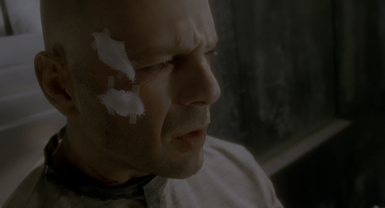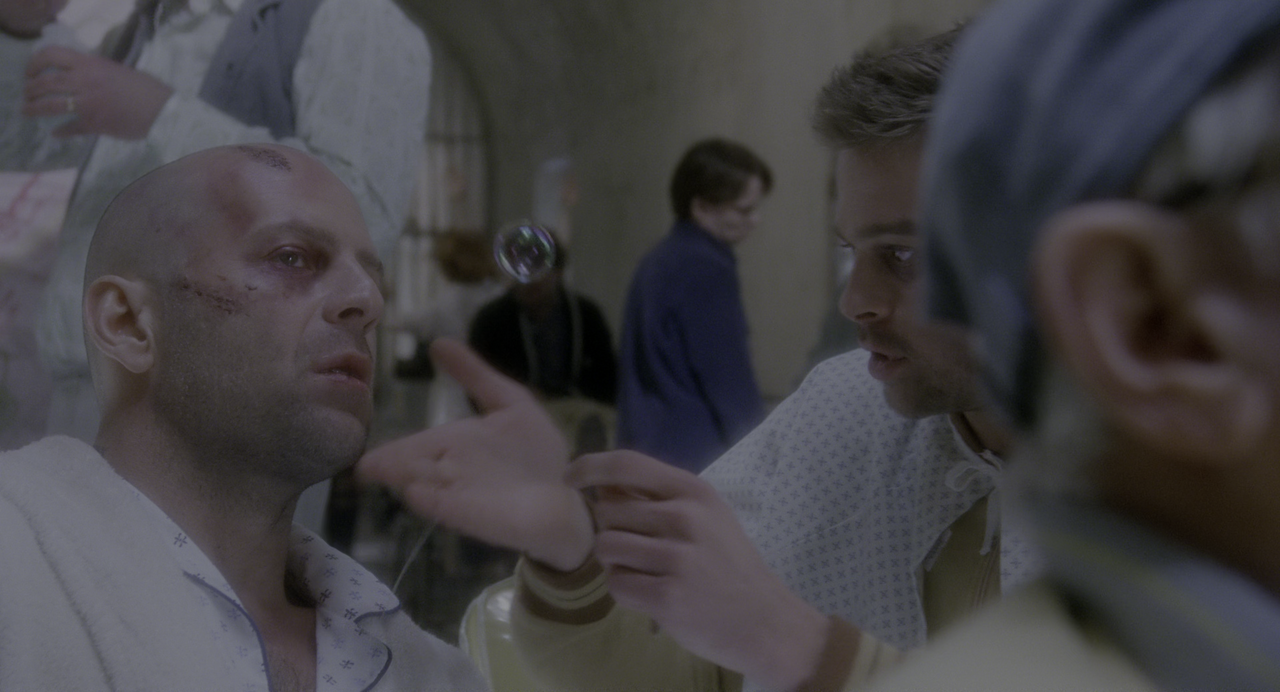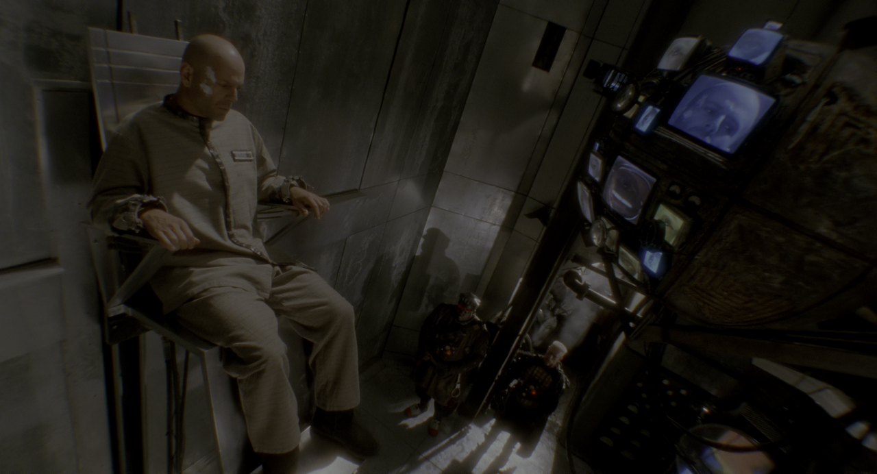 1990년, 정신과 의사인 캐서린 라일리는 경찰서에 구금되어 있는 제임스 콜을 면담하고 있다. 제임스는 “12마리 원숭이”의 바이러스 확산음모를 막기 위해 미래에서 왔다고 주장하였지만, 경찰은 이를 믿지 않자 날뛰다가 잡혀온 것이었다. 제임스는 캐서린에게도 같은 말을 반복하지만, 말을 하는 도중 자신이 잘못된 시대로 왔다는 사실을 깨닫는다. 그리고 또 그는 캐서린이 자신의 꿈속 공항에서 본 여자와 비슷한 얼굴을 하고 있다는 사실을 알고 놀란다. 제임스는 망상장애 진단을 받고 강력한 진정제를 투여받은 후 정신병원의 폐쇄병동에 수용된다.
