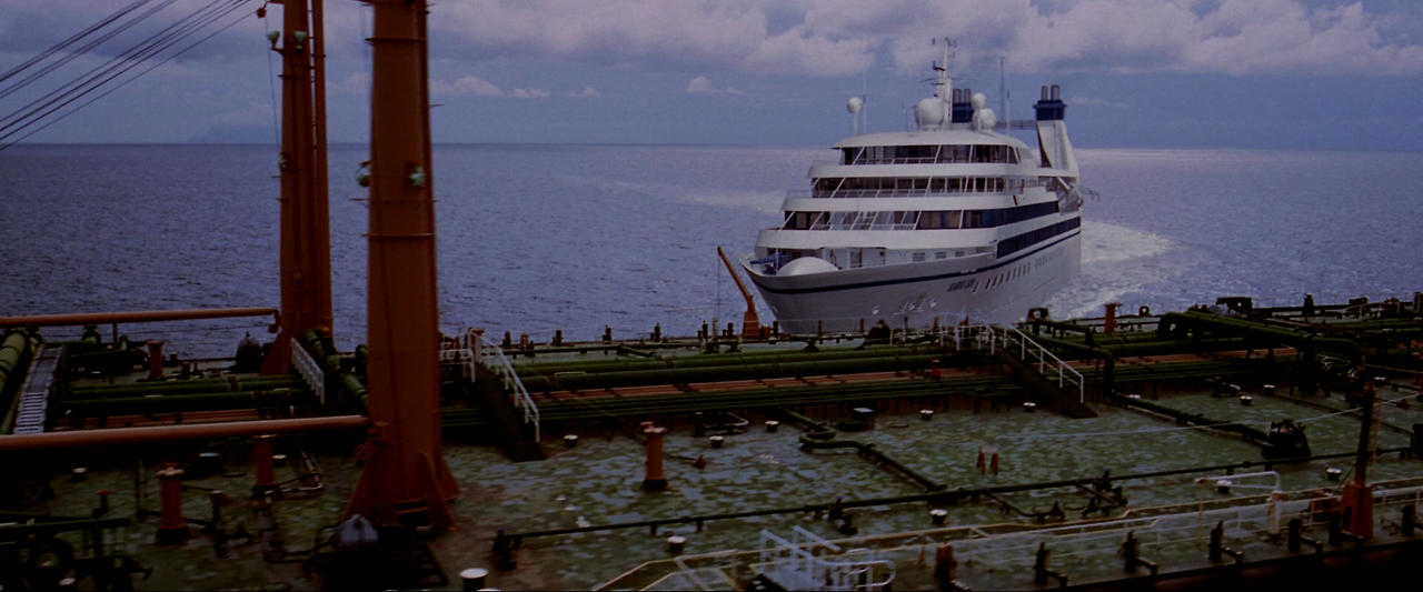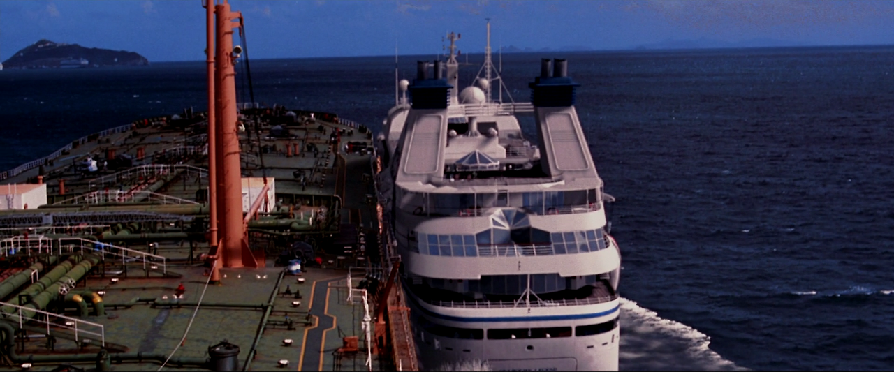 알렉스는 보조 스크루를 이용하여 배의 방향을 변경시킨다. 크루즈는 유조선과 약간 마찰을 일으키기는 하였지만 극적으로 유조선을 피한다. 그러나 배는 그대로 섬의 리조트 시설을 향하고 있다. 알렉스는 보조 스크루를 이용하여 필사적으로 배의 스피드를 떨어뜨린다. 배는 서서히 감속하지만 결국 해안가 부두에 부딪힌다. 배는 가속도로 육지로 올라와 미끄려져 전진하다가 겨우 멈춘다.