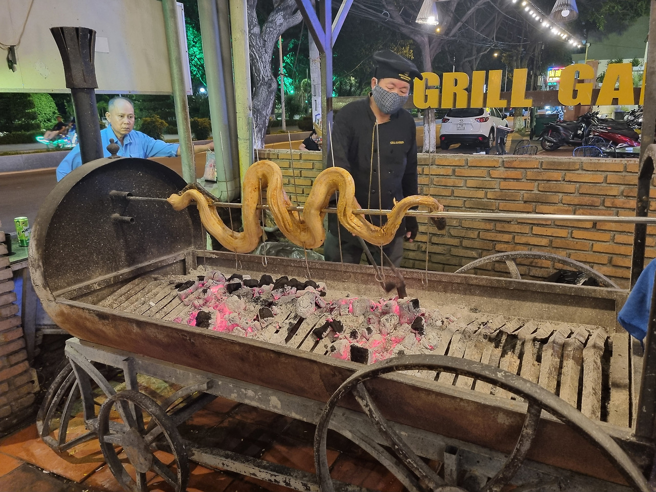 꽤 걸었더니 잠이 쏟아진다. 자다 깨다 비몽사몽, 일어나니 날이 깜깜하다. 저녁을 뭘 먹나. 어제저녁 해물 뷔페를 본 기억이 나 그곳을 찾아갔다. 그런데 그곳은 해물을 구워 먹는 곳이었다. 더운 날씨에 뜨거운 숯불 앞에 혼자 앉아 해물을 굽기는 싫다. 포기하고 나오다 보니 입구 근처에서 뭔가 이상한 것을 통바비큐로 굽고 있었다. 다가가 보니 그것은 구렁이였다. 길이가 3미터는 넘어 보이는 길고 굵은 구렁이를 통째로 굽고 있었다. 아마 이 음식점의 대표 요리인 것 같다.