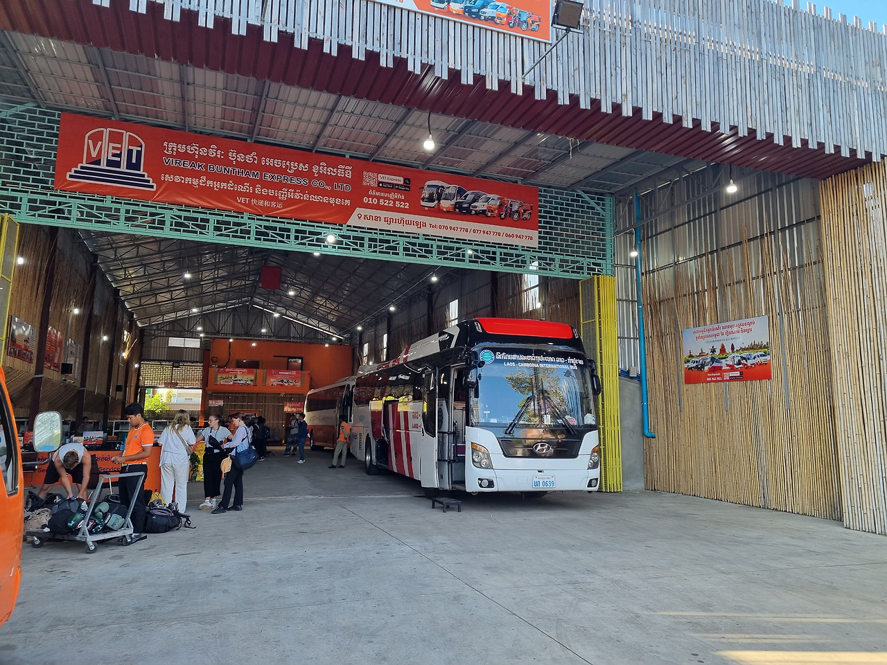 12시가 되자 승무원이 점심 도시락을 나누어준다. 소스를 첨가한 비빔국수인데 맛이 괜찮다. 오후 2시 정도가 되어 국경에 도착했다. 2년 전에도 통과한 적이 있는 국경이다. 이전에는 국경통과를 하는 사람이 많아 많이 복잡했는데, 이번엔 사람이 거의 없다. 캄보디아 입국수속을 간단히 마쳤다.