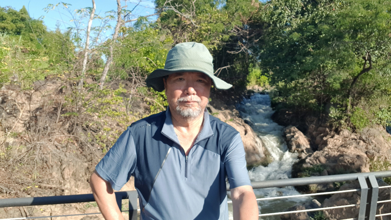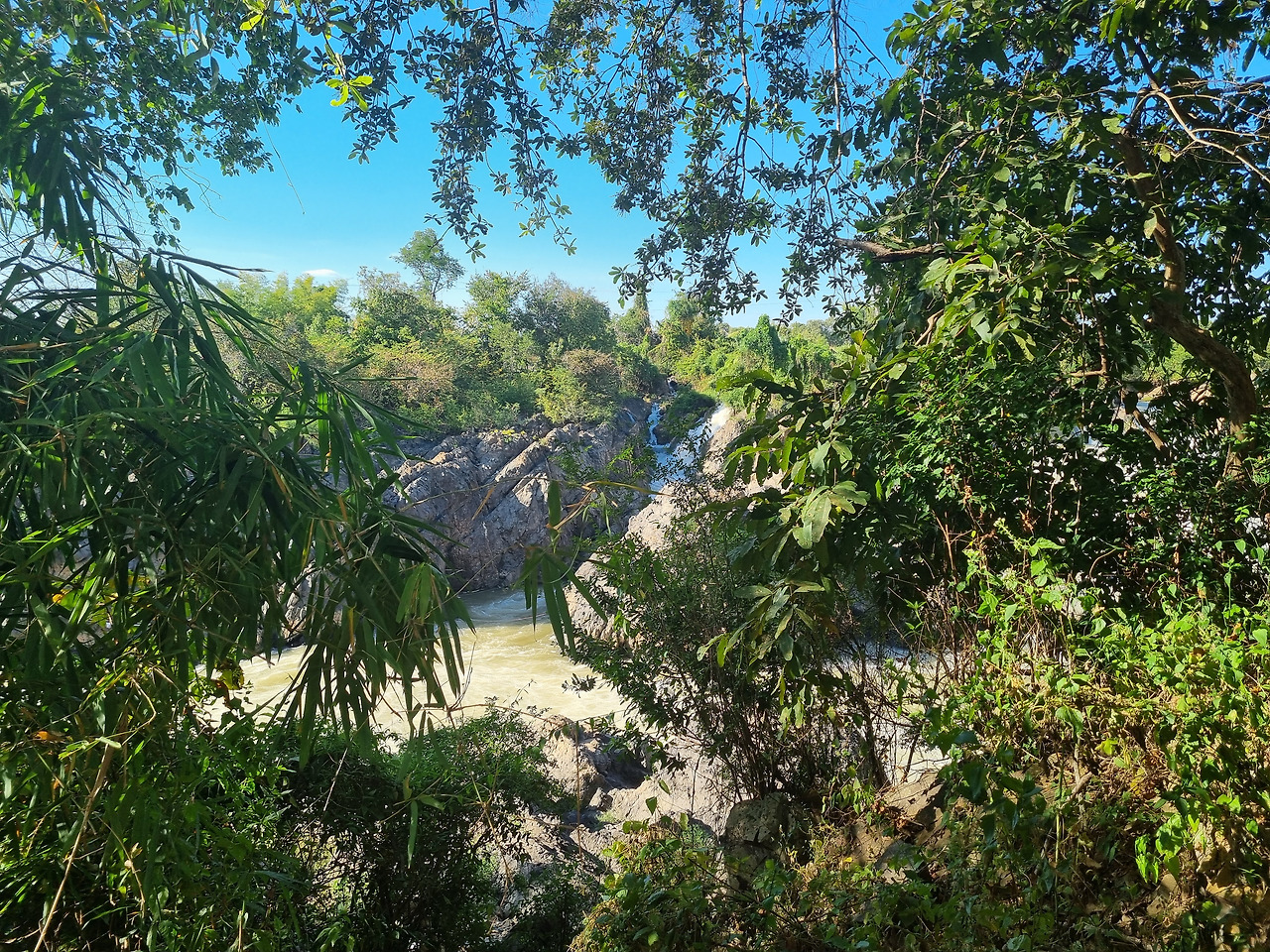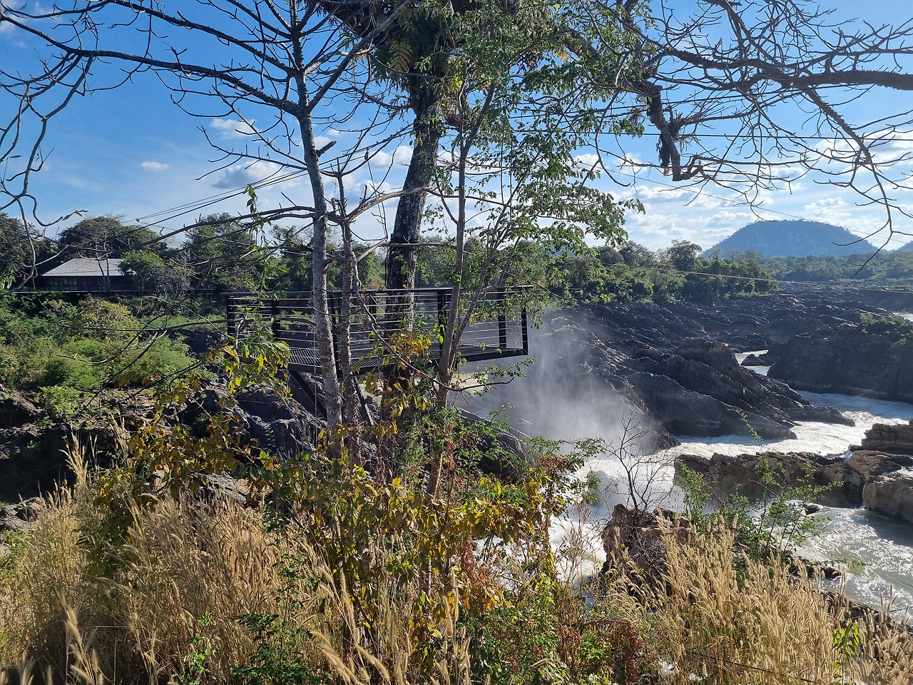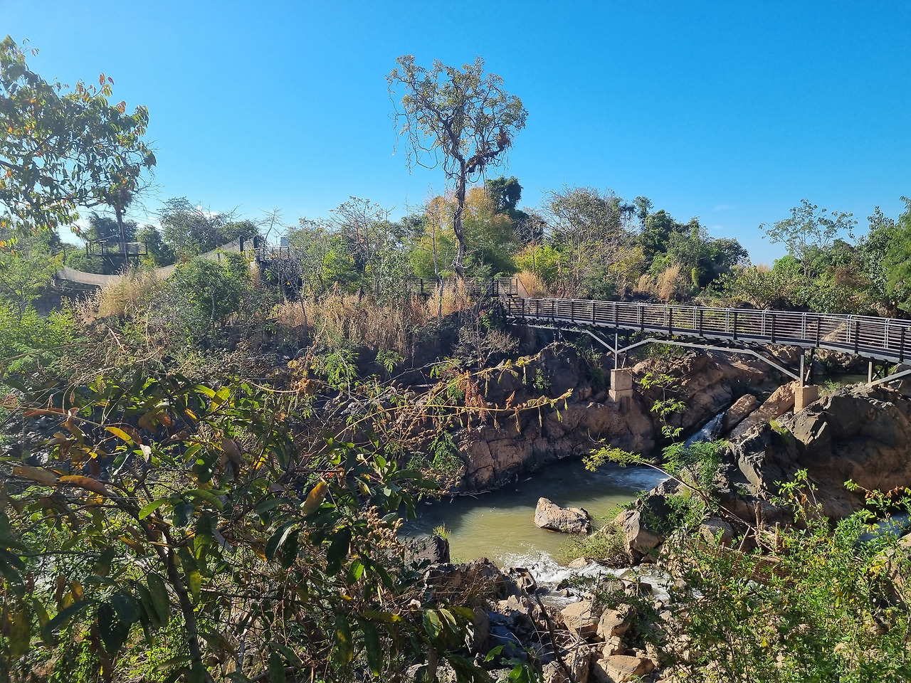 하류 방향으로 내려가는 길이 보인다. 지난번에 왔을 땐 그곳으로 갈 수 없었다. 덥지만 참고 그쪽으로 가보았다. 송파밋 폭포 위쪽으로 잔도를 설치해 놓았다. 이전엔 없었던 시설물인데, 아주 최근에 설치된 것 같다. 잔도는 폭포 위를 지나 메콩강 안쪽까지 구불구불 연결되어 있다. 여긴 유료인 것 같다. 티켓 판매소에 물으니 20만 낍이라 한다. 뭐가 이리 비싸나!. 사실 20만 낍이라면 13,000원 정도에 불과하다. 그렇지만 이곳 물가 수준에 익숙해지다 보면 아주 큰돈처럼 느껴진다. 비싸다는 느낌이 들어 잠시 망설였으나, 그래도 여기까지 왔으니 보고 가는 게 좋겠지.