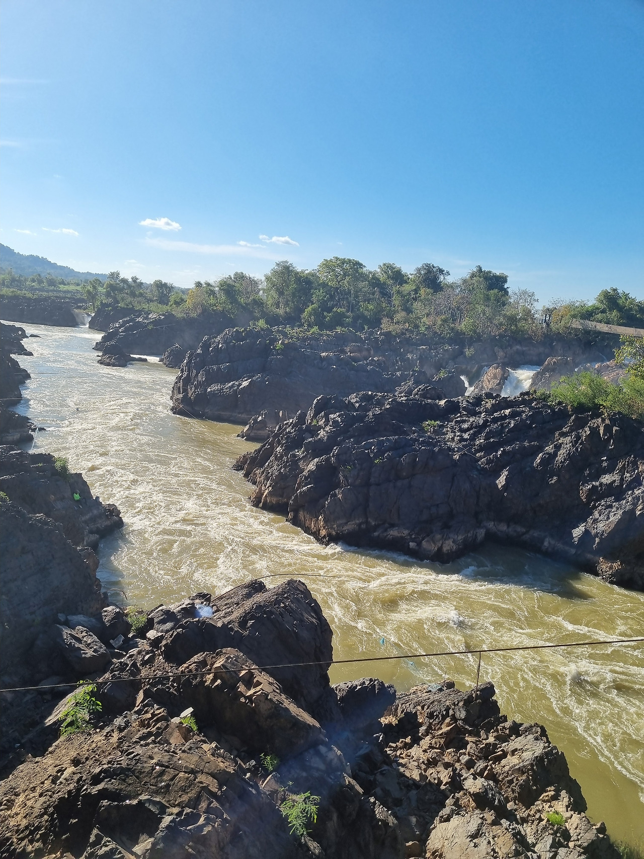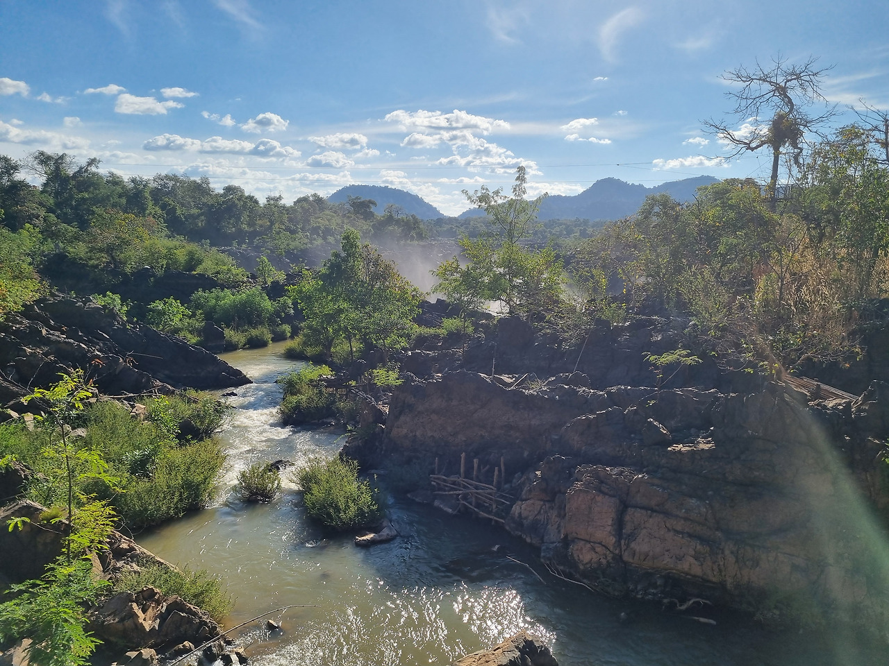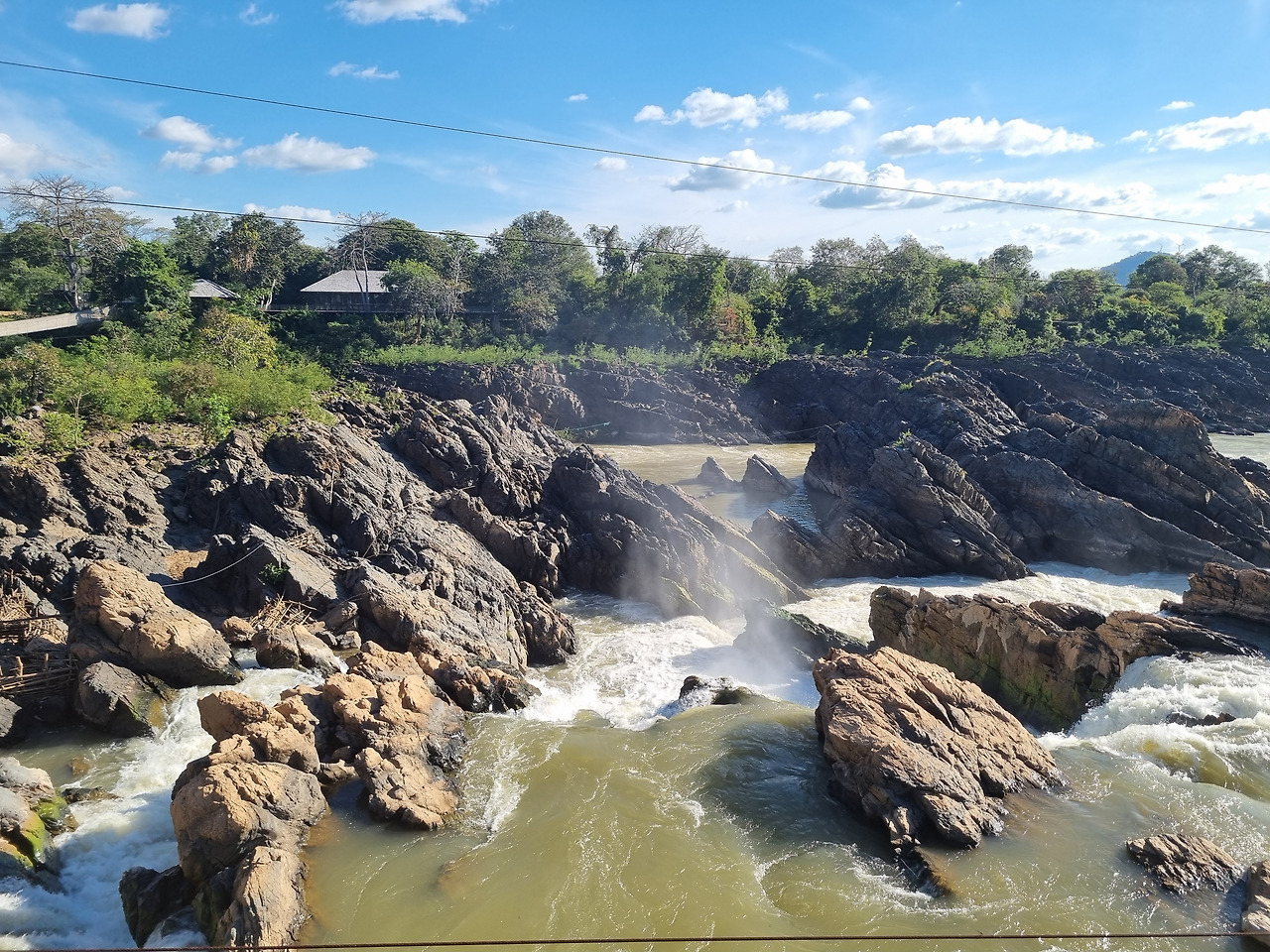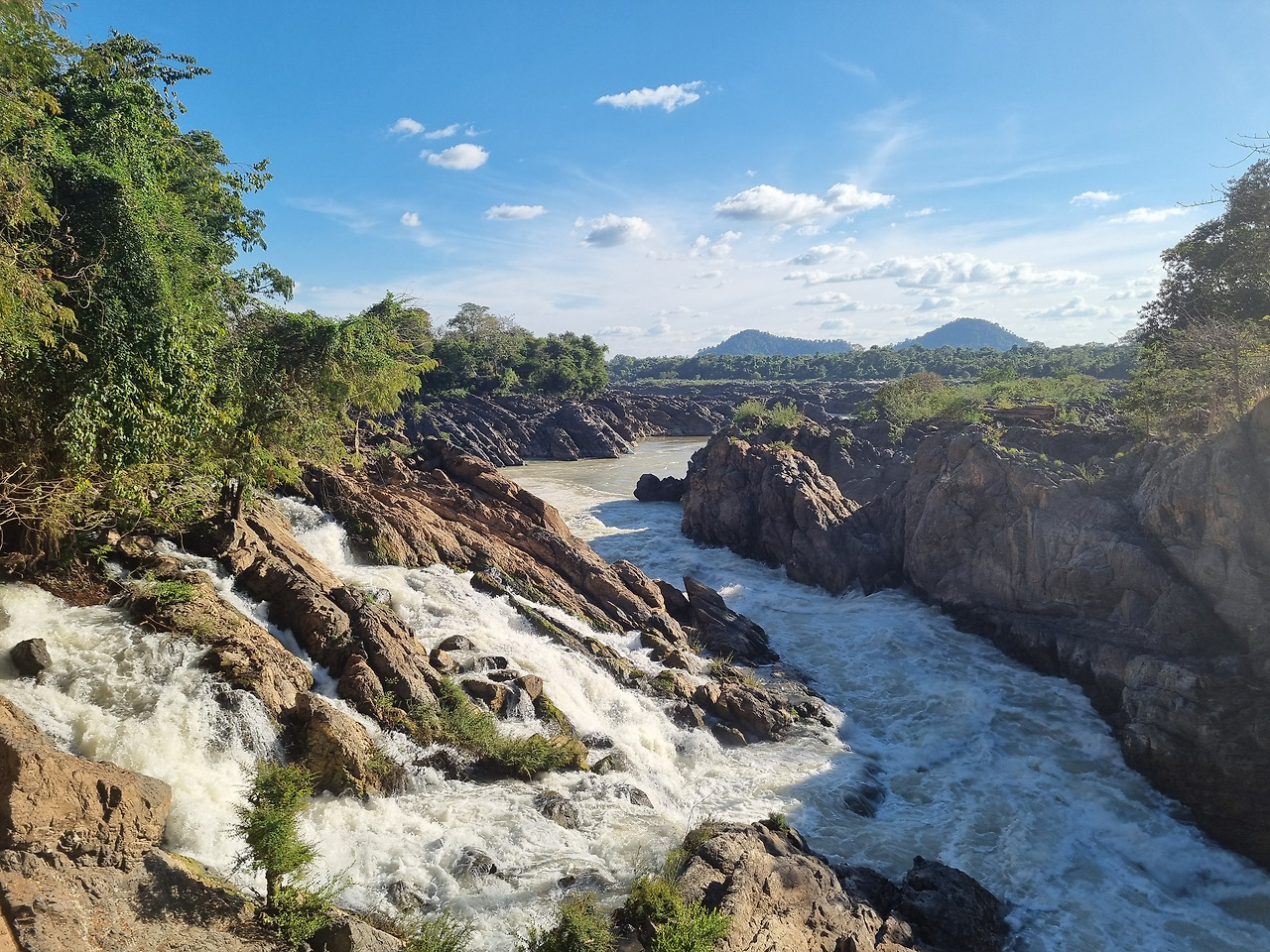 메콩강 위를 걸으니 아래로 급류가 흐르고 크고 작은 폭포에서 물줄기가 쏟아진다. 송파밋 폭포는 하나의 폭포가 아니다. 메콩강이라는 큰 강이 이 지역에서 갑자기 낮아졌기 때문에 여러 형태의 크고 작은 폭포가 수십, 수백 개 생긴 것이다. 잔도는 그런 폭포 위를 지나고 있는 것이다. 여기가 바로 송파밋 폭포의 진짜 모습이다. 보이는 광경마다 입을 다물지 못할 만큼 아름답고 또 웅장하다. 잔도의 길이는 500미터쯤 되는 것 같다.