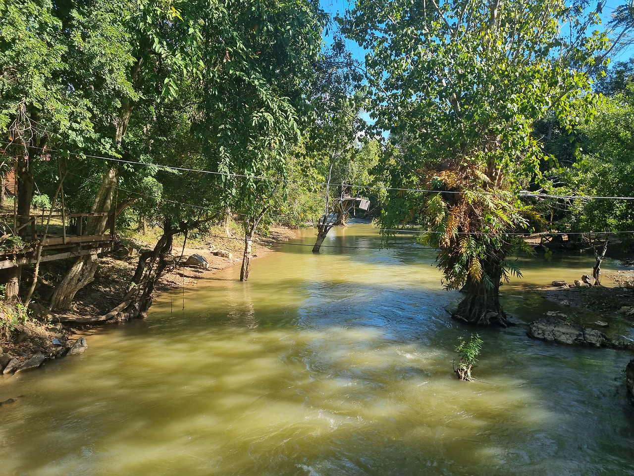 2년 전엔 포장이 파손된 구간이 많았는데, 지금은 시멘트로 깨끗하게 정비되어 있다. 아래쪽으로 향해 달리면 곧 돈뎃과 돈콘을 연결하는 다리가 나온다. 이 다리에 오르면 양쪽으로 절경이 펼쳐진다. 거친 물살이 흐르는 강 양 옆으로 아름다운 집들이 그림처럼 늘어서있다. 다리를 건너자마자 오른쪽 길로 들어서서 2킬로 남짓 달리면 송파밋 폭포가 나온다. 송파밋 폭포는 공원화되어 있어 3만 낍의 입장료를 받는다. 밖에 오토바이를 주차한 후 들어갔다.