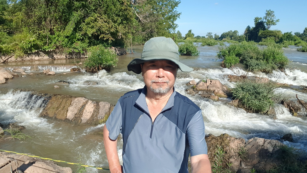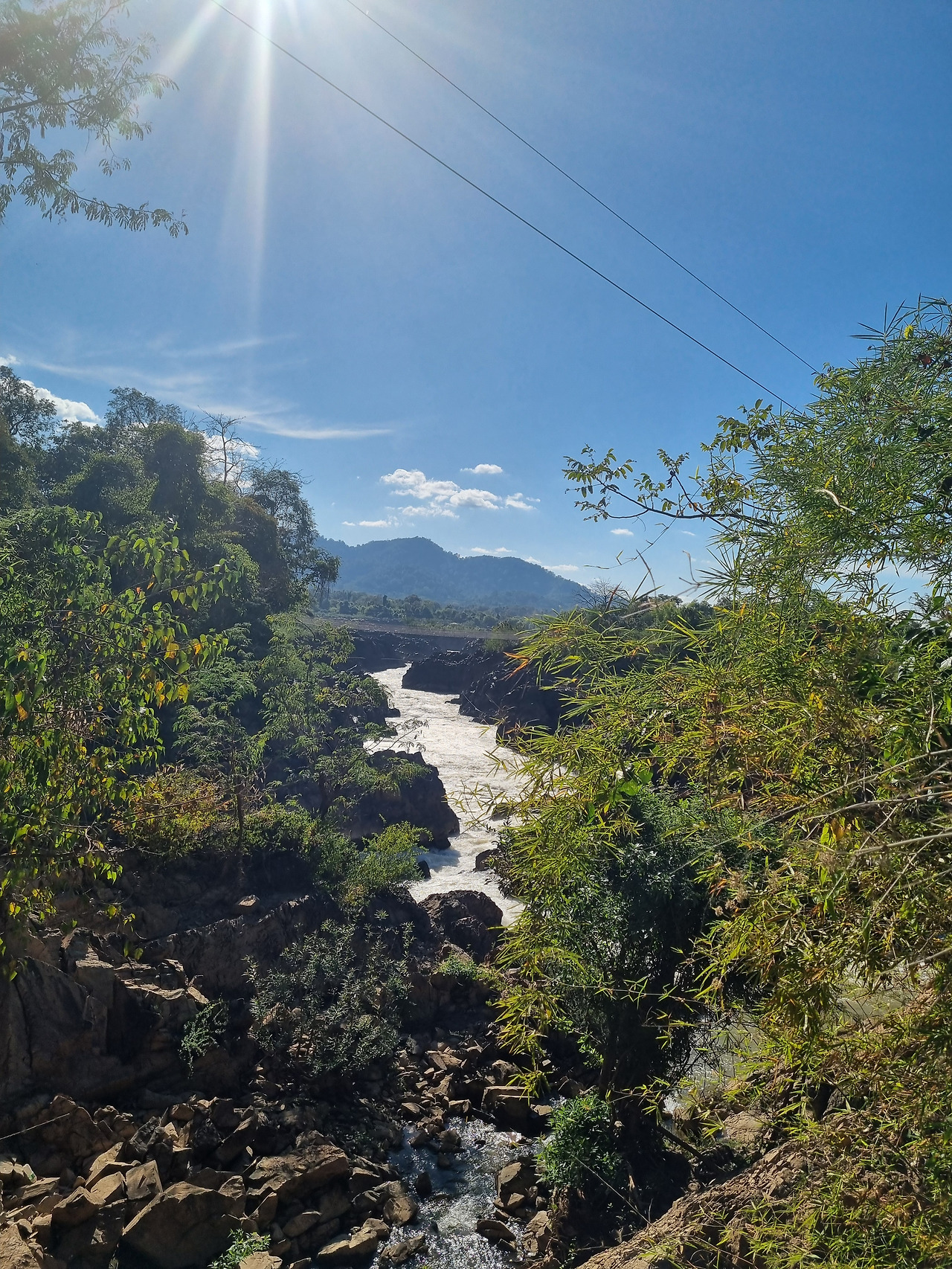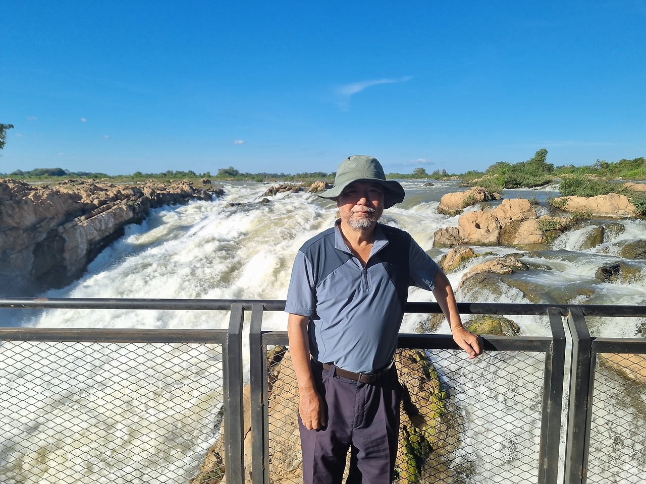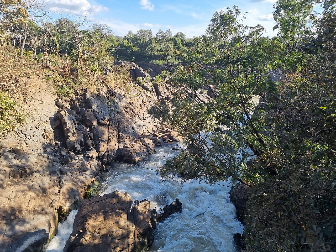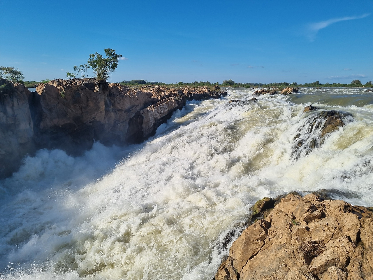 폭포가 굉음을 내며 쏟아진다. 이곳은 메콩강 줄기에서 여러 형태로 조금의 낙차가 생긴 구간이다. 그래서 폭포라 하지만 높이는 그다지 높지 않다. 기껏해야 몇 미터 정도이다. 그렇지만 메콩강의 풍부한 수량이 넓은 면적에 걸쳐 떨어지고 있어 장관을 이룬다. 전에도 왔기 때문에 익숙한 광경이지만 몇 번을 보아도 감동적이다. 강물의 서늘함이 느껴지지만 햇빛은 너무나 강렬하다. 이곳의 우기는 6~10월이며 지금은 건기이다. 우기에 메콩강물이 풍부할 때는 정말 장관을 이룰 것 같다.
