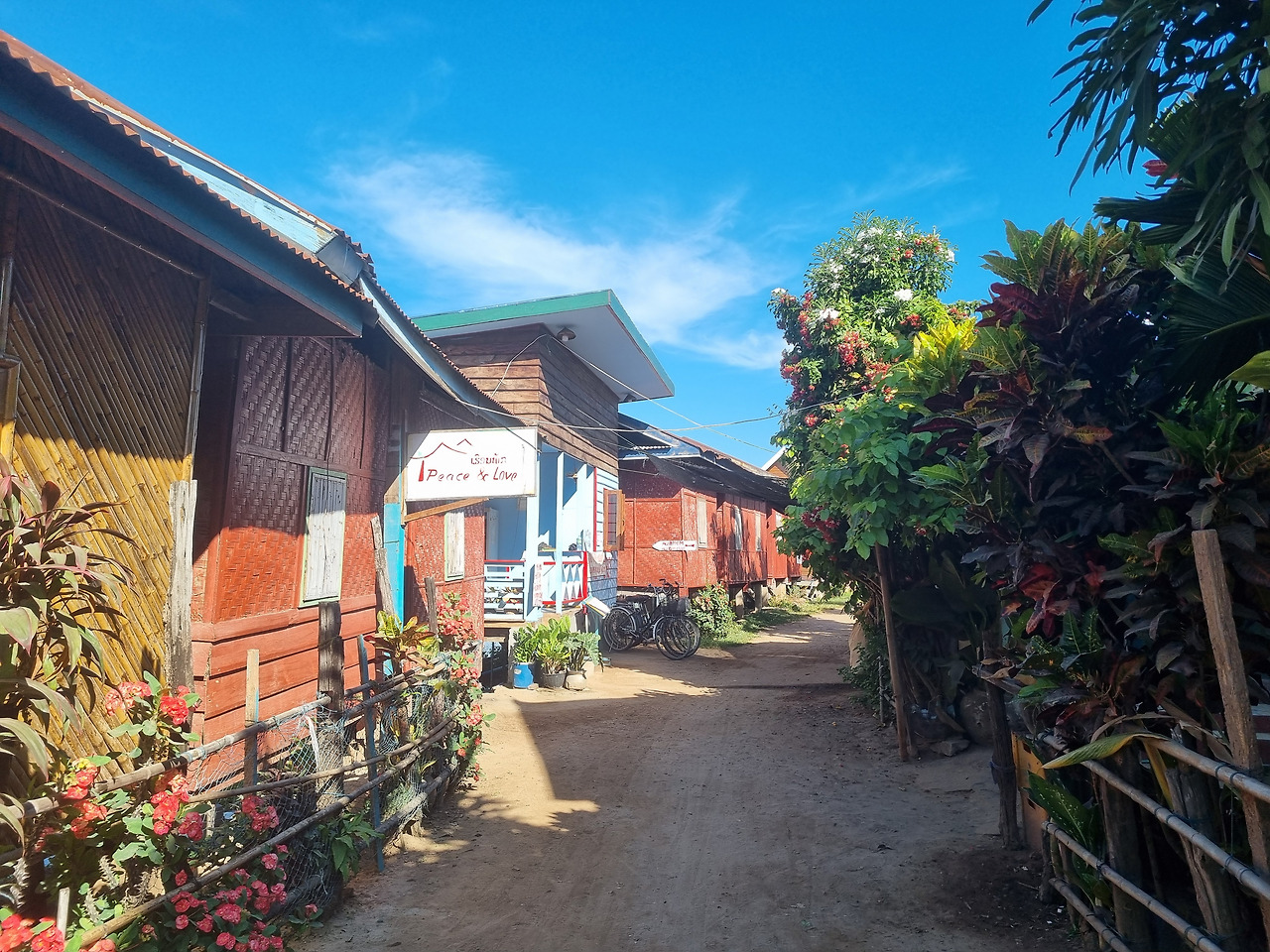 선착장까지 걸어갔다. 이른 아침이라 그런지 햇빛도 따갑지 않고 공기도 선선하다. 상쾌하기 그지없다. 2년 전에도 이곳에 왔던 터라 마을 풍경에도 익숙하다. 참 예쁜 동네이다. 이곳 식당에서 밥을 먹으면 메콩강 풍경은 거저 따라온다. 선셋 방향으로 갔다. 이쪽은 처음이다. 선라이즈 방향은 길이 모두 포장되어 있는데, 이쪽은 흙길이다. 좁은 흙길 양쪽으로 들어선 집들은 마치 동화나라를 연상케 한다. 배가 고프다. 망고 주스를 한 컵 사서 마시며 동네구경을 했다.