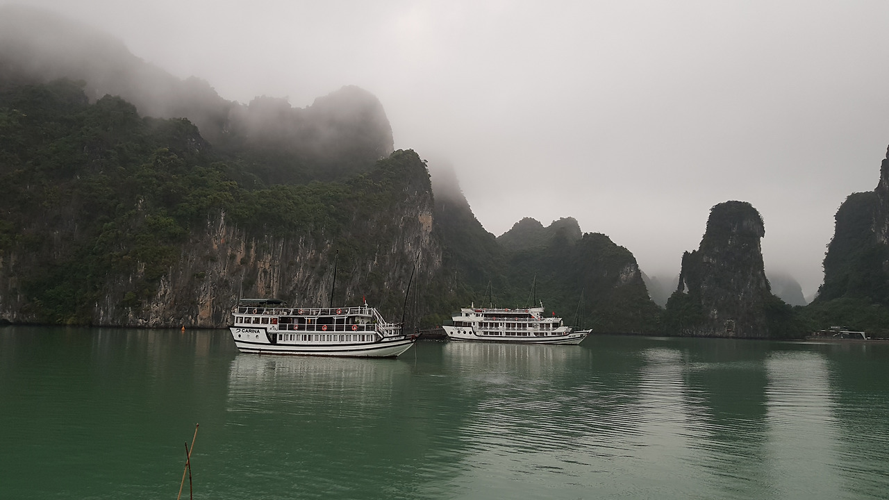 날이 뿌옇게 밝아 오길래 세수를 하고 갑판 위 선상 바로 올라갔다. 가이드가 미리 와 있다. 비가 뿌리고 있어 천막 밑으로 비를 피했다. 어제 하루를 겪어보았지만 참 성실한 친구다. 30대 중반쯤 되어 보이는데, 손님들에게 성심을 다하려는 모습이 보인다. 그리고 외국인들에게 베트남을 알리려고 아주 애를 쓴다. 베트남의 문화나 베트남의 현실, 그리고 앞으로의 베트남의 변화에 대해 외국 손님에게 하나라도 더 말하고 싶어 한다.