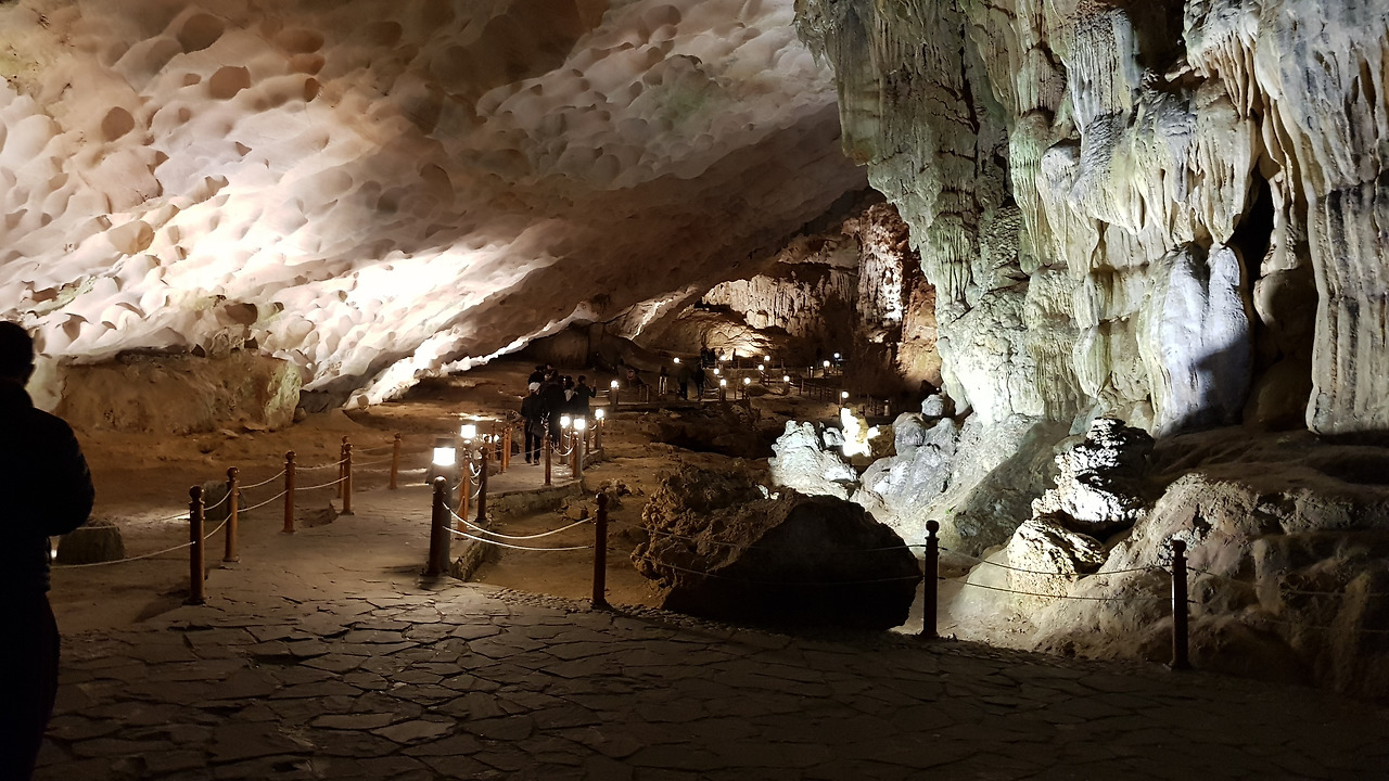 산길 가파른 계단을 올라가 산 중턱에 이르니 거대한 동굴이 입을 벌리고 있다. 동굴을 들어서자마자 넓은 광장이 나타난다. 천정도 무척 높다. 동굴은 오밀조밀하게 연결되면서 갖가지 형상을 보여준다. 순로(順路)를 따라 약 30분간 동굴 투어가 계속되었다. 조금 높낮이가 있는 곳은 계단으로 연결되는데, 돌을 가져와서 계단을 만든 것이 아니라 바닥을 그냥 깎아서 만든 것 같다. 이 동굴도 무척 아름답다. 그렇지만 베트남에 와서 이미 많은 좋은 동굴을 보았기 때문에 감동은 덜하다.