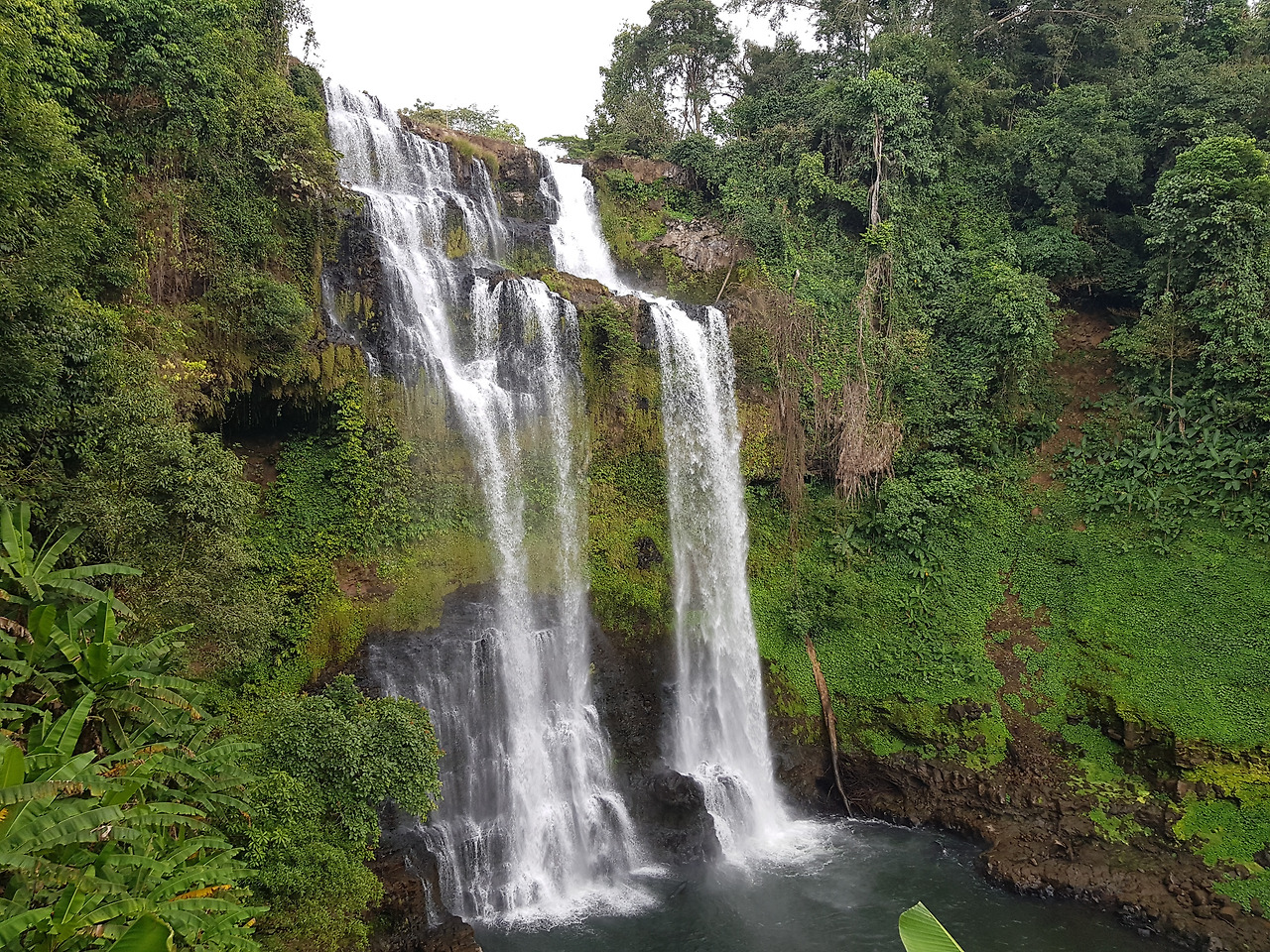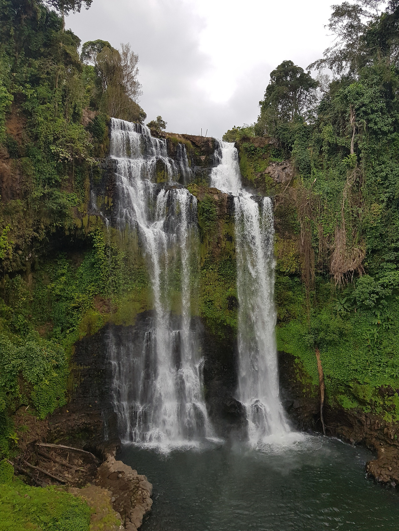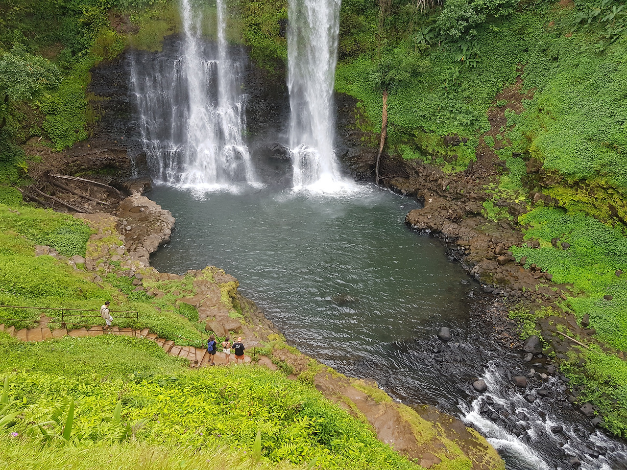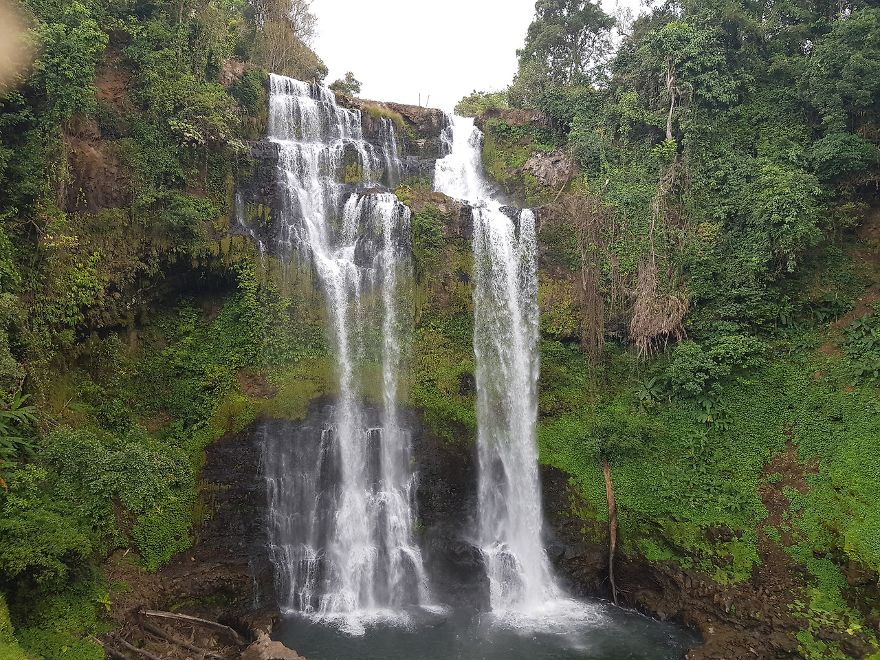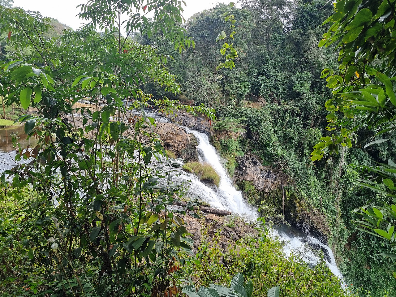 나무다리를 다시 되돌아 나와 아래쪽으로 좀 내려가면 폭포의 전체 모습을 내려다볼 수 있다. 타드 팡 폭포에 비해 높이는 낮으나 물줄기가 굵어 훨씬 웅장하다. 아주 멋진 폭포다. 5만 낌의 입장료를 받을 만하다는 생각이 든다. 타드팜 폭포에 비해 훨씬 좋다. 열대림 속에서 흘러내리는 폭포는 마치 판타지 세상 같다. 아래쪽에 전망대가 보이고 그쪽으로 가는 아주 좁고 가파른 길이 보인다. 여기까지 왔으니 가보자.