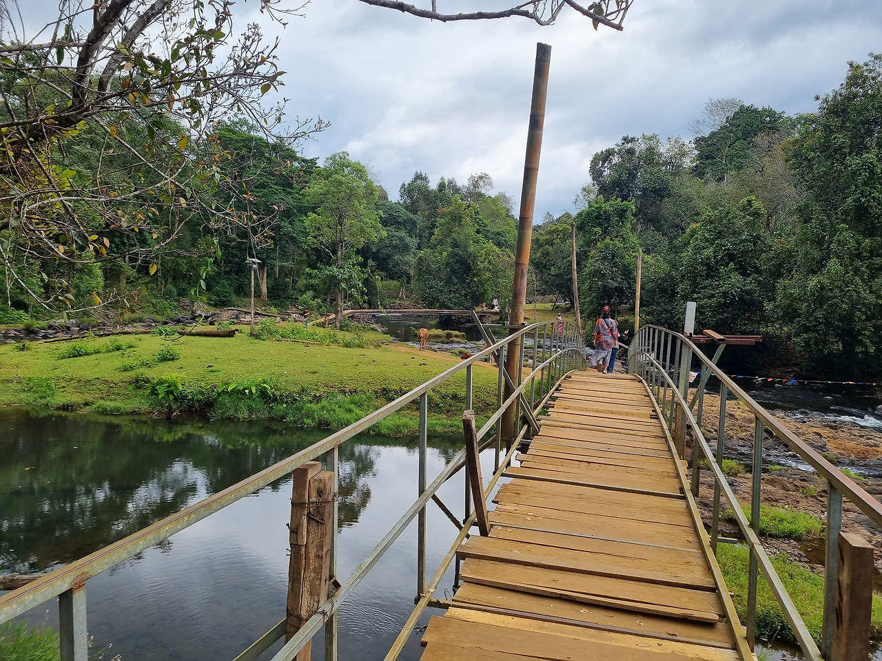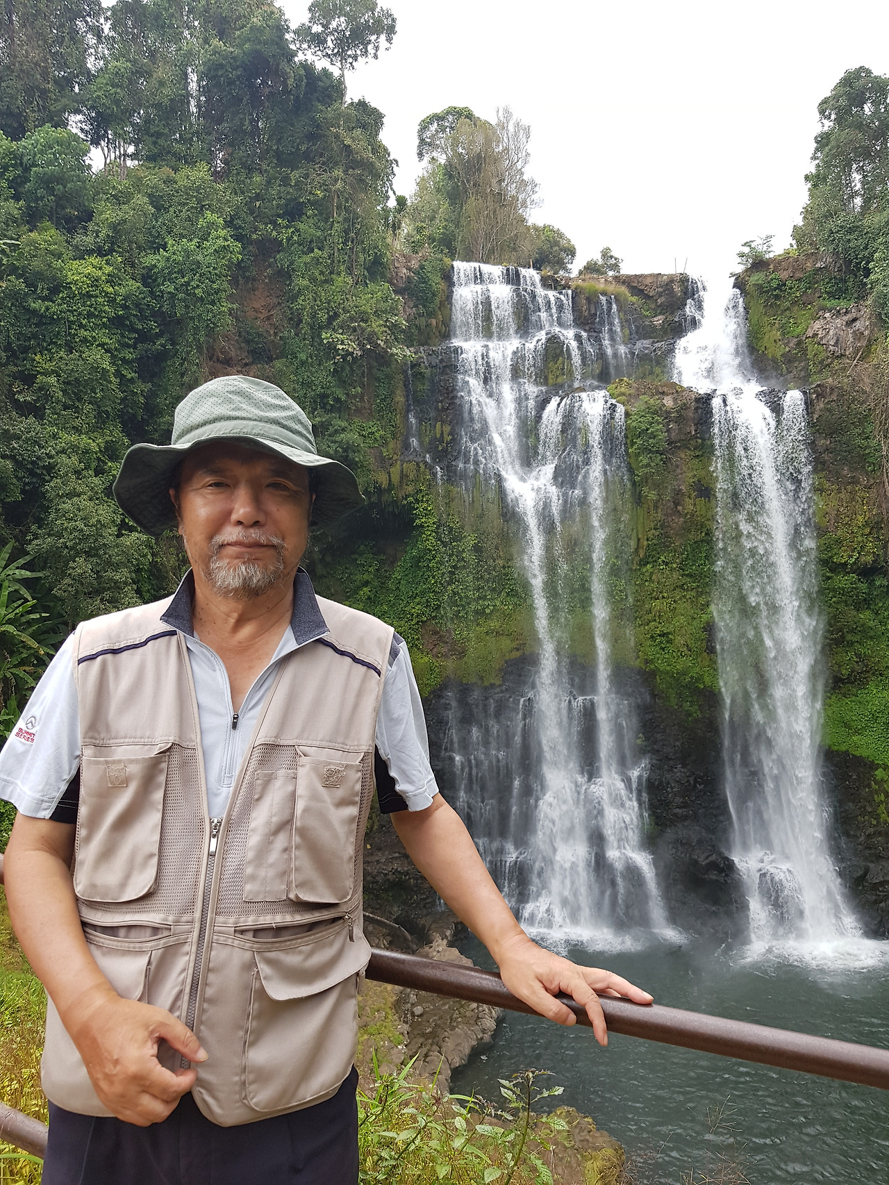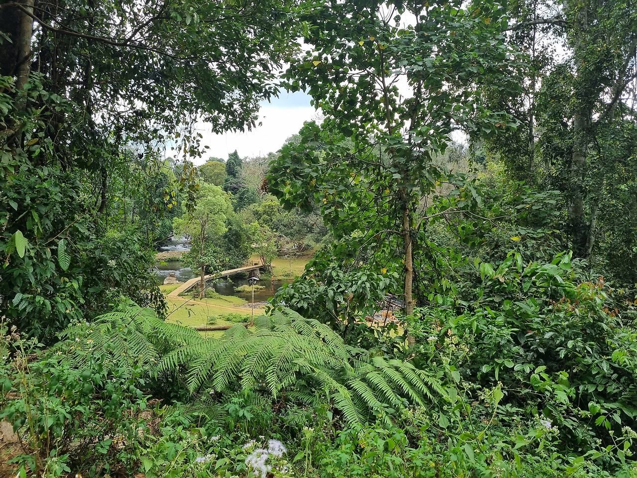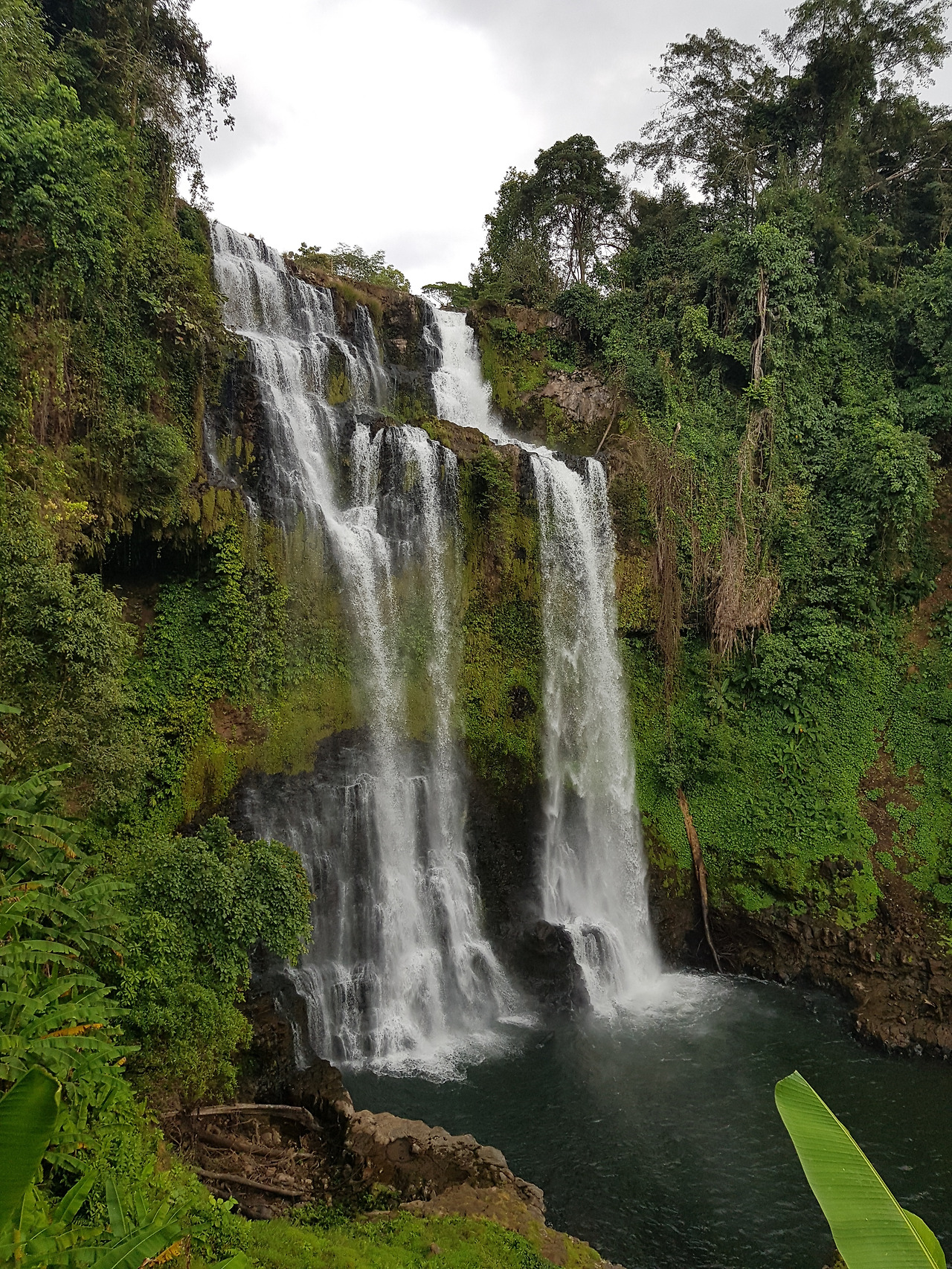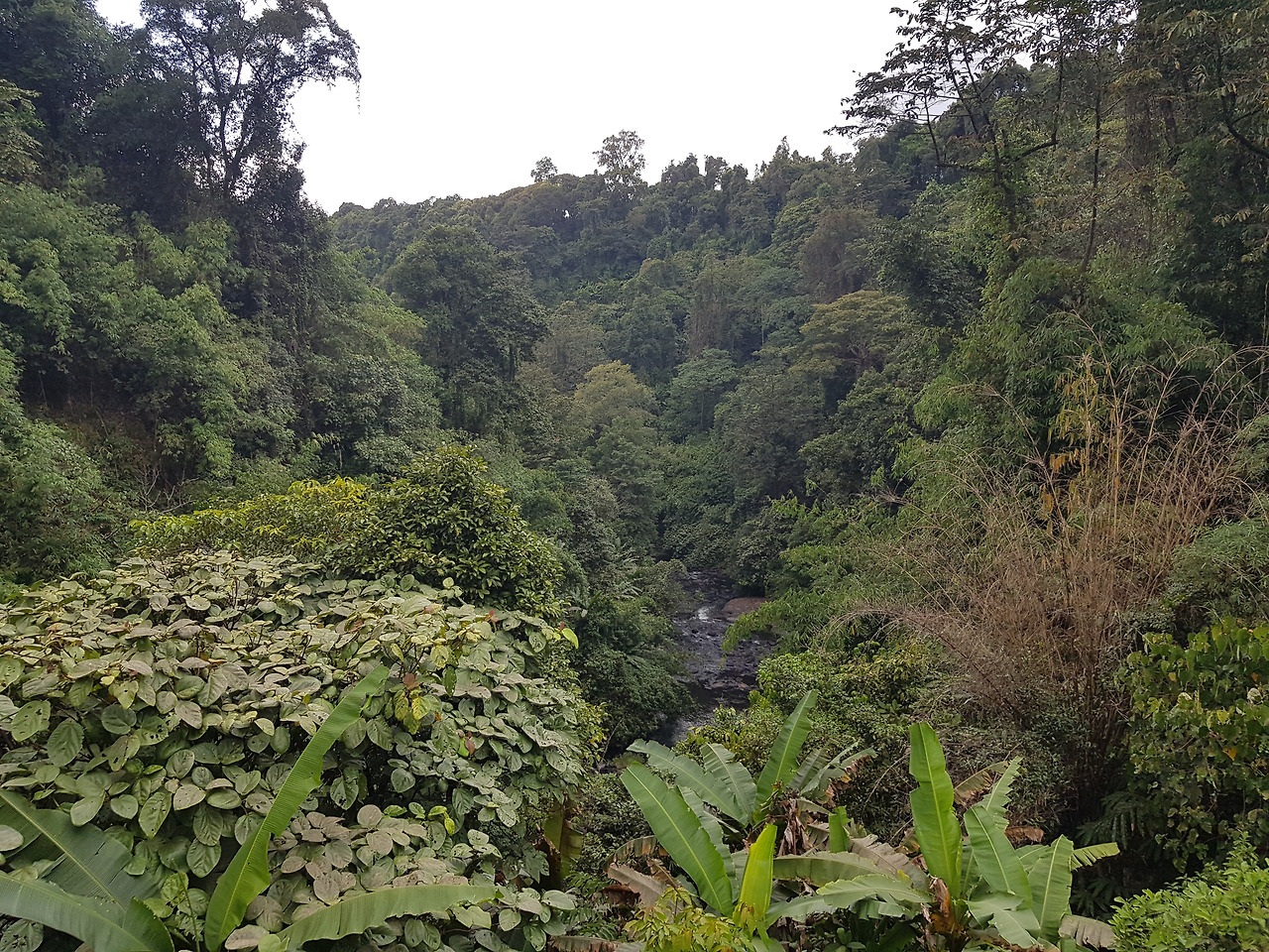 나무다리를 다시 되돌아 나와 아래쪽으로 좀 내려가면 폭포의 전체 모습을 내려다볼 수 있다. 타드 팡 폭포에 비해 높이는 낮으나 물줄기가 굵어 훨씬 웅장하다. 아주 멋진 폭포다. 5만 낌의 입장료를 받을 만하다는 생각이 든다. 타드팜 폭포에 비해 훨씬 좋다. 열대림 속에서 흘러내리는 폭포는 마치 판타지 세상 같다. 아래쪽에 전망대가 보이고 그쪽으로 가는 아주 좁고 가파른 길이 보인다. 여기까지 왔으니 가보자.