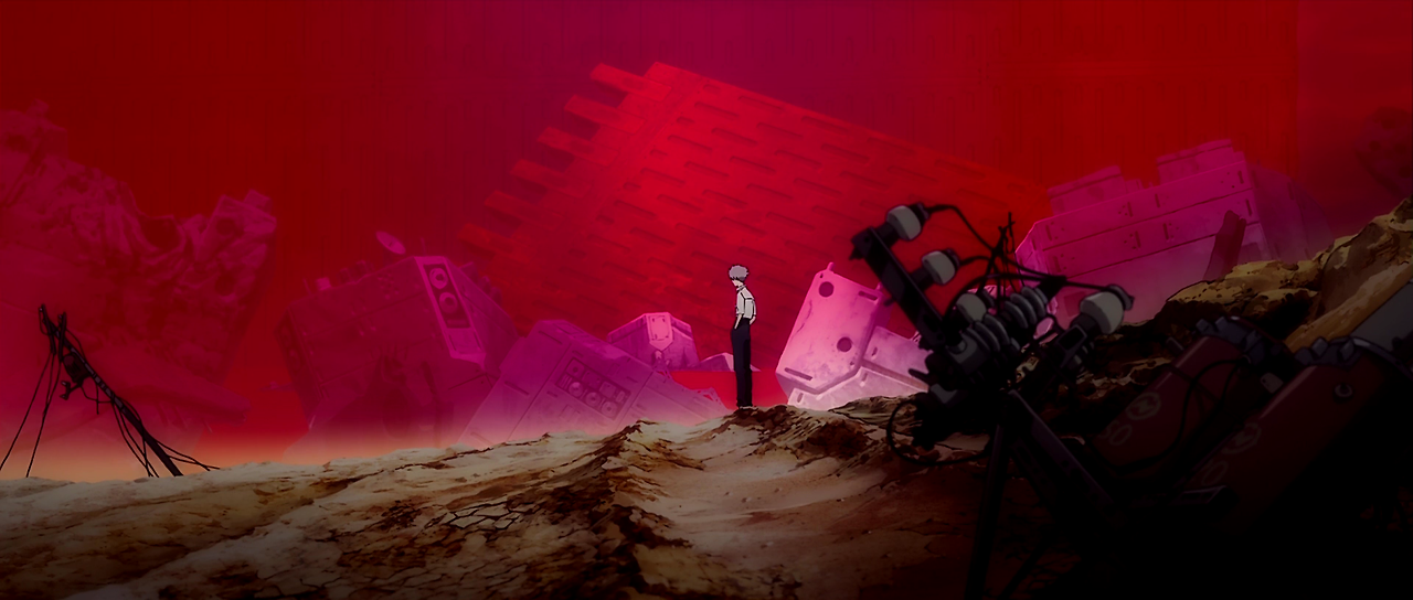 지표에 있던 제3 신도쿄시가 사라져 황폐화된 네르프 본부로 돌아온 신지는 에바 마크 09에서 내린 레이를 다시 만나고, 아버지인 이카리 겐도로부터 나기사 카오루와 함께 에바 13호기에 타라는 명령을 받는다. 신지는 레이가 살아있는 것을 알고, 또 카오루와도 친해져 차츰 원기를 되찾는다. 그렇지만 신지는 자신이 일으킨 “니어 서드 임팩트”가 원인이 되어 이후 14년간 “서드 임팩트”가 일어나 지구의 한쪽이 붉은색으로 황폐화되었다는 것, 그리고 지금 네르프에 있는 레이는 복제체이며 자신이 알고 있는 레이는 아작 초호기 속에 있다는 사실을 알고 절망한다.