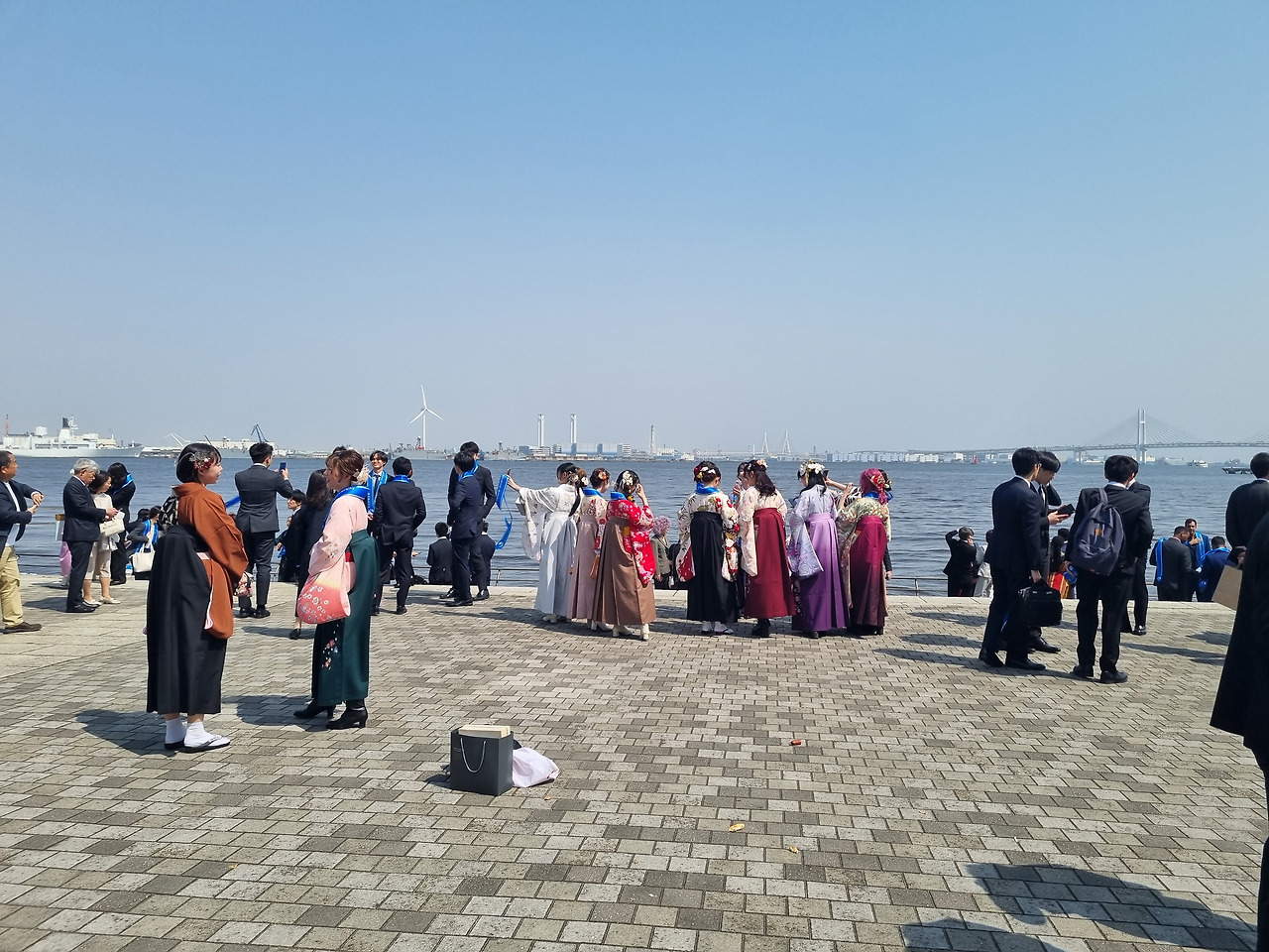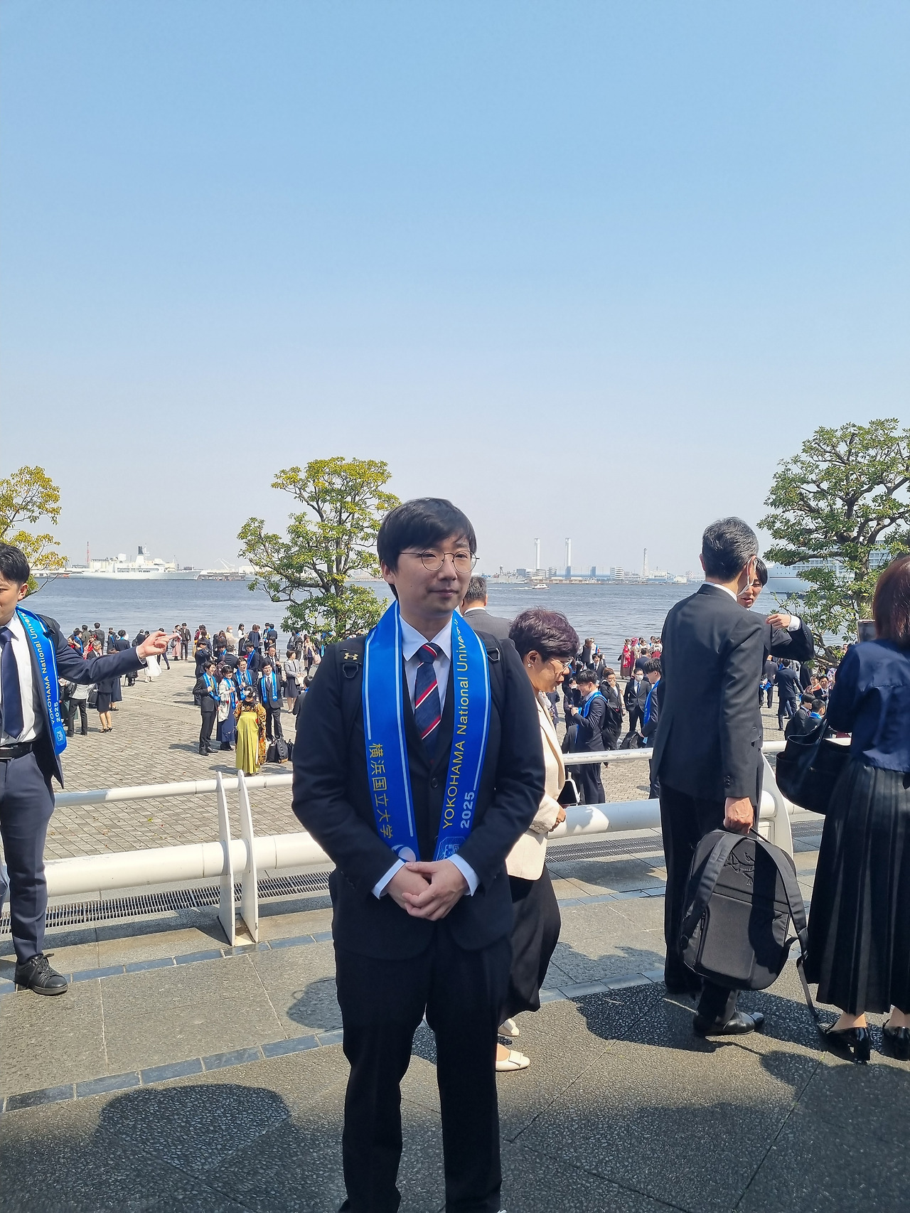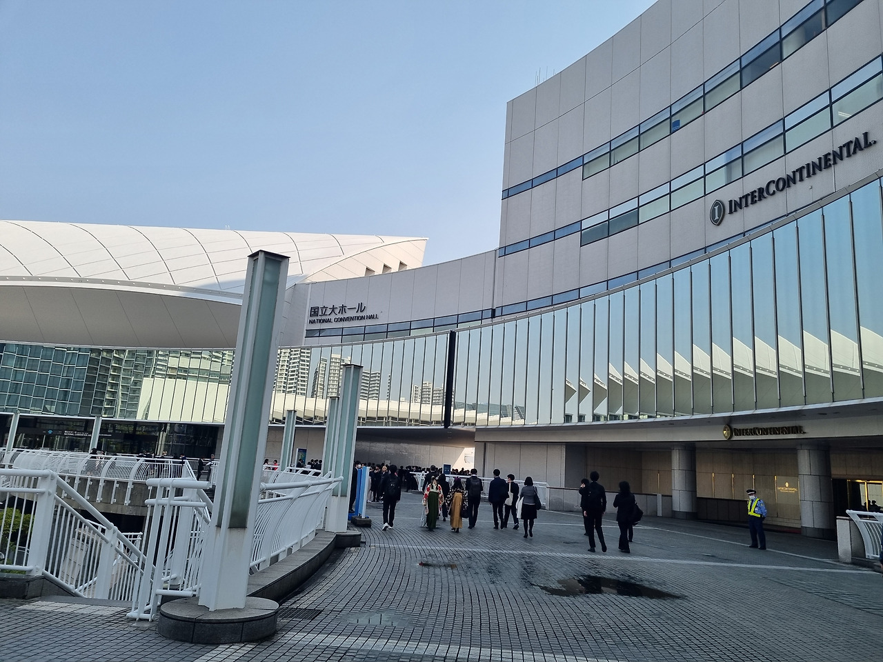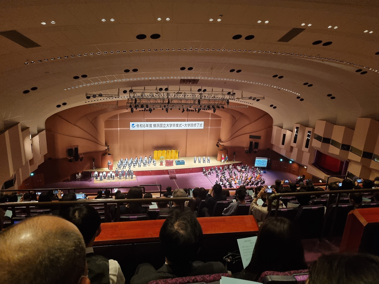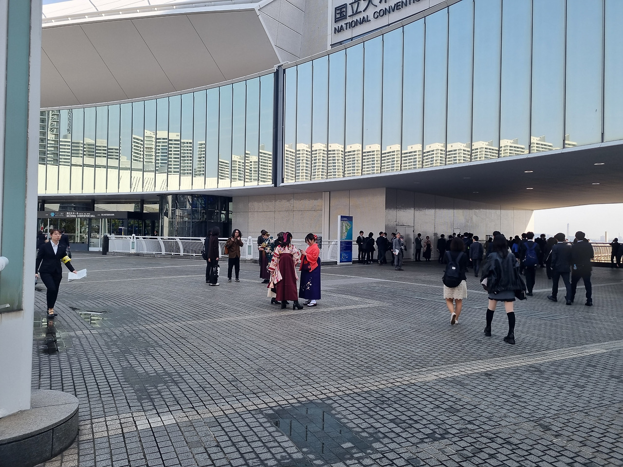 졸업식은 미나토 미라이 지역 내에 있는종합 컨벤션 센터인 "퍼시픽 요코하마" 안에 있는 "국립대홀"(国立大ホール)에서 거행된다. 국립대홀은 동일본 지역에 있는 유일한 국립 회의장으로서, 퍼시픽 요코하마의 메인 시설이다. 졸업식장으로 가는 길에 바다를 접한 지역에 세워진 여러 컨벤션센터, 상업시설, 운하, 거대한 관람차가 있는 놀이 공원 등이 보인다. 졸업식장에 도착하니 우리나라 대학 졸업식과는 여러 가지로 차이가 보인다.