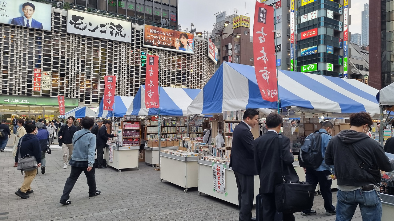 아들은 요코하마에서 호텔방을 구하지 못해 신바시(新橋)에서 호텔을 잡았다고 한다. 아들과 연락해 신바시역 광장에서 만나기로 하였다. 신바시 역에 도착하니 역 광장에서 뭔가 행사가 있는 것 같다. 헌책 전시판매 행사다. 많은 헌책 상인들이 가판대를 설치하고 헌책을 팔고 있다. 이들이 신바시 역 광장 전체를 차지하고 있다. 아들을 기다리면서 집사람이 근처 상가를 둘러보는 동안 나는 헌책들을 둘러보았다.