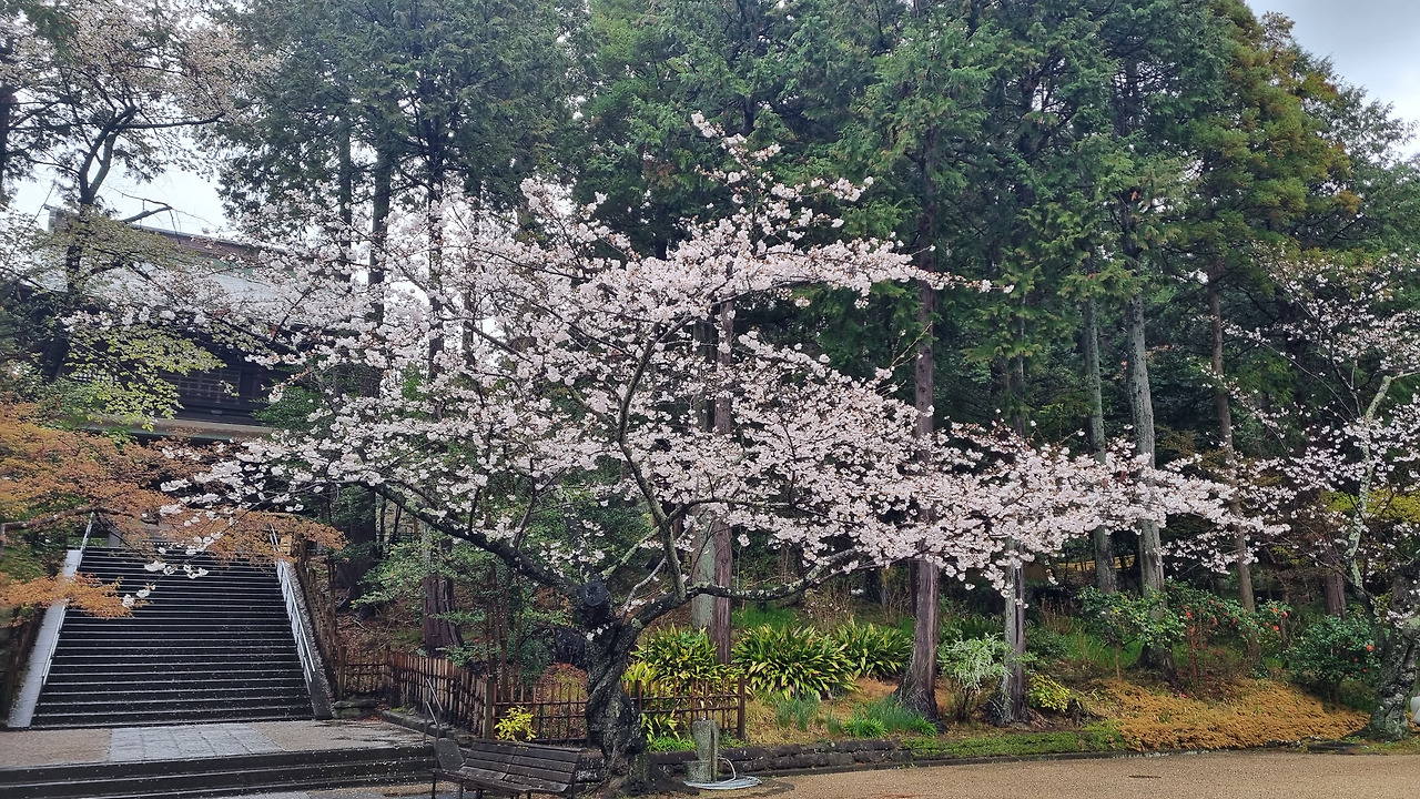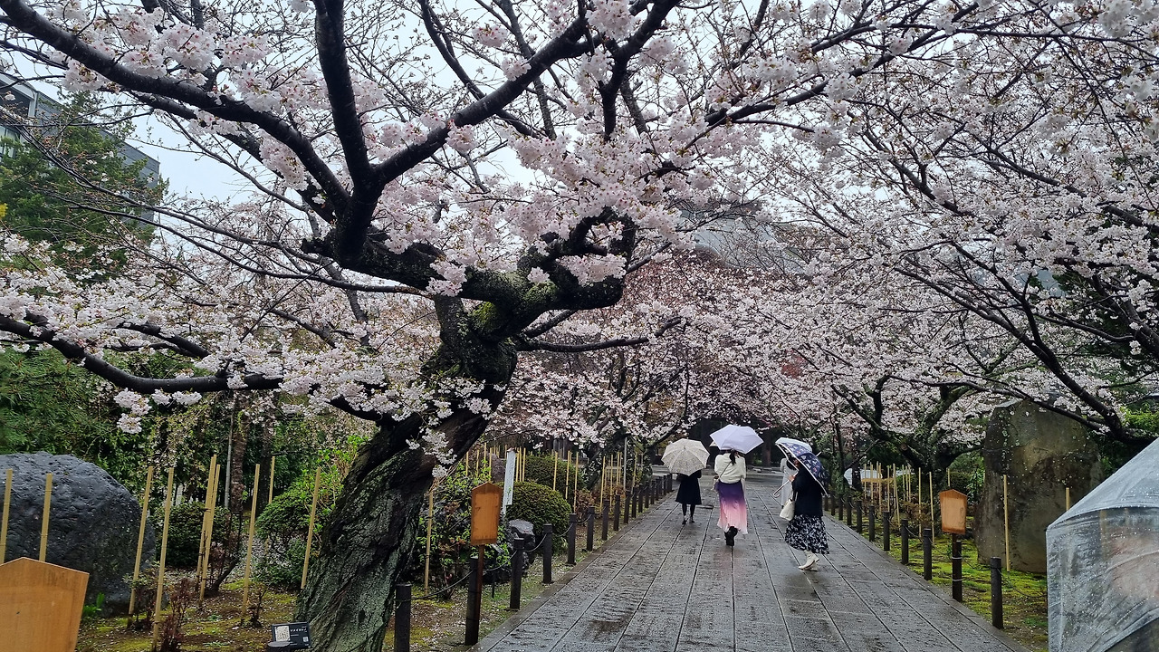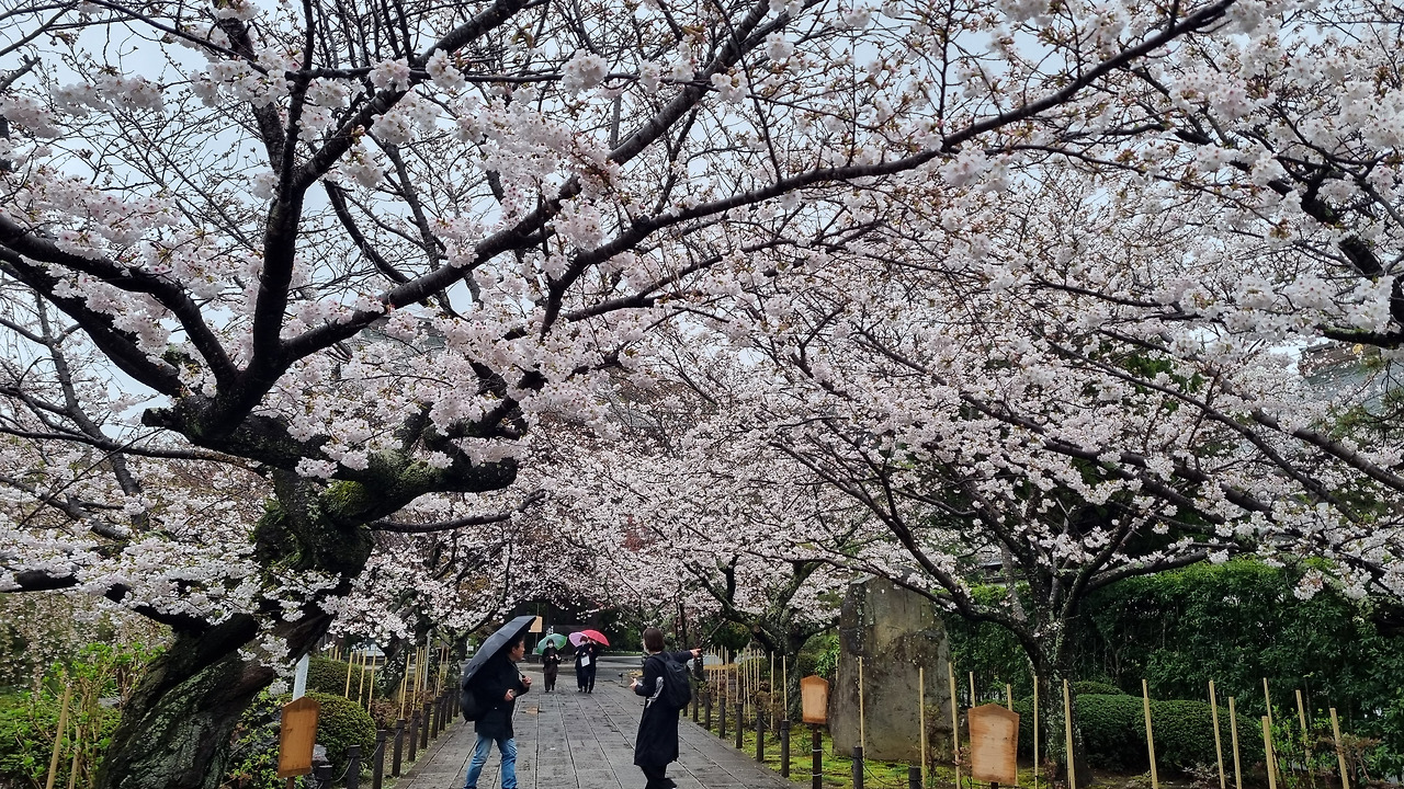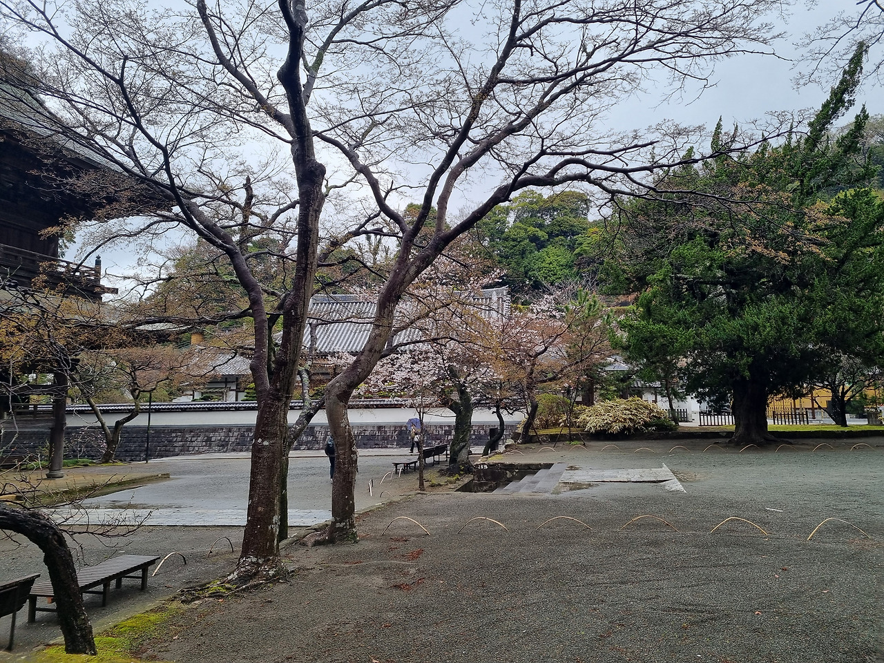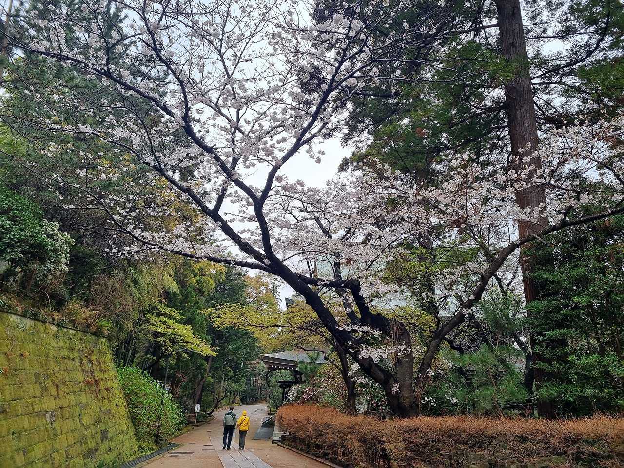 북가마쿠라 역에서 내리면 바로 옆에 엔카쿠지(円覚寺)라는 사찰이 위치하고 있다. 이 절은 가마쿠라 막부의 실권자였던 호죠 도키무내(北条時宗)가 창건했다고 한다. 800년의 역사를 가진 전통 있는 사찰이다. 입장료는 500엔, 경로요금은 없다. 입구로 들어가면 거대한 산문(山門)이 나온다. 산문을 지나면 사찰로 올라가는 길이 나온다. 아직도 비가 내린다. 추운 날씨인데도 불구하고 벚꽃이 활짝 피었다. 벚꽃 터널과 같은 그런 화려한 벚꽃이 아니다. 한 그루씩 서있는 고목에 청초하게 피어있는 꽃들이다.