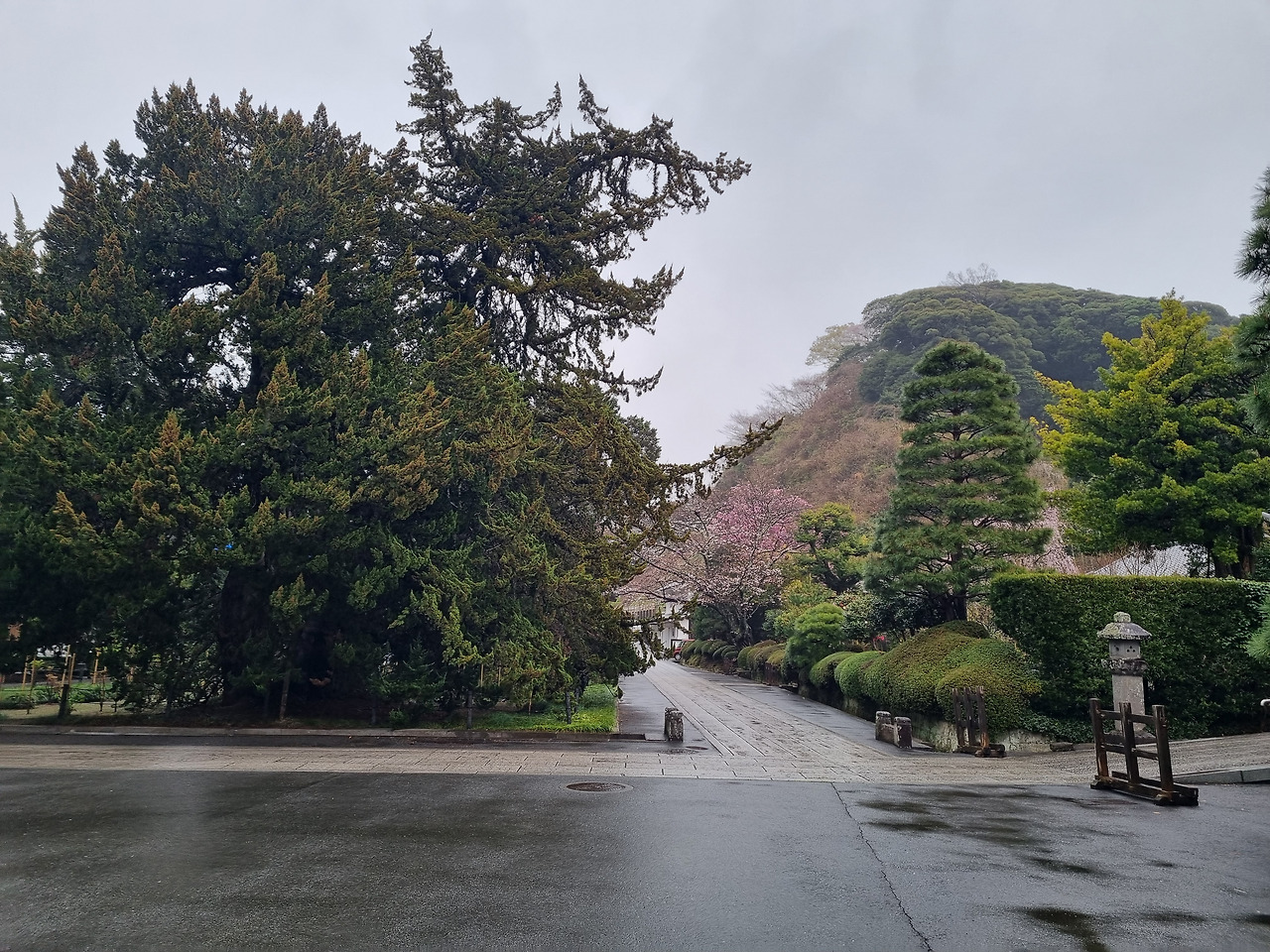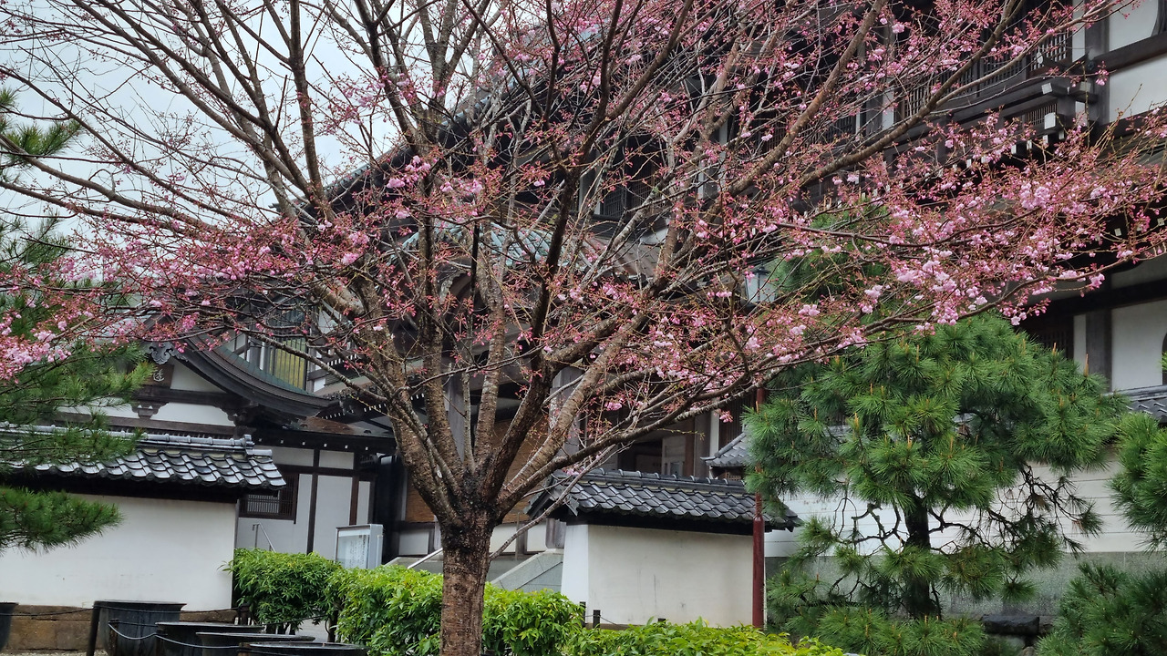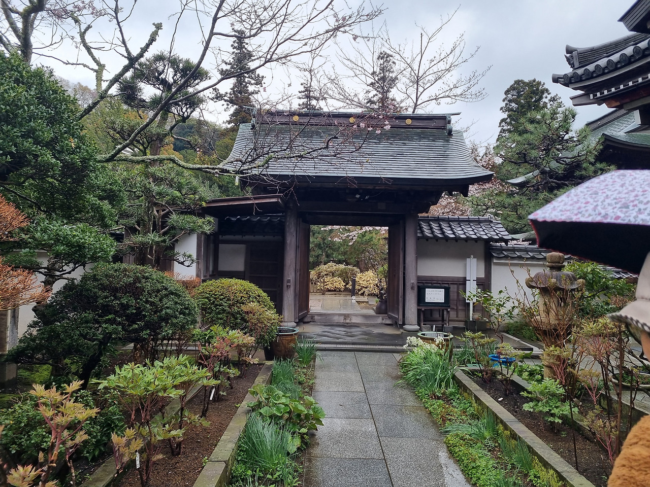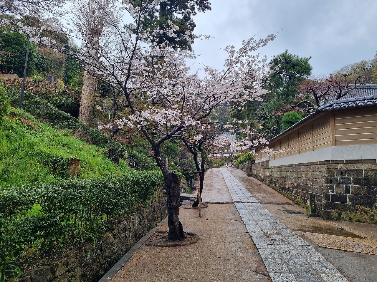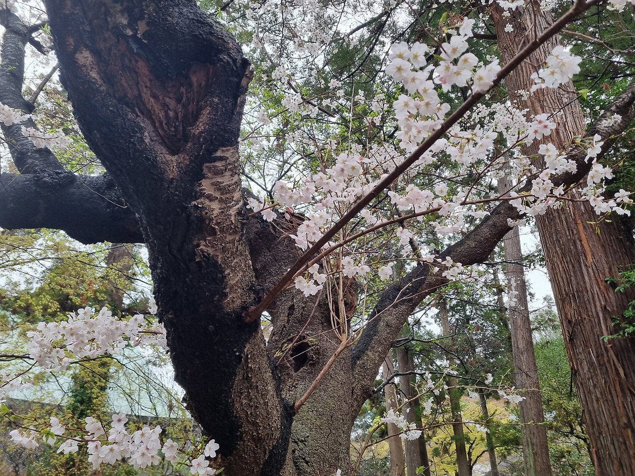북가마쿠라 역에서 내리면 바로 옆에 엔카쿠지(円覚寺)라는 사찰이 위치하고 있다. 이 절은 가마쿠라 막부의 실권자였던 호죠 도키무내(北条時宗)가 창건했다고 한다. 800년의 역사를 가진 전통 있는 사찰이다. 입장료는 500엔, 경로요금은 없다. 입구로 들어가면 거대한 산문(山門)이 나온다. 산문을 지나면 사찰로 올라가는 길이 나온다. 아직도 비가 내린다. 추운 날씨인데도 불구하고 벚꽃이 활짝 피었다. 벚꽃 터널과 같은 그런 화려한 벚꽃이 아니다. 한 그루씩 서있는 고목에 청초하게 피어있는 꽃들이다.