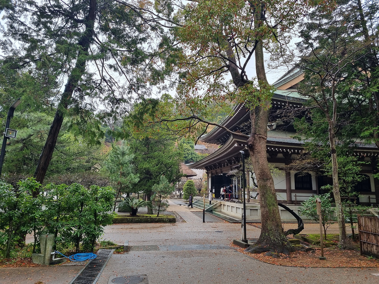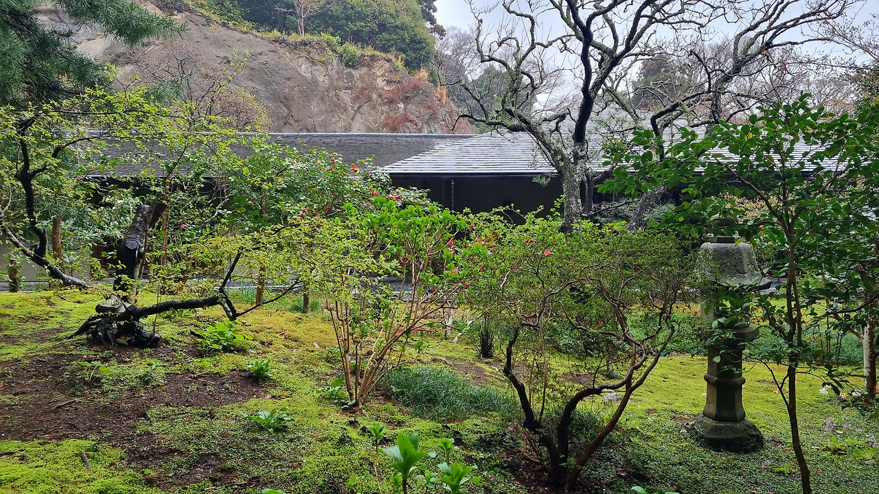 길을 오르다 보니 왼쪽 옆으로 작은 전각과 아름다운 정원이 보인다. 정원에는 잘 다듬은 나무와 꽃들이 보인다. 비 오는 날씨라 하늘은 우중충하며 회색빛이다. 맑은 날이었으면 꽃들이 더 아름다웠을 텐데 아깝다. 다시 본전 쪽으로 길을 오른다. 일본의 사찰은 대개 규모가 크다. 엔카쿠지 역시 넓은 부지에 자리 잡고 있으며 건물도 웅장하다. 그렇지만 일본 사찰은 건물보다는 정원과 나무가 볼만하다.