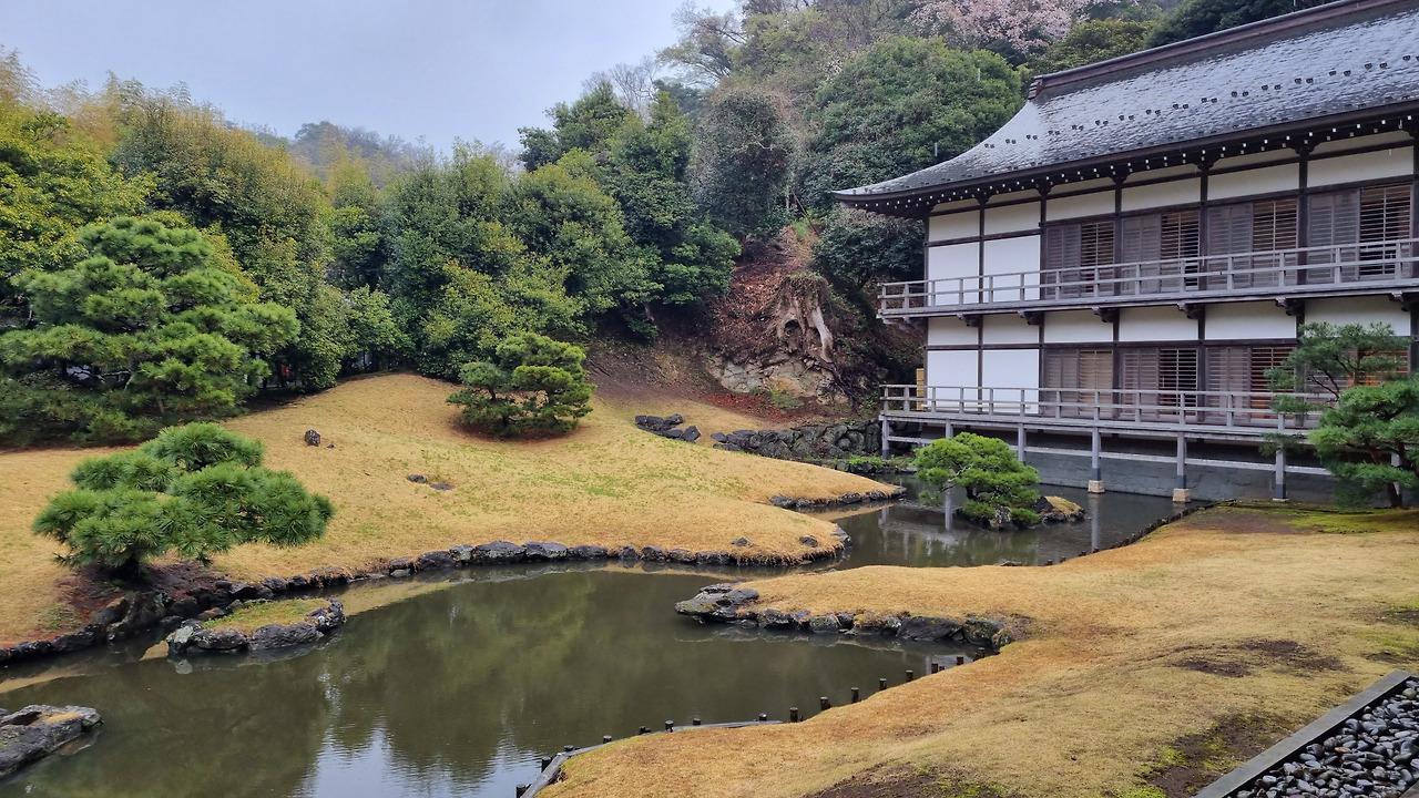 안쪽에 정원이 있다고 한다. 큰 건물에 신발을 벗고 들어가 긴 나무 복도를 따라 건물 뒤쪽으로 가면 정원이 나온다. 마루에 앉아 감상할 수 있도록 한 정원이다. 이런 종류의 정원은 대개 수목을 중심으로 하거나, 아니면 작은 자갈과 모래를 이용하여 바다풍경을 묘사한 경우가 많은데, 이 정원은 특이하게도 연못이 정원의 대부분을 차지하고 있다. 날씨가 추워 마루에 앉아 정원을 감상할 마음의 여유가 없다.