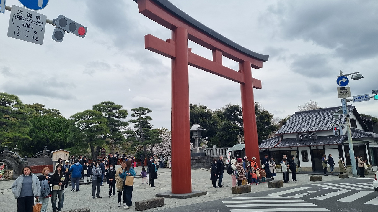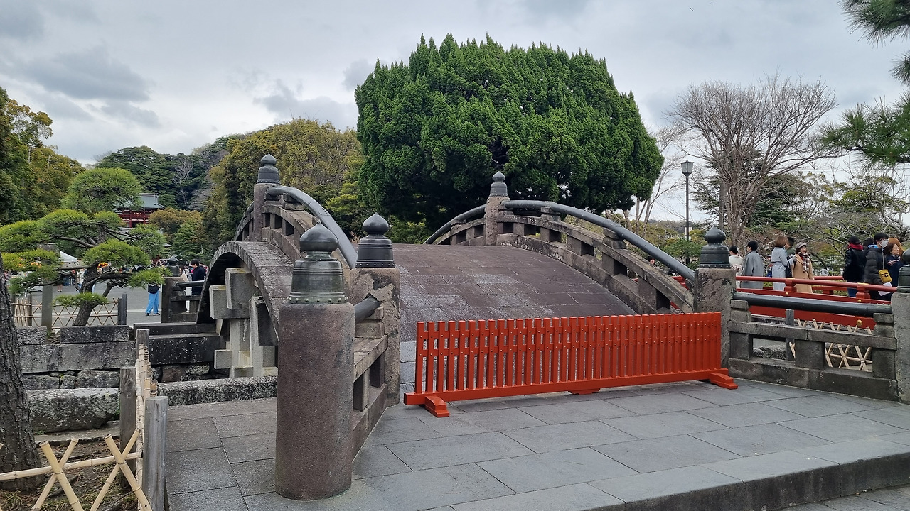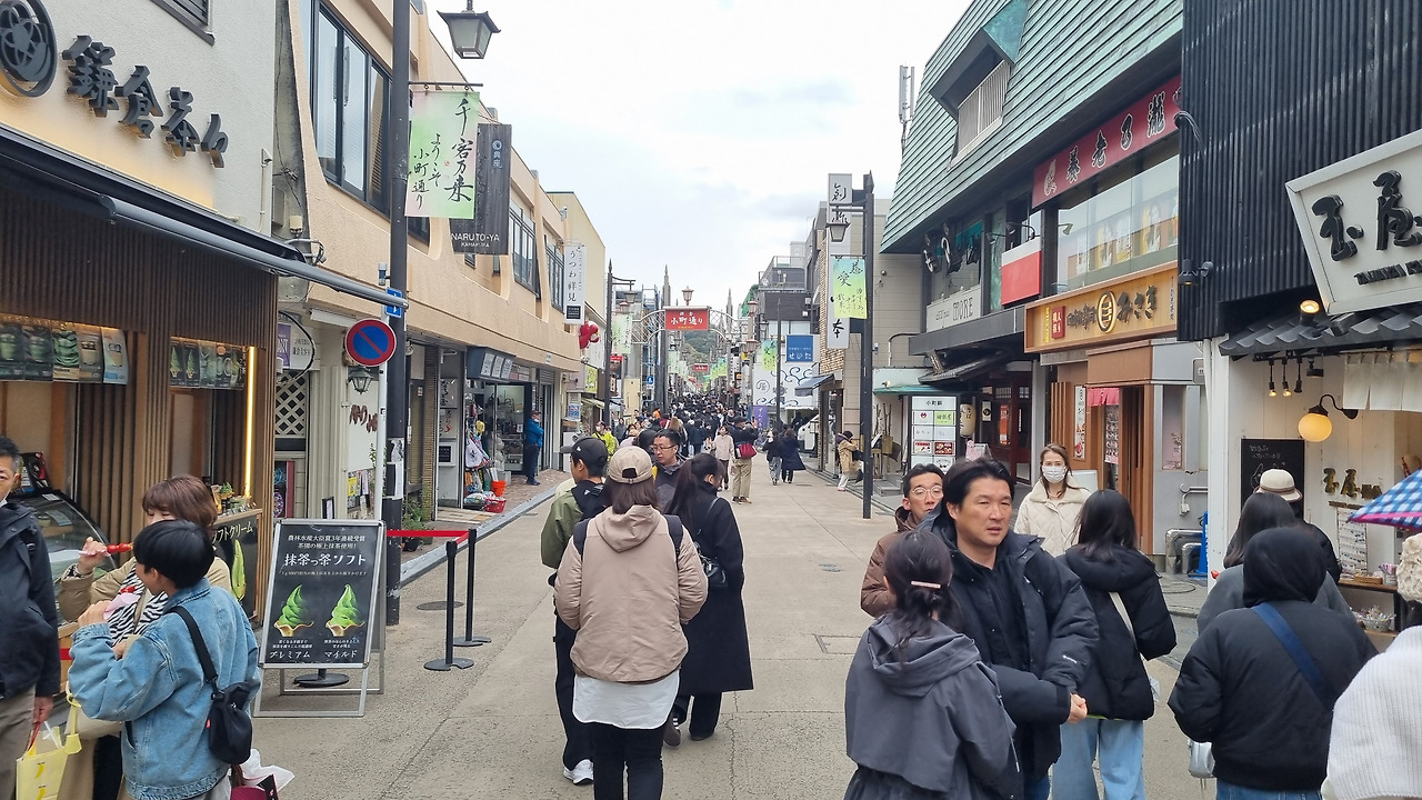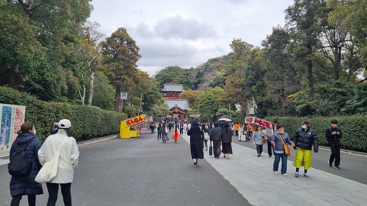 가마쿠라 역에서 내리니 평일이라 확실히 어제보다 사람이 훨씬 적다. 역 바로 근처에 가마쿠라 최고의 명소 "쓰루오카하치만궁"(鶴岡八幡宮)이 위치하고 있다. 하치만궁으로 가는 길은 작은 골목길과 넓은 길 두 개가 있다. 좁은 길에는 여러 가지 기념품 가게와 조그만 식당들, 그 외에 여러 특징 있는 가게들이 줄지어 있어 걷는 재미가 있다. 그래서 사람들은 대개 이곳을 통하여 쓰루오카하치만 궁으로 간다. 골목은 복작복작할 정도로 사람으로 넘친다.