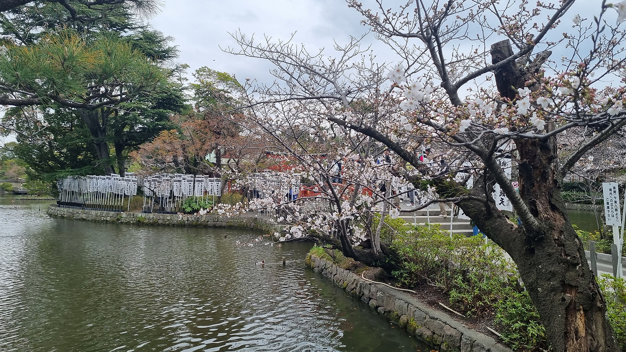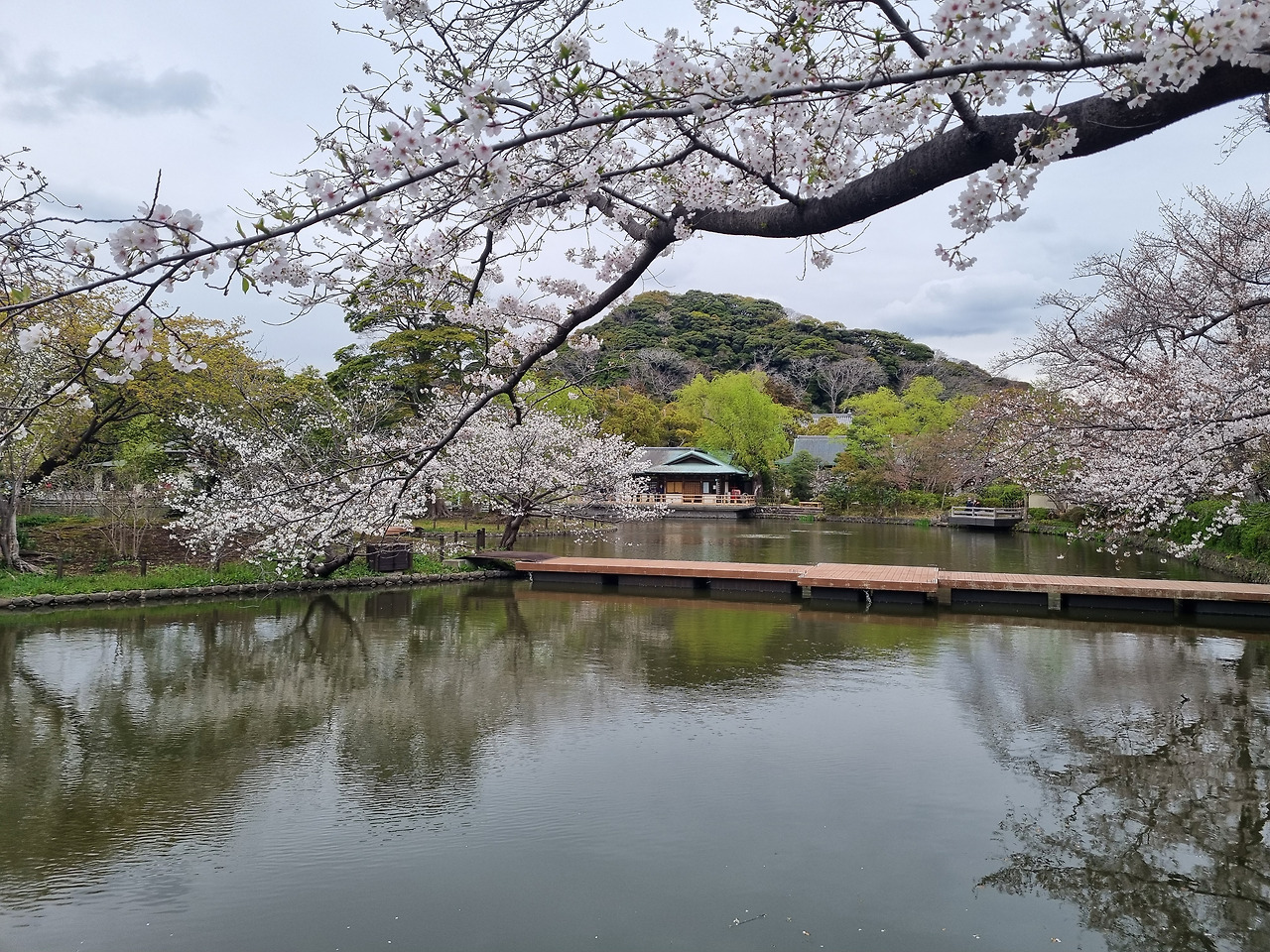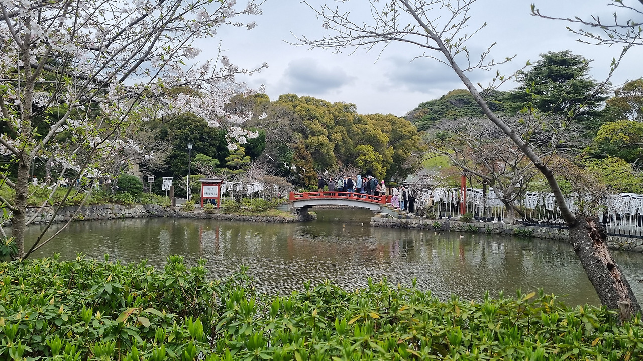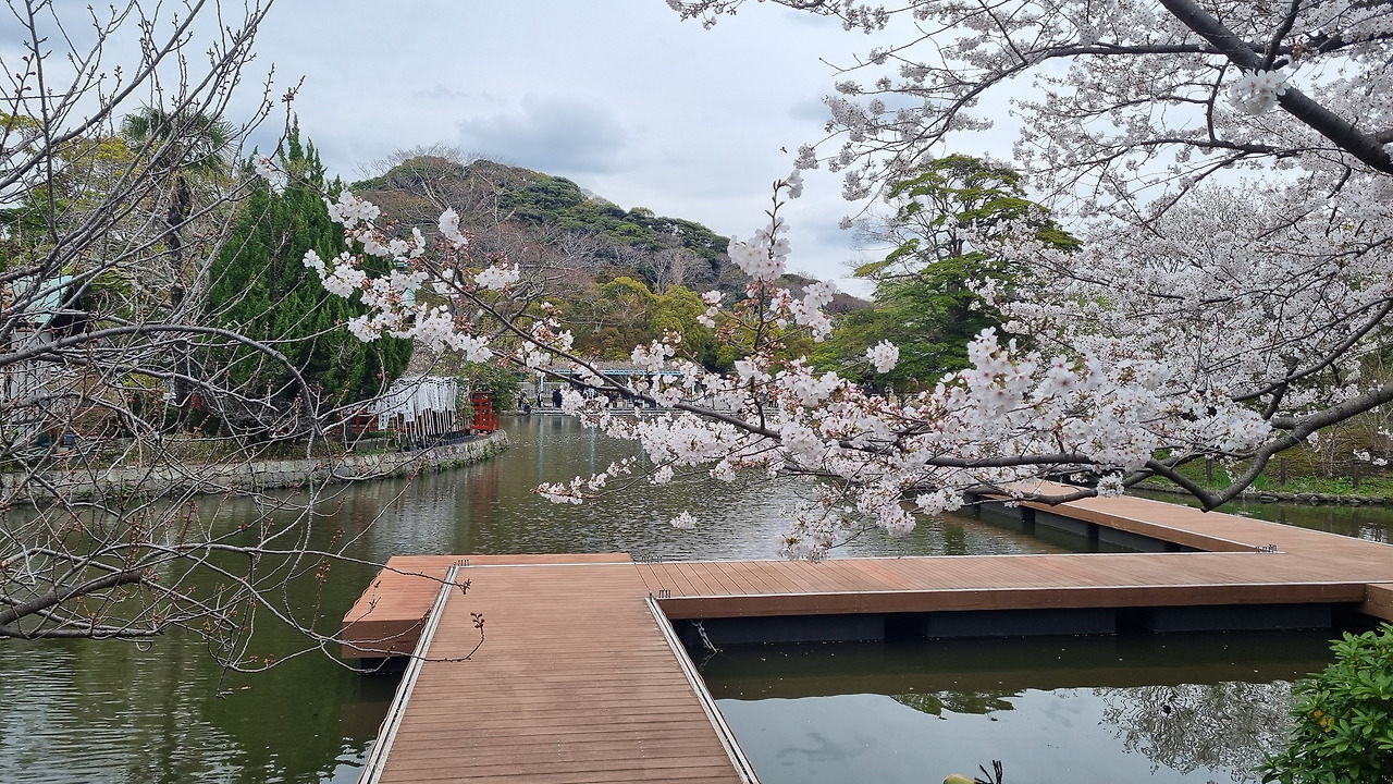 걸어서 조금 안쪽으로 들어가면 두 개로 나뉜 넓은 못이 나온다. 못 주위에는 벚꽃이 피어 정취를 더해준다. 이 못은 미나모토 요리토모의 명령으로 만들어진 것으로서 겐뻬이못(源平池)이라고 한다. 한쪽은 겐지(源氏) 못이고, 다른 한쪽은 헤이케(平家) 못이다. 자신이 멸망시킨 다이라 가문을 위해 이렇게 자신의 가문과 나란히 못을 만들어 주다니, 미나모토 요리토모는 상당히 대범하고 관대한 사람이구나라고 생각했지만, 그게 아니다.