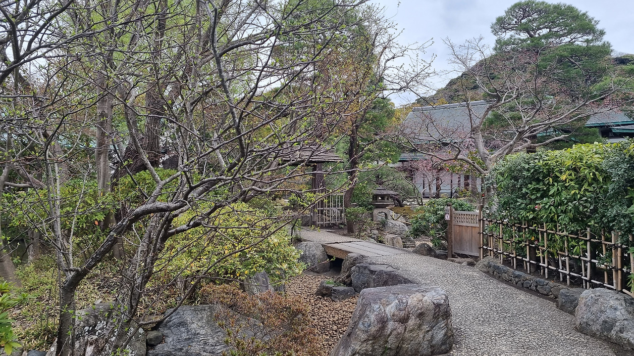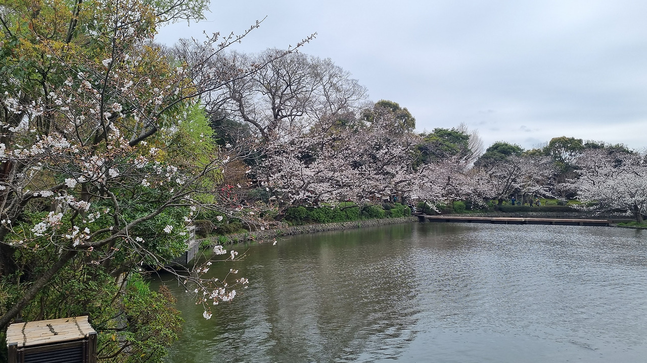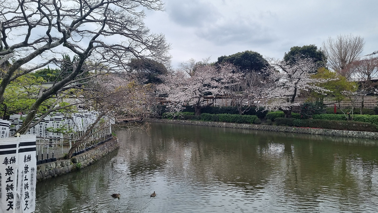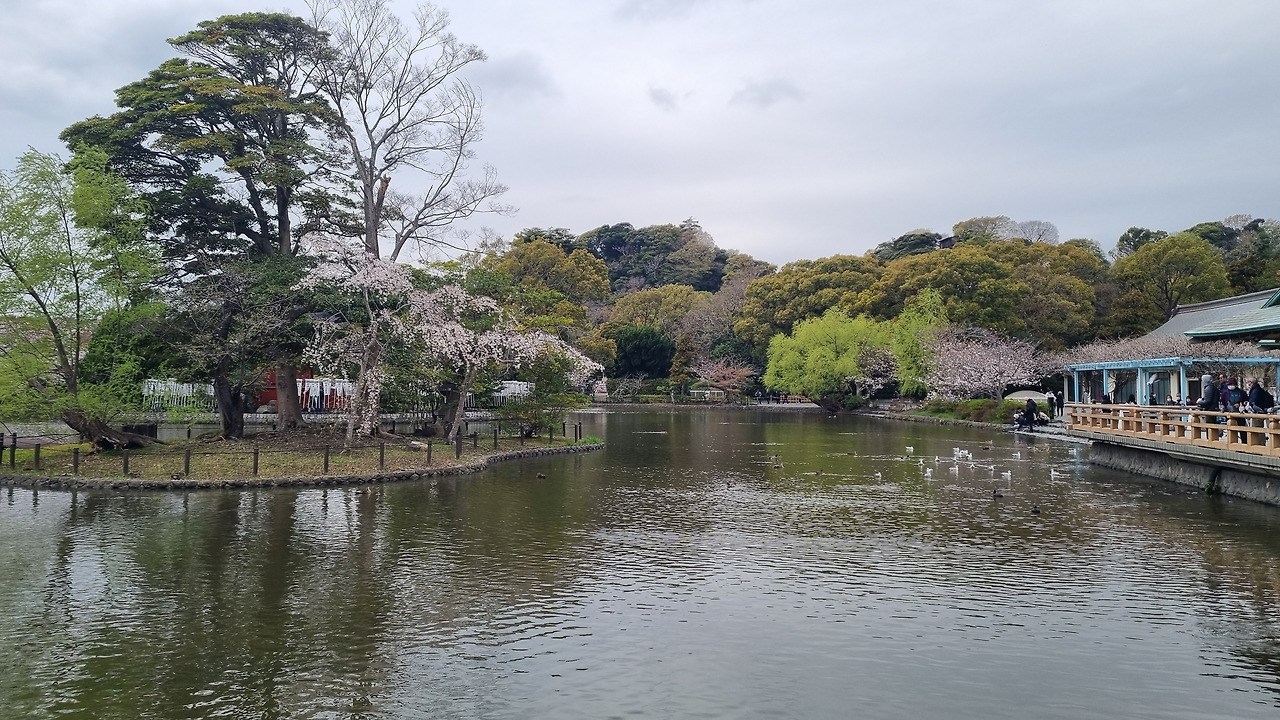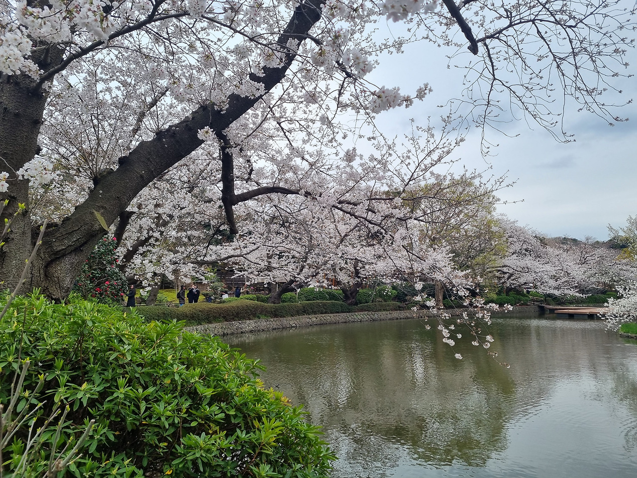 걸어서 조금 안쪽으로 들어가면 두 개로 나뉜 넓은 못이 나온다. 못 주위에는 벚꽃이 피어 정취를 더해준다. 이 못은 미나모토 요리토모의 명령으로 만들어진 것으로서 겐뻬이못(源平池)이라고 한다. 한쪽은 겐지(源氏) 못이고, 다른 한쪽은 헤이케(平家) 못이다. 자신이 멸망시킨 다이라 가문을 위해 이렇게 자신의 가문과 나란히 못을 만들어 주다니, 미나모토 요리토모는 상당히 대범하고 관대한 사람이구나라고 생각했지만, 그게 아니다.