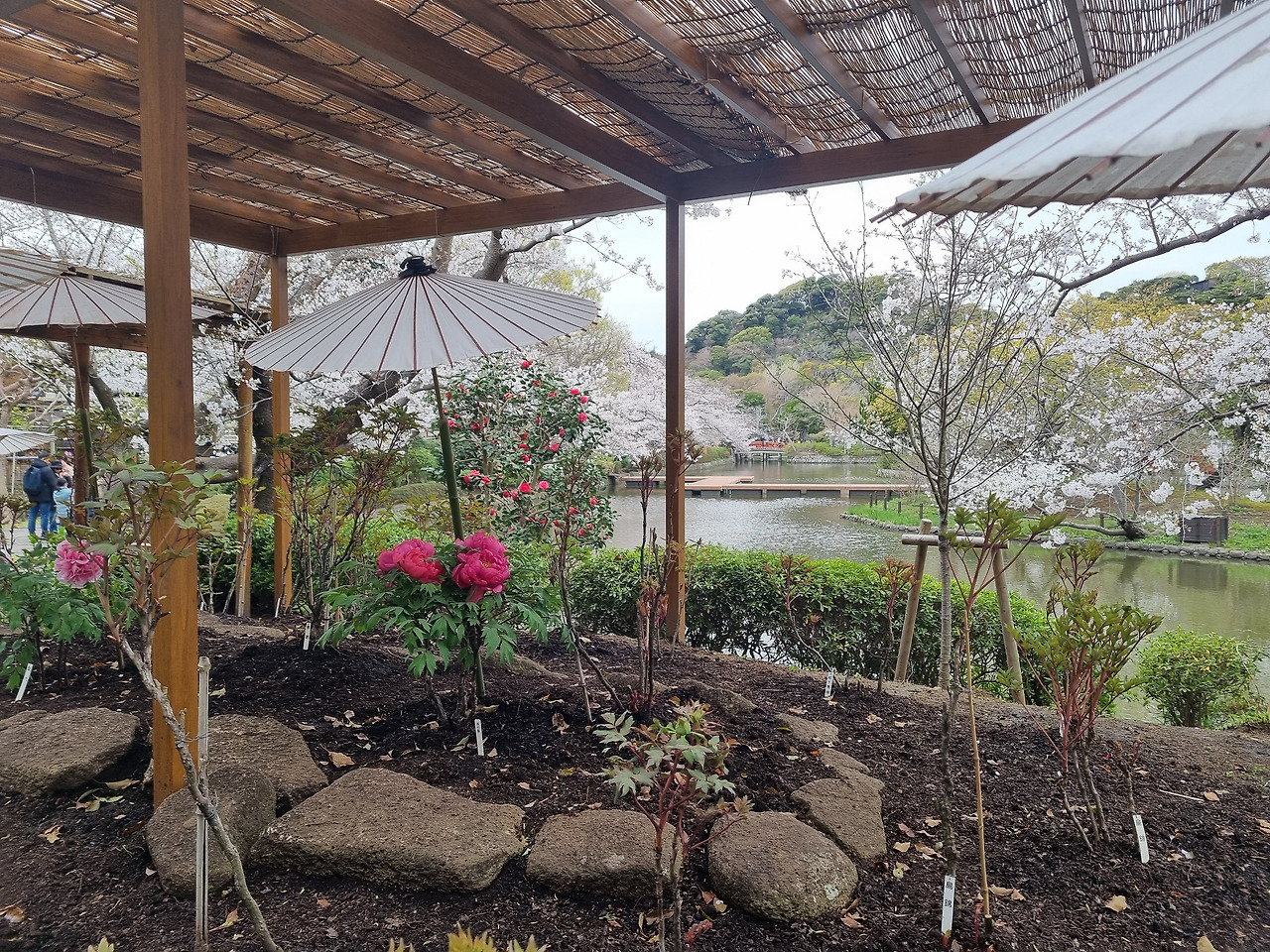 건물 옆쪽으로 가 좁은 길로 내려가니 모란정원(牡丹庭園)이 있다. 가미소노(神苑), 즉 "신의 정원"이라고도 하는 곳이다. 500엔인가 입장료를 받는데, 들어가는 사람이 거의 없다. 그래서 그냥 지나칠까 하다가 혹시 해서 들어갔다. 정원 안에는 곳곳에 벚꽃이 화려하게 피었고, 모란도 활짝 피었다. 특이하게도 모란꽃 위에는 일본 전통의 우산을 씌워두고 있다. 꽃이 큰 것은 엄청나게 크다. 우리나라에서도 가끔 모란을 보았지만 이렇게 큰 꽃은 처음이다. 과연 "화중지왕"(花中之王)이라 표현할만하다.