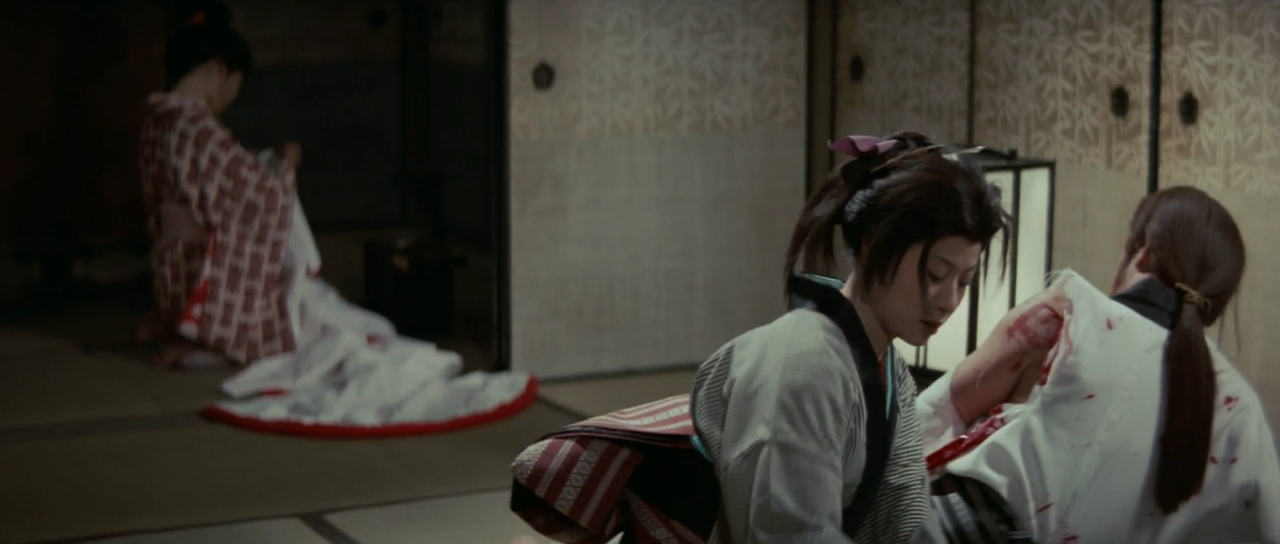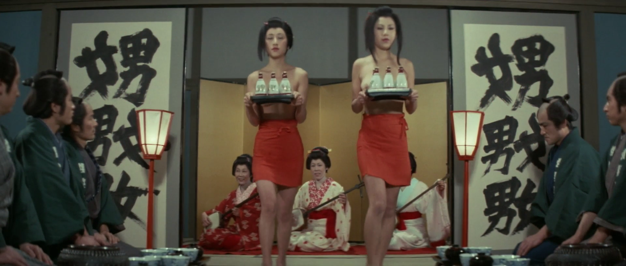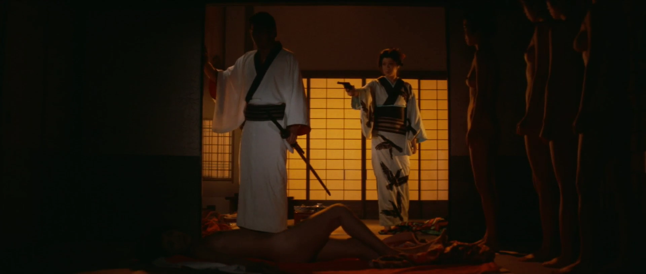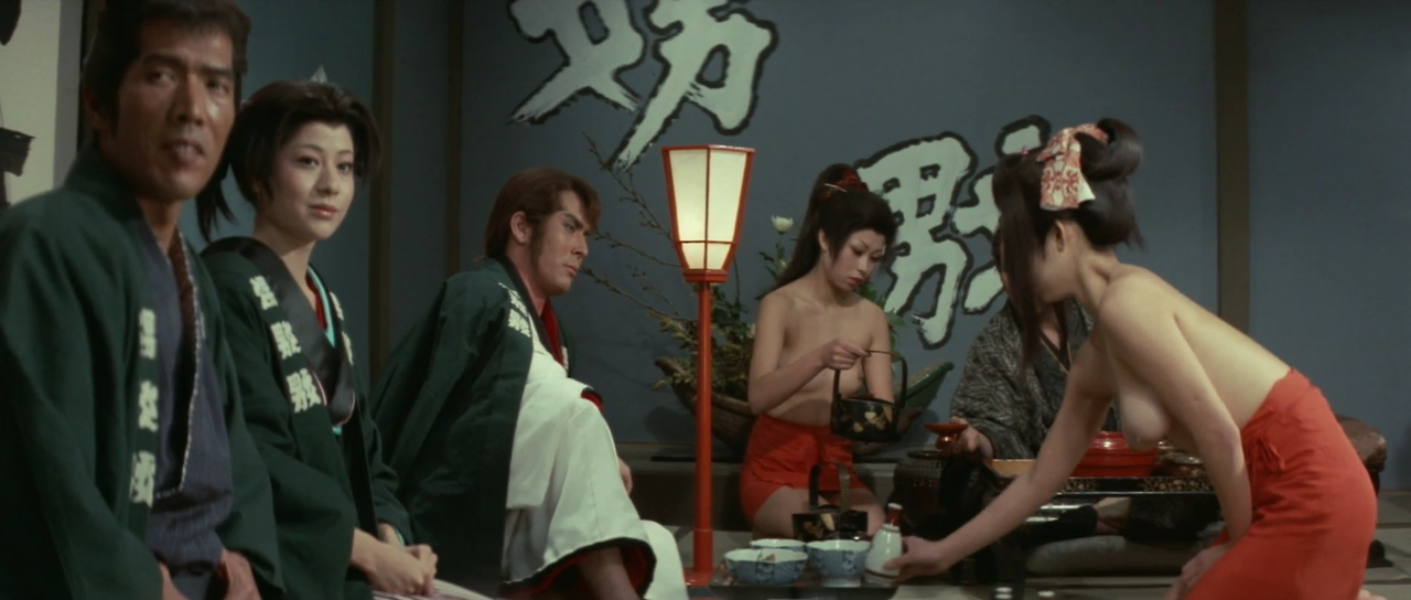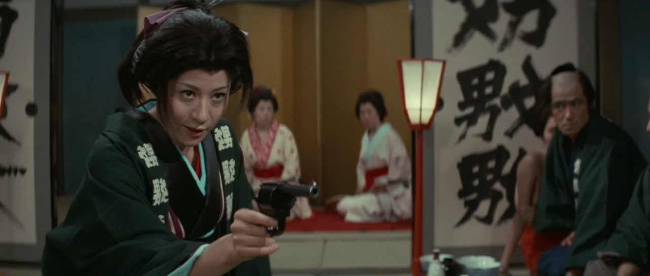다나바시는 잇쇼에게 여자들을 보내 마취약을 탄 술을 마시게 한다. 잇쇼가 술을 마시고 시노와 부둥켜안고 있을 때 총을 든 몬구마츠가 나타난다. 그녀는 잇쇼에게 총을 겨누지만 차마 방아쇠를 당기지는 못한다. 이때 중간 간부가 나타나 몬쿠마츠에게 빨리 쏘라고 재촉한다. 여전히 몬쿠마츠가 총을 쏘지 못하자, 중간 간부가 몬쿠마츠의 총을 빼앗아 몬쿠마츠를 쏘려 한다. 이때 몬쿠마츠를 사모하던 남자가 그 앞을 가로막고 대신 죽는다. 잇쇼가 반격에 나서 중간 간부와 자신에게 마취약을 탄 술을 권한 여자들을 모두 죽인다. 몬쿠마츠는 잇쇼에게 함께 도망가자고 한다. 그때 망팔의 무리들이 몰려오는데, 그 무렵 밖에서는 관헌들이 메이와쿠쵸를 공격하기 시작하였다.