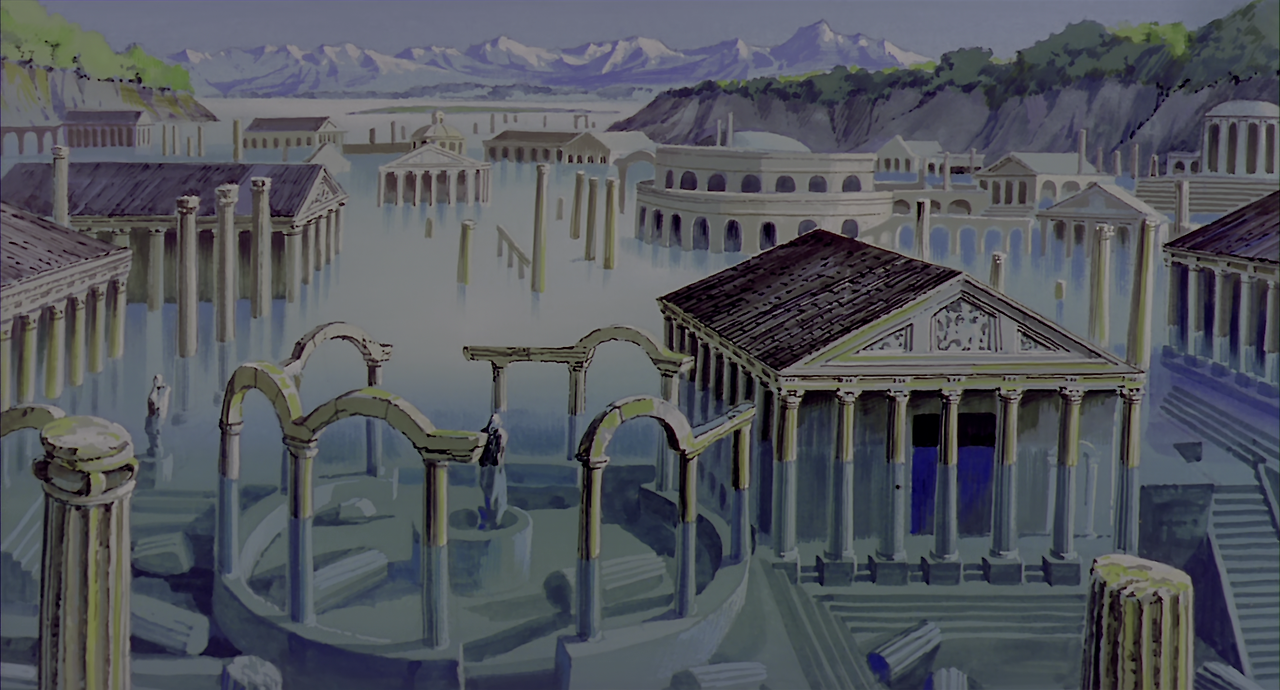 날이 밝아 무사히 호수 가로 나온 루팡과 클라리스는 호수의 바닥에 나타난 유적의 모습을 발견한다. 호수는 사실 시계탑을 수문으로 한 댐 호수로서, 보물이란 선조가 숨긴 고대 로마의 폴리스였으며, 시계탑의 장치는 담아두었던 물을 배출하여 가라앉은 유적을 드러내기 위한 장치였던 것이다. 그리고 반지는 시계탑의 기동장치였던 것이다.