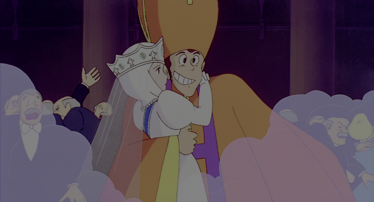 루팡은 사망한 대공 부부를 위해 일했던 정원사 노인의 치료로 목숨을 구한다. 루팡은 동료들에게 이전에 클라리스와의 사이에 있었던 일을 이야기해 준다. 그때 후지코로부터 백작의 결혼식에 참석할 대주교 일행이 오고 있다는 소식을 듣고, 루팡은 대주교로 변장하여 성으로 들어간다. 한편 제니가타 경부도 후지코로부터 루팡이 결혼식장을 습격할 것이라는 말을 듣고 다시 카리오스트로 공국으로 향한다. 후지코는 결혼식을 세계로 중계하는 TV 촬영팀의 일원으로 성안으로 들어간다.