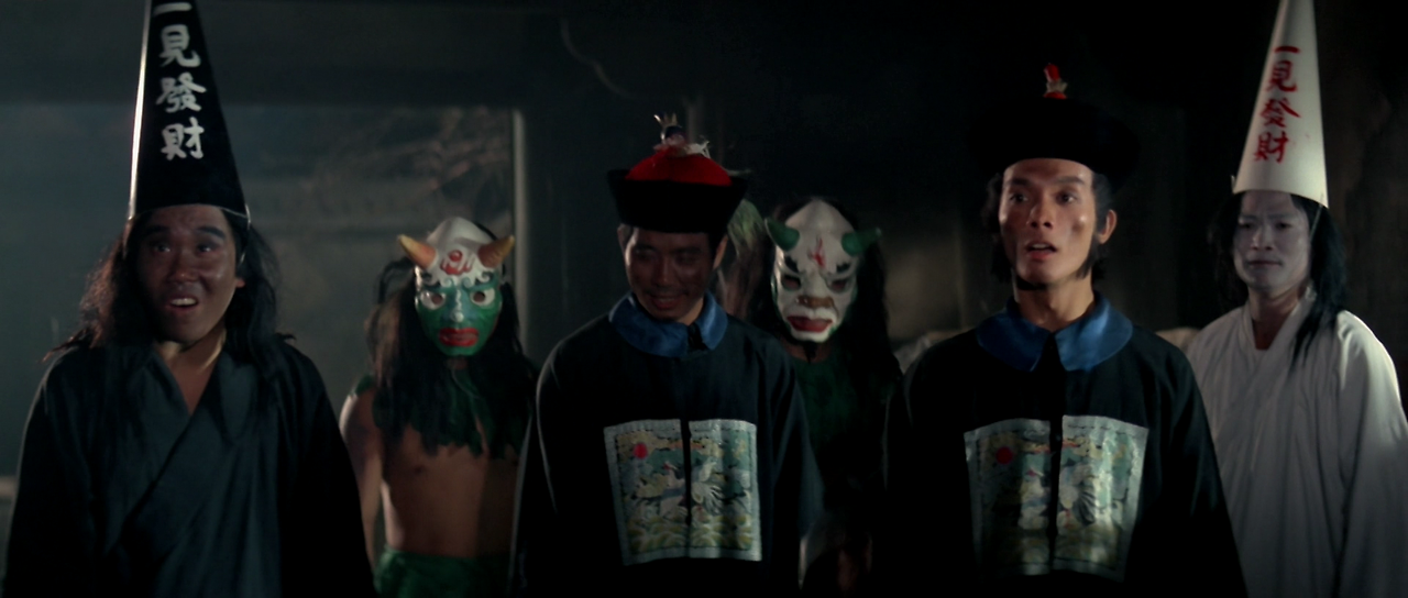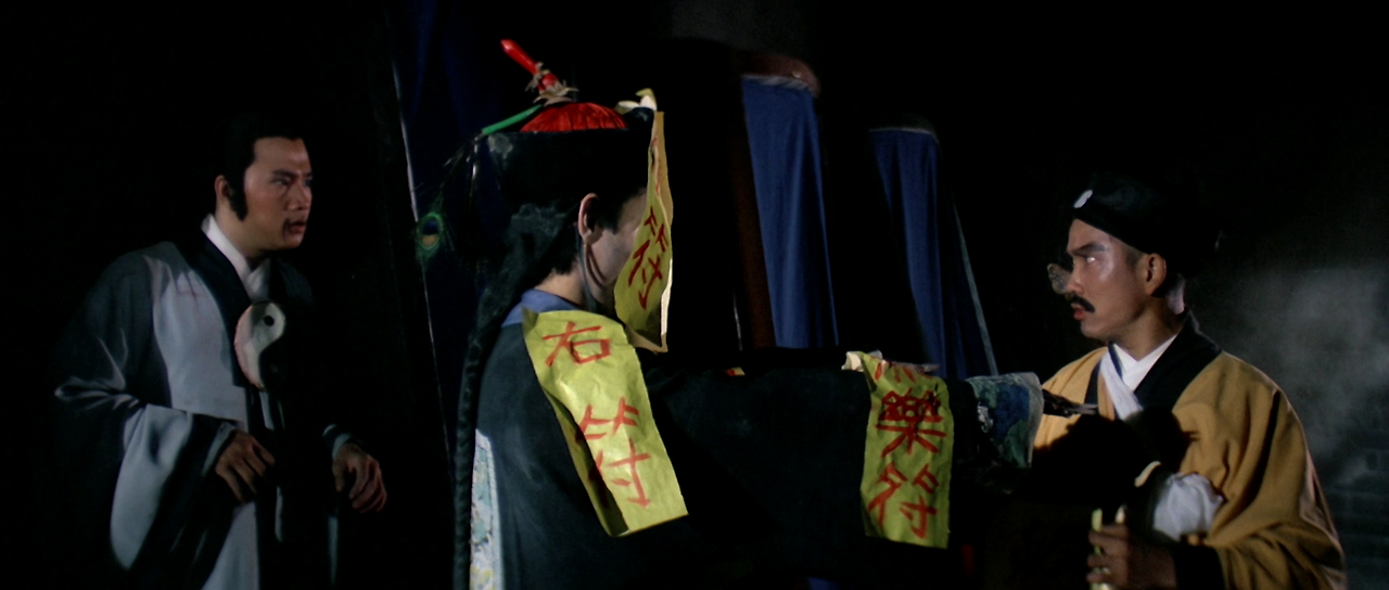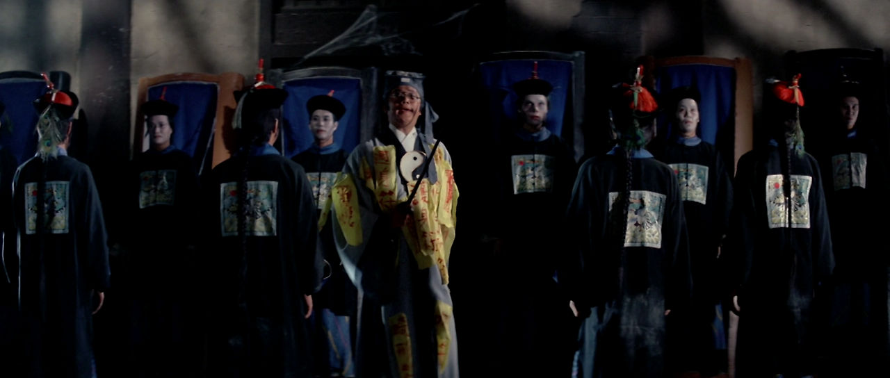 훈장은 낙일호가 이곳에 도착했다는 소식을 듣는다. 낙일호는 마을의 표국을 습격하여 모두 죽인다. 한편 하가옥과 오덕지는 담력 겨루기 내기를 한다. 오덕지의 삼촌이 죽어 시신이 영안실에 안치되어 있는데, 그 입에 들어있는 동전을 꺼내는 시합이다. 오덕지가 친구들과 함께 영안실에 들어가 관을 열고 죽은 삼촌이 물고 있는 동전을 꺼내려는데, 갑자기 시신이 그의 손을 깨문다. 이때 밖에서 인기척이 들린다. 놀란 오덕지와 친구들은 벽 쪽에 세워져 있는 관 속에 들어가 숨는다. 곧 한 도사가 강시들을 데리고 와 강시들을 벽 쪽의 관 속에 넣으려고 한다.