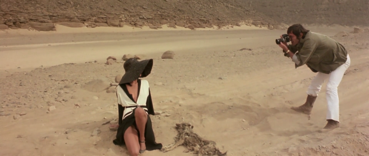 크리스털은 친구인 패션모델 로라와 그의 남편 카를로를 자신의 집으로 초대한다. 공항에 내린 로라와 카를로는 지프차를 타고 사막길을 달려 크리스털의 집으로 향한다. 카를로는 포르노 잡지의 사진작가로 일하고 있다. 그는 특이하고 엽기적인 사진을 즐겨 찍는다. 지프차가 달리는 도중 길 앞에 로드킬을 당해 죽은 개의 유기체가 보인다. 이미 죽은 지 오래되어 상당히 부패되어 뼈가 반 정도 드러났다. 카를로는 차를 세워 로라에게 죽은 개 옆에서 포즈를 취하라고 한다. 로라는 싫다고 하지만, 그가 폭력을 휘두르는 바람에 어쩔 수 없이 그녀는 죽은 개 옆에서 반라로 포즈를 취하며 사진을 찍는다.