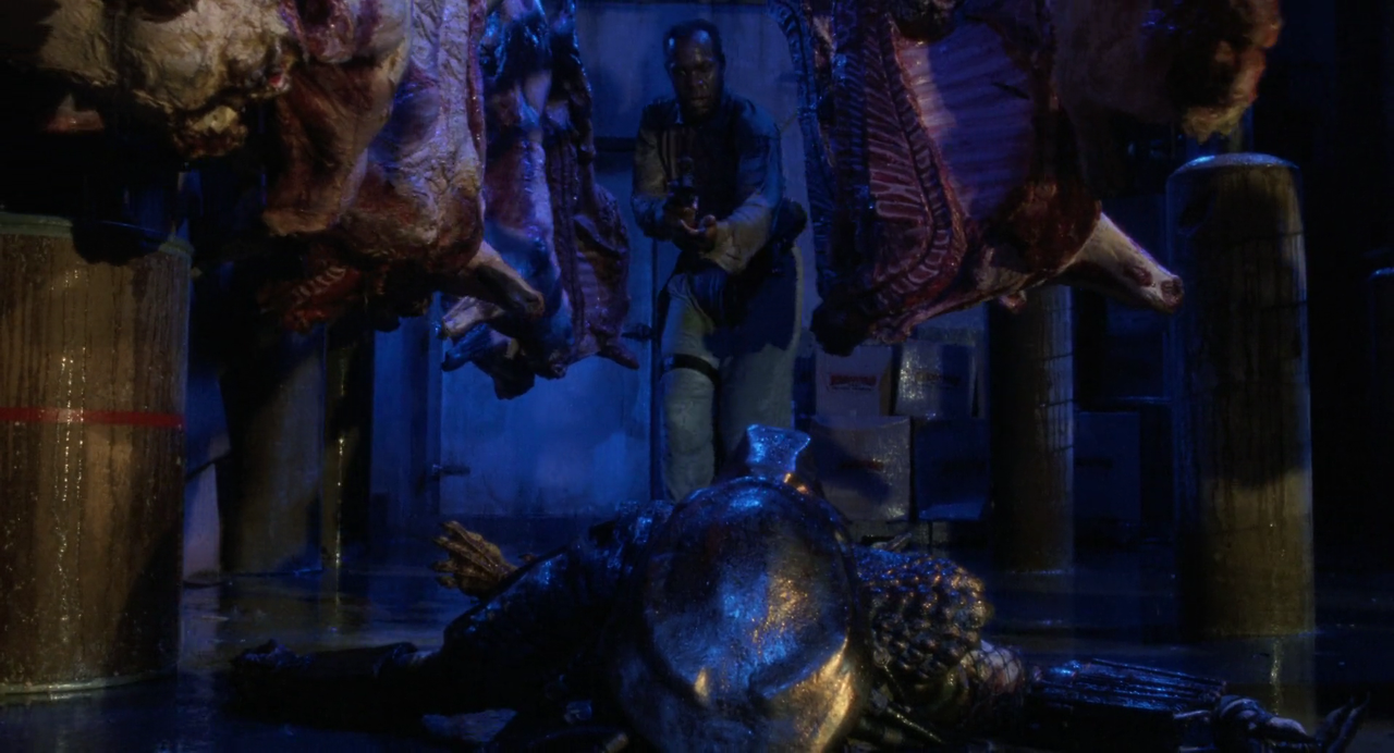 그러나 이러한 판단은 지나친 속단이었다. 프레데터는 평상시에는 적외선만을 볼 수 있었지만, 장갑옷의 특수 기능을 이용하면 자외선도 구분할 수 있었다. 키스의 특공대는 프레데터를 체포하기 위해 식육 처리장에 돌입하였으나, 프레데터의 반격을 받고 전멸한다. 해리건은 즉시 식육 처리장으로 달려가 프레데터와 맞선다.